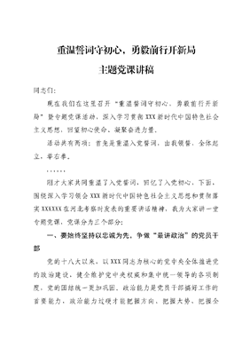 重温誓词守初心,勇毅前行开新局主题党课讲稿同志们:现在我们在这里召开重温誓词守初心,勇毅前行开新局暨专题党课活动,深入学习贯彻XXX新时代中国特色社会主义思想,回望初心使命、凝聚奋进力量。活动共有两项:首先是重温入党誓词,由我领誓,全体起立,举右拳。刚才大家共同重温了入党誓词,回忆了入党初心,下面,围绕深入学习领会XXX新时代中国特色社会主义思想和贯彻落实XXXXXX在河北考察时发表的重要讲话精神,我为大家讲一堂专题党课,党课分为三个部分:一、要始终坚持以忠诚为先,争做最讲政治的党员干部党的十八大以来,以XXX同志为核心的党中央全体推进党的政治建设,健全维护党中央权威和集中统一领导的各项制度,党的团结统一更加巩固。政治能力是党员干部搞好工作的首要能力,政治能力过硬才能把握方向、把握大势、把握全局,才能辨别政治是非、保持政治定力、防范政治风险。要在加强理论武装上作表率。要全面系统学习XXX新时代中国特色社会主义思想的主要内容,整体把握这一思想的科学体系,深入加强理论学习,坚持多思所想、学深悟透,要在坚定理想信念上作表率。坚持用XXX新时代中国特色社会主义思想分析形势、推动工作,把稳思想之舵。要在坚持学用结合上作表率。要深刻领悟XXX新时代中国特色社会主义思想的真理力量和实践伟力,坚持联系实际学,把学习党的创新理论同推动工作结合起来,同落实岗位职责、完成工作任务结合起来,通过深学细悟不断提高履职能力,提高做好各项工作的本领。二、要始终坚持以实干为要,争做最讲担当的党员干部今年是全面贯彻党的XX大精神的开局之年,也是新区展五新之年,XXXXXX在主持召开高标准高质量推进雄安新区建设座谈会上指出,要加强新区各级领导班子和干部队伍建设,提高干部人才队伍整体素质和专业化水平。要完善新区干部考核评价机制,激励广大党员干部敢担当、勇创新、善作为。全体党员干部要在对标先进中体现担当,有标杆才有动力,有信心才有勇气。要始终把争第一、创先进作为目标追求,将雄安质量作为工作标准,坚持深刻领悟党的最新理论以及XXXXXX对新时代公安工作的新理念、新思想、新战略,不断推动公安工作现代化。要锤炼政治品格,树牢宗旨意识,要敢于担当负责,发扬真抓实干、攻坚克难的精神,不断推动公安工作实现新提升。三、要始终坚持以干净为基,争做最讲纪律的党员干部XXXXXX在主持召开高标准高质量推进雄安新区建设座谈会上指出,雄安新区党工委及各级党组织要认真开展主题教育,并以此为契机,加强调查研究,推动思想大解放、能力大提升、作风大转变、工作大落实,进一步提升政治功能和组织功能。要持续纠治四风,一体推进不敢腐、不能腐、不想腐,以廉洁雄安保障雄安质量。要守住质量关。党的纪律是党组织和全体党员必须遵守的行为规则,是维护党的团结统一、完成党的任务的保证。要严明政治纪律,始终把严守政治纪律放在首位,站位政治立场,严守廉洁纪律。要守住法律关。全体党员干部要牢固树立法治思维,以XXX法治思想武装头脑,牢牢把握XXXXXX对公安工作的训词精神和四个铁一般的标准,着力锻造党和人民满意的高素质过硬公安队伍。要始终把纪律规矩挺在前面,严明纪律、严格管理、严肃追责,让纪律规矩成为标准,让标准成为习惯,营造风清气正的良好警风;下面,我结合工作实际,就深入学习XXX新时代中国特色社会主义思想,进一步提升履职尽责能力水平,再提几点意见:一是提高政治站位,切实深刻领会把握重要指示精神实质。每一位党员民辅警,切实吃透精神、把握实质、融会贯通,把思想和行动统一到XXXXXX重要讲话精神上来。聚焦发展建设大局,不断提升自身水平,以更加奋发有为的精神状态和一往无前的奋斗姿态,扎实推动各项公安工作取得新进展,努力以新安全格局保障新发展格局。二是要聚焦工作重点,切实用更好的服务保障高质量发展。要围绕区域重大战略实施,立足公安工作实际,紧扣主责主业,坚持围绕中心、服务大局,主动思考、主动谋划、主动担当,充分发挥党员先锋模范作用,筑牢支部战斗堡垒,为擦亮支部党建品牌贡献智慧与力量。三是强化落实达效,切实用实际行动提升公安核心质效。要把党课精神与实际工作有效结合围绕当前重点工作,审视工作差距,落实任务、落实责任。要纵深推进全面从严管党治警,持续锻造四个铁一般公安铁军,以廉洁雄安保障雄安质量不断提高队伍战斗力和向心力,坚决捍卫国家政治安全、全力维护社会安定、切实保障人民安宁。同志们,新时代新征程,党员干部要以革命先辈为镜,以身边先进典型为榜样,在以后的工作中展现新活力、彰显新作为,为高标准高质量推进雄安新区建设作出更大贡献!今天的党课就讲到这里,谢谢大家。