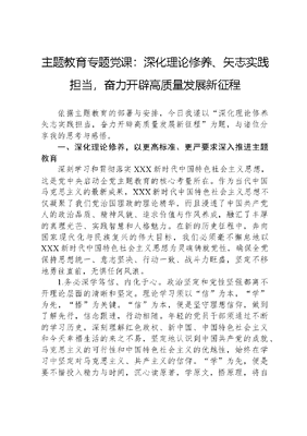 主题教育专题党课:深化理论修养、矢志实践担当,奋力开辟高质量发展新征程依据主题教育的部署与安排,今日我谨以深化理论修养矢志实践担当,奋力开辟高质量发展新征程为题,与诸位分享我的思考与感悟。一、深化理论修养,以更高标准、更严要求深入推进主题教育深刻学习和贯彻落实XXX新时代中国特色社会主义思想,这是党中央启动全党主题教育的核心考量所在。作为当代中国马克思主义的最新成果,XXX新时代中国特色社会主义思想不仅凝聚了我们党治国理政的理论精华,而且浸透了中国共产党人的政治品质、精神风貌、追求价值与作风养成,融汇了丰厚的真理光芒、实践智慧和人格魅力。在新的历史征程中,奔向国家现代化与民族复兴的伟大目标,我们必须毫不懈怠地以XXX新时代中国特色社会主义思想为灵魂铸就党性,确保全党保持思想统一、意志坚决、行动一致、战斗力旺盛,坚定不移地勇往直前,无惧任何风浪。1.务必深学笃信、内化于心。政治坚定和党性坚强都离不开理论层面的清晰和坚定。理论学习须以信为本,学为先,悟为关键。信为本,便是坚守理想信仰,做到了解先行,信念跟进,行动相随。年轻的党员干部须通过不断的学习历史,深刻理解红色政权、新中国、中国特色社会主义和今天幸福生活的来之不易,坚定地认识到中国共产党的成就、马克思主义的可行性和中国特色社会主义的优越性,始终在学习中坚定对马克思主义、共产主义的信仰。学为先,便是要不惜投入精力与时间,沉心读原著,学原文,悟原理,将自我、职责、工作融入其中,细致感悟,反复琢磨,深刻领悟党的重大理论成果,系统掌握其蕴含的马克思主义立场、观点、方法,不断提升对党创新理论的认同,坚决摒弃肤浅学习的态度,确保理论学习深入人心。悟为关键,便是要洞察现象之下的本质,运用所学知识武装思想,在思考、决策、执行时保持敏锐、明晰、迅捷。不断的学习深化对党光辉历程的感悟,牢记党的丰功伟绩,执着于两个大局,明确国之重大,并利用历史思维、战略思维、辩证思维、底线思维来分析形势、把握大势,时刻铭记初心使命,勇于承担责任,善于克服困难,自觉肩负起党和人民交付的时代重任。2.矢志实践担当,持续积淀,为功不懈。理论学习无法依靠捷径,必须致力于真功夫、苦功夫、细功夫。党的创新理论并非孤立、零散、片面的观点,而是主题鲜明、逻辑严密、体系完整的科学理论体系。年轻的党员干部在学习理论时须全面、系统、深入地学习,做到真学真懂、真信真用。要将学习马克思主义基本原理贯通其中,全面领会党的创新理论的深层含义与核心要义,深刻感悟其背后的坚定信仰追求、历史责任感、为民质朴情怀和务实理念作风,以此来指导和推进各项事业的发展。当前,我们正站在百年未有之大变局和中华民族伟大复兴的历史交汇点,思想认识问题与现实利益问题交织,历史积累问题与新出现问题叠加,问题无法回避,也不能逃避。年轻干部须以问题为导向进行学习,带着问题进行思考,明确原因、针对性施策,将学习转化为分析、解决问题的真正能力,实现以学促行、知行合一的境界。3.贯彻学以致用、学用融通的原则。学习理论的目标旨在其应用,是为了更好地迈向未来。要将学习成果显现在实际才干的提升上,严格遵循严谨周密、实事求是、迅速行动的原则展开工作。要熟练掌握专业知识,对于所在职责涵盖的业务内容需做到清晰的基本框架、了解详实的实际情况。要加强实践锻炼,面对困难不退缩,勇于挑战,通过处理重大、紧急、困难事项接受多元化磨砺,做到在任何情况下都能泰然处之。要坚持底线思维,增强危机意识和风险意识,始终保持警惕,对大事和重点事情始终保持紧张态势,主动应对,随时准备应对各种风险挑战。要将学习成果体现在为民服务上,以人民群众的支持与否、赞同与否、满意与否作为衡量工作得失的基础标准,始终做到顺应民心、尊重民意、关注民情、致力民生。要强化公仆意识和为民情怀,结合展开对接帮扶部门报到等实践活动,从最困难的群众开始、从最突出的问题着手、从最实际的利益出发,切实解决基层的困扰事、群众的难题,不断满足人民群众日益增长的美好生活需要。二、磨砺前行,以更广视野、更实作为推进高质量发展领跑当前及未来一段时间,扎实推进主题教育意义重大,属于关键的政治责任。实践是学习的真谛。理论学习的终极目标是装备思想、指引行动、促进工作。党员干部群体应深化对XXX新时代中国特色社会主义思想的学习与贯彻,紧密围绕推动高质量发展这一建设社会主义现代化国家的核心任务,强化理论指导实践,将所获得的学习热情和工作动力转化为克难攻坚、创新创业的有力驱动,以实现高质量发展的新业绩来检验主题教育的实效。1.激发拼搏创业的勃勃生机。XXXXXX明确指出:社会主义是拼搏出来、干出来、用命换来的,昔日如是,今日亦然。生机活力是党员干部拼搏创业的泉源,是精神风貌的重要体现,更是党员干部作风与形象的集中