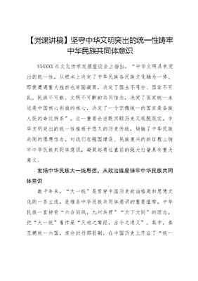 【党课讲稿】坚守中华文明突出的统一性铸牢中华民族共同体意识XXXXXX在文化传承发展座谈会上指出,中华文明具有突出的统一性,从根本上决定了中华民族各民族文化融为一体、即使遭遇重大挫折也牢固凝聚,决定了国土不可分、国家不可乱、民族不可散、文明不可断的共同信念,决定了国家统一永远是中国核心利益的核心,决定了一个坚强统一的国家是各族人民的命运所系。这一重要论述既回顾历史又观照现实。中华文明突出的统一性植根于悠久的历史传统,铸就了中华民族共同的理想信念,对我们在强国建设、民族复兴的新征程上铸牢中华民族共同体意识,凝聚起勇往直前的强大力量具有重大意义。发扬中华民族大一统思想,从政治维度铸牢中华民族共同体意识数千年来,大一统是贯穿中国历史政治格局和思想文化的一条主线,是维系中华民族共同体意识的重要纽带。中华民族一直持有六合同风,九州共贯天下大同的理念,把大一统看作是天地之常经,古今之通义。其中,秦王朝统一六国,废分封行郡县制,在中国历史上开启了统一性政治理念的实践和制度化,建立了多民族统一国家,逐步形成大一统的政治共同体。大一统的历史实践充分证明,共同体意识的形成与牢固需要树立一个强有力的领导核心,要从经济、政治、思想、文化等多维度发力实现真正的一统。新时代铸牢中华民族共同体意识,必须把坚持党的领导贯穿到民族工作的全过程。当前,中华民族伟大复兴战略全局和世界百年未有之大变局两个大局相互交织、相互激荡、相互影响,给我国既带来重大战略机遇,也带来严峻风险挑战。中国共产党始终把维护国家统一视为核心利益,带领各族人民坚决反分裂、反干涉,将全体中华儿女的共同意志凝聚成维护国家统一的强大力量。凝聚各民族共同历史记忆,从文化维度铸牢中华民族共同体意识历史不仅是记忆,更是文化的传承。各民族共同历史记忆对增强历史自觉、坚定文化自信,提升中华民族凝聚力和向心力,发挥着重要支撑和价值共振作用。XXXXXX强调,我们伟大的祖国,幅员辽阔,文明悠久。一部中国史,就是一部各民族交融汇聚成多元一体中华民族的历史,就是各民族共同缔造、发展、巩固统一的伟大祖国的历史。中华民族始终以统一为主流,中华文明也始终以统一为正轨,炎黄子孙这一共同文可居文库——海量学习资料,手机电脑均可下载www.wenkeju.com的历史起源使中华民族结合成紧密的整体。从秦汉雄风到大唐气象,再到康乾盛世,都是各民族共同铸就的历史。近代以后,面对西方列强的侵略,各民族同胞共御外敌、同赴国难的历史记忆得到全面巩固,抗日战争使得中华民族意识空前增强。进入新时代,中华民族迎来历史上最好的发展时期,经济快速发展与社会长期稳定的历史奇迹成为各民族最深刻的记忆。共同记忆记载着中华民族的历史流变,是中华民族根基性情感联系,体现了国家主流意识形态,强化了各民族对中华文明的归属感。中华民族共同体是各民族在共同创造历史过程中形成的休戚与共、荣辱与共、生死与共、命运与共的共同体。要深入挖掘各民族共同历史记忆,诠释好中华民族共同体的历史内涵,实现历史文化的统一性表达、大众化表述、创新性传播,激发各族儿女对共同历史记忆的认同,实现历史记忆与优秀文化的传承,在润物无声中铸牢中华民族共同体意识。推进各民族实现共同富裕,从经济维度铸牢中华民族共同体意识经济基础决定上层建筑,中华文明的统一性,源自各民族文化上的兼收并蓄、经济上的相互依存。历史上,我国既有农业民族,也有畜牧民族、渔猎民族等。各民族依托各具特色的生产生活方式,彼此交流互补,逐渐形成了你中有我、我中有文可居文库——海量学习资料,手机电脑均可下载www.wenkeju.com你的多元统一体。党的十八大以来,民族地区发展日新月异,各族人民心手相牵,团结奋进,历史性地解决了绝对贫困问题,全面建成了小康社会,正致力于在高质量发展中实现共同富裕,向全面建成社会主义现代化强国的目标迈进。共同富裕是全体人民共同富裕,是一个民族都不能少的富裕。共同富裕作为铸牢中华民族共同体意识的具体实践,既反映了各族群众物质生活改善的程度,也体现了各族群众精神生活充实的内涵。因此,推进民族地区实现共同富裕,是铸牢中华民族共同体意识的重要举措。新征程上,要加快少数民族和民族地区发展,更好解决发展不平衡不充分问题,让改革发展成果更多更公平惠及各族人民。把推动各民族共同走向现代化作为新时代民族工作的战略任务,完善差别化区域支持政策,提升西部经济发展速度,以均衡发展推动民族地区现代化进程。民族地区要立足资源禀赋、发展条件、比较优势等实际,找准实现高质量发展、促进共同富裕的切入点和发力点。文可居文库——海量学习资料,手机电脑均可下载www.wenkeju.com