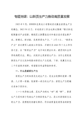 专题党课:以新质生产力推动高质量发展2023年9月,XXXXXX在黑龙江考察时首次提出新质生产力的概念。2023年12月,中央经济工作会议再次强调要以科技创新推动产业创新,特别是以颠覆性技术和前沿技术催生新产业、新模式、新动能,发展新质生产力。3月5日,新质生产力首次被写入政府工作报告,并被列为2024年十大工作任务之首。自新质生产力这个词汇提出以来,就受到社会各界的高度关注。那么,到底什么是新质生产力,为什么要发展新质生产力以及如何推动新质生产力发展,下面,我重点从这三个方面展开剖析,希望提供有益借鉴和参考。一、什么是新质生产力新质生产力的本质是先进生产力,是充分发挥科技第一要素、人才第一资源、创新第一动力的生产力,新质生产力逻辑关系如下图所示。(一)从字面上看,是生产力的从旧到新。新质生产力是有别于传统生产力的新型生产力,是以科技创新为主的生产力,是摆脱传统增长路径、符合高质量发展要求的新型生产力。这是0到1、从无到有的,对世界有新理解的重大发现。比如量子科学、脑科学的研究,可能会将人类对世界的认知、对自身的认知往前推进一大步。(二)从本质上看,是新技术的从生到熟。新质生产力是高质量发展观。结合互联网、区块链、大数据、云计算等新技术,在原理、路径等方面完全不同于现有的技术路线,却能够对原有工艺、技术方案进行替代的制造技术,为稳定群体就业、提升生活品质、改变生产方式作出更大贡献。比如未来的生物制造,通过生物反应器的方式制造人类需要的各种蛋白、食品、材料、能源等。(三)从关键上看,是人才观的从小到大。新质生产力是优质人才观。实现创新驱动发展,关键要靠人,特别是要抓住人才这个第一资源。从银川举办中国算力大会,到天津组织全国第二届职业大赛,从数万名科学家和工程师构成的华为研发团队,到无数90后青年科学家奋战在各领域科研一线,无不彰显着人才的力量。文可居文库——海量学习资料,手机电脑均可下载www.wenkeju.com(四)从配置上看,是全要素的从分到合。新质生产力的形成过程实质上是科技、金融、人才、数据、信息等一系列重要生产要素重新组合的过程。在这一过程中,要素组合方式发生变化,要素配置效率明显提升,全要素生产率不断提高,生产力发展水平发生由低级到高级的突破性变化,带动产出效益、生产水平和产业结构、经济结构实现质的跃升。(五)从理念上看,是生态观的从放到收。绿色发展是生态文明建设的必然要求,也是新质生产力的重要内容。与传统生产力忽视对自然的尊重和保护不同,新质生产力由通晓绿色科技、具有生态文明理念的劳动者,以清洁生产的机器化体系为主要内容的劳动资料,以绿色原材料为主要内容的劳动对象等组成,具有明显的生态属性,是兼顾发展与保护、重视生态平衡的绿色生产力,是绿色理念得到普及、生态价值充分实现、人与自然更加和谐、运行机制更加完善、更加注重系统发展观念和可持续发展的环境友好的生产力。(六)从整体上看,是参与者的从单打到抱团。新质生产力是统筹协同力。加快形成新质生产力是一项系统文可居文库——海量学习资料,手机电脑均可下载www.wenkeju.com性、整体性、全局性大工程,需要政府相关部门到市场各类主体、再到基础配套产业链,涉及领域广、战线长、覆盖面广。比如,河北滦州市依托当地雄厚的管材产业基础,就实现了装备制造工业园区向装备制造产业集群的转变;为了提升佛山家居产业的整体竞争力和品牌知名度,成立了佛山家居产业联盟,塑造了有家就有佛山造家居产业IP。二、为什么要发展新质生产力(一)经济转型发展的主要引擎,亟须向新质生产力转换。XXXXXX为什么在这个时间点上提出新质生产力?有些人可能觉得是地缘政治的紧张所致,尤其是美国对中国前沿技术的限制和打压起到了催化作用,其实并非全然如此。从学术视角来看,地缘政治的变化只是外因,发挥主导作用的还是内因,也就是中国自身经济转型升级的内在要求。例如,我们的对外贸易存在结构与世界不同步的问题,特别是对外的服务贸易,我们国家服务贸易出口一半以上是低附加值的生活性服务业,进口的基本上都是高附加值的生产性服务业。数据显示,2023年,美国生产性服务业占GDP比重约为50%,欧盟约文可居文库——海量学习资料,手机电脑均可下载www.wenkeju.com占40%,我们国家生产性服务业占GDP比重为17%-18%,和欧美差距巨大。从这个意义上来讲,培育新质生产力就是要把跟制造业强相关的高附加值的生产性服务业增加值搞上去。(二)创新驱动发展的重中之重,亟须向新质生产力转移。XXX2023年9月在黑龙江考察时强调,要整合科技创新资源,引领发展战略性新兴产业和未来产业,加快形成新质生产力。新质生产力最大特点就