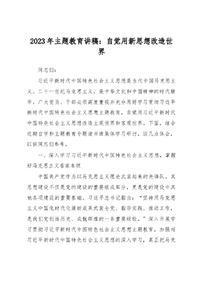 2023年主题教育讲稿:自觉用新思想改造世界同志们:习近平新时代中国特色社会主义思想是当代中国马克思主义、二十一世纪马克思主义,是中华文化和中国精神的时代精华。广大党员、干部必须高度重视并充分用好学习贯彻习近平新时代中国特色社会主义思想主题教育,自觉用习近平新时代中国特色社会主义思想改造主观世界和客观世界。下面,结合近期自学和主题教育专题读书班集体学习研讨,谈几点体会,以供同志们参考。一、深入学习习近平新时代中国特色社会主义思想,掌握好马克思主义看家本领中国共产党作为以马克思主义理论武装起来的先锋队,其思想建设不仅是党的建设的重要组成部分,更是党的建设中其他各项建设的重要基础。习近平总书记指出:坚持用马克思主义中国化时代化最新成果武装全党、指导实践、推动工作,是我们党创造历史、成就辉煌的一条重要经验。深入开展学习贯彻习近平新时代中国特色社会主义思想主题教育,加强对习近平新时代中国特色社会主义思想的深入学习,真正把马克思主义看家本领学到手,强化好理论武装,既是主题教育的基本目的,也是确保主题教育取得实效的前提、基础和保障。学习习近平新时代中国特色社会主义思想必须做到全面、系统、深入。习近平新时代中国特色社会主义思想从理论与实践的结合上深刻回答了新时代我们要坚持和发展什么样的中国特色社会主义、怎样坚持和发展中国特色社会主义,建设什么样的社会主义现代化强国、怎样建设社会主义现代化强国,建设什么样的长期执政的马克思主义政党、怎样建设长期执政的马克思主义政党等重大时代课题,其主要内容涵盖改革发展稳定、内政外交国防、治党治国治军等方方面面,是一个完整科学的思想体系。党员、干部必须全面系统深入把握这一科学思想的核心要义、精神实质、丰富内涵、实践要求,同时要将习近平总书记对各领域提出的新理念新思想新战略,对各方面工作提出的具体实践要求,放在整个科学体系中加以认识和把握,做到一体学习、融会贯通,不断增进政治认同、思想认同、理论认同和情感认同。学习习近平新时代中国特色社会主义思想必须坚持读原著学原文、悟原理。学习理论最有效的方法就是读原著、学原文、悟原理。党员、干部在主题教育中,必须认真研读党的XX大报告和党章,认真学习《习近平谈治国理政》(1-4卷)、《习近平著作选读》、《习近平新时代中国特色社会主义思想专题摘编》、《论党的自我革命》、《习近平新时代中国特色社会主义思想学习纲要(2023年版)》等,在全面系统认真读和学的基础上,带着具体问题、联系工作实际把习近平新时代中国特色社会主义思想研深悟透,特别是精准把握其理论精髓。学习习近平新时代中国特色社会主义思想必须全面准确把握这一科学思想的世界观和方法论,坚持好、运用好贯穿其中的立场观点方法。真正做到既知其然又知其所以然,通过深刻领会党的创新理论的道理学理哲理不断提高马克思主义理论水平、政策水平。在主题教育中,党员、干部必须坚持自信自强,坚定不移坚持党的全面领导,坚定不移走中国特色社会主义道路,坚定不移走好中国式现代化道路;坚持守正创新,坚持党的创新理论,在用党的创新理论指导实践过程中不断创新和发展理论;坚持问题导向,善于发现问题、分析问题、解决问题;坚持系统观念,围绕中心、服务大局,自觉把本地区、本领域、本部门工作放到党和国家工作全局和大局中思考谋划,统筹推进经济社会发展各项工作;坚持胸怀天下,强化天下意识,牢记国之大者,树立全球视野,在世界百年未有之大变局中,抢抓先机、赢得主动。学习习近平新时代中国特色社会主义思想必须坚持理论联系实际的马克思主义优良学风。新时代新征程上,学习习近平新时代中国特色社会主义思想的目的在于统一思想、凝聚共识、增进团结,指导实践、推动工作、促进发展。党员、干部必须坚持知行合一、学以致用,紧密联系自己的工作实际、生活实际、学习实际,立足岗位,明确学习方向、突出学习重点、讲求学习实效,推动学习往深里走、往实里走、往心里走,切实做到真学、真懂、真信、真用,自觉做到学思用贯通、知信行统一,把学习成效转化为增强觉悟、提高本领、做好本职工作、推动事业发展的生动实践,确保学习取得实际成效。二、以习近平新时代中国特色社会主义思想自觉改造主观世界,以学铸魂强党性理论上的成熟是政治上成熟的基础,政治上的坚定源于理论上的清醒。广大党员、干部应通过主题教育,进一步经受思想淬炼、精神洗礼,坚定理想信念,提高政治站位,不断强化党员意识和党性觉悟,进而不断筑牢信仰之基、补足精神之钙、把稳思想之舵。坚定理想信念,筑牢信仰之基。习近平总书记指出:坚定的理想信念,永远是激励我们奋勇向前、克难制胜不竭的力量源泉。我们党就是靠坚定的理想信念,团结率领全国各族人民披荆斩棘,斩关夺隘,英勇牺牲,攻克了革命、建设、改革历程中的一个个娄山关、腊子口,从胜利走向新的更大胜利。习近平新时代中国特