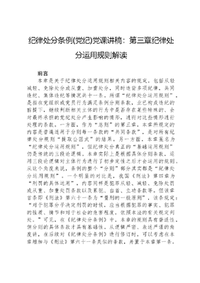 纪律处分条例(党纪)党课讲稿:第三章纪律处分运用规则解读前言本章是关于纪律处分运用规则相关内容的规定,包括从轻减轻、免除处分或从重、加重处分,同时违背多项纪律,共同违纪、集体违纪等情况共十一条。所谓纪律处分运用规则,是指在党组织或党员行为满足条例分则条款,业已构成违纪的前提下,继续判断相关主体的行为中是否存在某些特殊的、会对最终承担的党纪处分产生影响的情形,进而对这些情形进行处理的条款。一方面,作为总则的第三章,本章所规定的内容是普遍适用于分则每一条款的共同条款,是对所有纪律处分规则提取公因式的结果。另一方面,本章虽名为纪律处分运用规则,但纪律处分真正的基础运用规则仍是传统的三段论逻辑。本章实际上是根据具体分则条款,运用三段论逻辑对主体行为进行了初步定性之后才会运用的规则。从这个角度来说,条例的整个分则部分其实都是纪律处分运用规则。一个明显的对比是,我国《刑法》第四章为刑罚的具体运用,内容同样是犯罪从轻、减轻、免除处罚或从重、加重处罚条款以及累犯、自首、立功条款等。但该章首条即《刑法》第六十一条为量刑的一般原则,该条规定:对于犯罪分子决定刑罚的时候,应当根据犯罪的事实、犯罪的性质、情节和对于社会的危害程度,依照本法的有关规定判处。可见,在《纪律处分条例》中,本章的规则具有普适性,但分则的具体条款才具有基础性。从逻辑严密、表述严谨的角度讲,在后续对《纪律处分条例》进行修订时,可以考虑在本章增加与《刑法》第六十一条类似的条款,并置于本章第一条。第十七条 有下列情形之一的,可以从轻或者减轻处分:(一)主动交代本人应当受到党纪处分的问题;(二)在组织谈话函询、初步核实、立案审查过程中,能够配合核实审查工作,如实说明本人违纪违法事实;(三)检举同案人或者其他人应当受到党纪处分或者法律追究的问题,经查证属实,或者有其他立功表现;(四)主动挽回损失、消除不良影响或者有效阻止危害结果发生;(五)主动上交或者退赔违纪所得;(六)党内法规规定的其他从轻或者减轻处分情形。【条文主旨】本条是关于从轻或减轻处分的情形的规定。【条文解读】本条采取列举十概括的方式进行规定,列举力求具体概括力求完整,从而将纪律处分中从轻和减轻处分的情形全面囊括其中,主要包括以下六方面内容:其一,第(一)项主动交代本人应当受到党纪处分的问题,根据《纪律处分条例》第四十条之规定,是指涉嫌违纪的党员在组织谈话函询、初步核实前向有关组织交代自己的问题,或者在谈话函询、初步核实和立案审查期间交代组织未掌握的问题。这里强调涉嫌违纪的党员交代自己的问题必须具有主动性,其中,在组织谈话函询或初步核实前,向有关组织交代自己问题的,无论该问题是否已被组织掌握,均不影响成立主动交代;但在组织谈话函询、初步核实和立案审查期间,向有关组织交代自己问题的,则交代的问题必须是组织未掌握的,方能成立主动交代。其二,第(二)项如实说明本人违纪违法事实,是指涉嫌违纪违法的党员如实讲清组织已掌握的其本人的主要违纪违法事实。 主要违纪违法事实是指那些直接影响行为性质和处理结果的违纪违法事实。避重就轻,只交代次要违纪违法文可居文库——海量学习资料,手机电脑均可下载www.wenkeju.com事实而不如实交代主要违纪违法事实,或者有意编造、隐瞒主要情节,掩盖主要事实,一般不视为如实说明。所谓如实,是指既不缩小也不扩大,实事求是地讲清自己的违纪违法行为。如实说明,既包括本人单独实施的违纪违法行为,也包括在共同违纪违法中参与实施的行为。犯有数个违纪违法行为的违纪党员,仅如实讲清其数个违纪违法行为中的一部分的,如果这部分违纪违法行为属于组织已掌握的主要违纪违法事实,则对其如实讲清的部分,可以认定为如实说明。对没有如实交代的其他问题,不能认定为如实说明,也不能从轻或者减轻处分。其三,第(三)项检举同案人或者其他人应当受到党纪处分或者法律追究的问题,是指涉嫌违纪的党员揭发检举他人未被组织掌握或尚未查清的违纪、违法或犯罪行为,为相关案件的侦破或查处提供重要线索的行为,类似于《刑法》上的立功表现。本条的同案人和其他人既包括党员和党组织,也包括非党员和非党组织。检举的内容上,必须是党组织还未掌握,或正在核实、审查、审理中,尚未完全掌握的行为,必须是确实存在的行为,必须是涉嫌违纪、违法或者犯罪的行为,如果检举的是同案人,还必须检举同案人在共同违纪之外的违纪违法行为。此外,2023年《纪律处分条例》修改,将原本的第(六)项有其他立功表现与本项合并。所谓其他立功表现,借助《刑法》的概念体系,应理解为较坦白等具有更明显意义和贡献的行为。例如,被审查者阻止重大违纪违法犯罪活动,或以技术、创造、发明等为国家作出重要贡献。其四,第(四)项