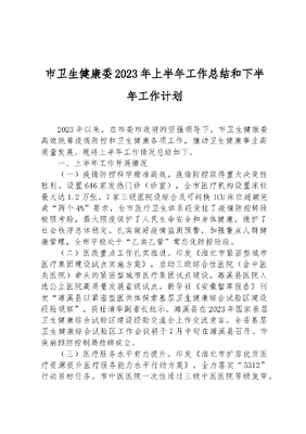 市卫生健康委2023年上半年工作总结和下半年工作计划2023年以来,在市委市政府的坚强领导下,市卫生健康委高效统筹疫情防控和卫生健康各项工作,推动卫生健康事业高质量发展。现将上半年工作情况总结如下。一、上半年工作开展情况(一)疫情防控科学精准高效。疫情防控取得重大决定性胜利。设置646家发热门诊(诊室),全市医疗机构设置床位最大达1.2万张,7家三级医院设综合及可转换ICU床位超额完成两个4%要求,全市医疗卫生体系经受住了疫情防控转段极限考验,最大限度保护了人民生命安全和身体健康,维护了社会秩序总体稳定。扎实做好疫情监测预警,加强重点人群健康管理,全市平稳处于乙类乙管常态化防控阶段。(二)医改重点工作扎实推进。印发《淮北市紧密型城市医疗集团建设试点实施方案》,启动三级综合性医院(含中医类医院)牵头的紧密型城市医疗集团试点建设。濉溪县医院入选公立医院高质量发展省级试点。新华社《安徽智库报告》刊发濉溪县以紧密型医共体探索基层卫生健康综合试验区建设经验观察,获任清华副省长批示。濉溪县在2023年国家基层卫生健康综合试验区建设经验交流会上作交流发言。全省基层卫生健康综合试验区工作会议将于7月中旬在濉溪县召开。市疾病预防控制局挂牌成立。(三)医疗服务水平有力提升。印发《淮北市扩容优质医疗资源提升医疗服务能力水平行动方案》,全力落实5312行动目标任务。市中医医院一次性通过三级中医医院等级复审。市人民医院与中国科大附一院(安徽省立医院)共建省级区域专科医疗中心协议初步形成。市中医医院肺病科在申报国家中医优势专科建设项目中,省级预审总排名第七,肺病科专业全省排名第一。市妇幼保健院成为上海市红房子妇产科医院技术协作单位。开展市级临床重点专科遴选。启动促进医疗机构及其工作人员合理检查合理用药合理治疗专项行动。3家卫生院获国家级通报表扬,454个城市社区医疗卫生机构和村卫生室达到标准建设,完成率91.34%。国家基层中医药服务能力提升工程十四五行动计划提出的基层中医药5个全覆盖,已提前实现4个。(四)爱国卫生运动深入开展。邀请国家卫生城镇创建专家来淮开展专题培训。扎实开展第35个爱国卫生月系列活动,清理卫生死角1.9万处、垃圾堆物6万余吨、病媒生物孳生地1.9万处。召开创建国家卫生城市动员会,成立市创建国家卫生城市指挥部,55个部门和单位组成一办十组。印发《淮北市创建国家卫生城市工作实施方案》,列出7个方面、212项国家卫生城市创建标准,56项国家卫生城市数据评价指标,已完成48项。组织7个镇街开展省级卫生镇申报和复审工作。(五)重点人群健康服务扩容提质。我市获评第一批全国婴幼儿照护服务示范城市,《人民日报》关注报道我市托育工作,全市已新增托位2210个,完成率100.45%。健康口腔暖民心行动新增牙椅30张,完成率75%,累计完成适龄儿童第一恒磨牙窝沟封13418人,完成率76.50%。新增25家基层医疗机构开展安宁疗护工作。全市无孕产妇死亡。二、存在困难和问题医疗资源布局统筹发展还不平衡,优势学科建设进展较慢国家和省级重点学科仍偏少,医疗技术和科研水平不高,高层次医疗人才引进还较为困难,医疗技术水平与群众健康需求仍有较大差距。提升医疗服务能力水平,特别是促进公立医院实现更高质量的发展,还需进一步加大工作力度、加强考核调度、加快推进速度。三、下半年工作计划(一)加快优质医疗资源扩容下沉和均衡布局。市人民医院和淮北矿工总医院一次性顺利通过三甲评审。加快区域专科医疗中心建设,遴选建设一批市域内诊疗资源相对薄弱、市域内急需、异地就医比例较高的病种和专科。开展公立医院高质量发展半年度点评调度,强化公立医院绩效考核。做好医疗卫生人才引、选、育结合文章,启动新一届淮北名医评选,实施一村一名大学生村医计划。扎实开展促进医疗机构及其工作人员合理检查合理用药合理治疗专项行动。待三级医院评审结束后启动市人民医院新院区搬迁,加快市中医医院中西医结合综合楼建设进度。高质量完成城市社区卫生服务机构和村卫生室标准化建设,扎实开展优质服务基层行社区医院创建工作。(二)提升医改重点领域和关键环节改革质效。建成市人民医院与相山区若干医疗机构组成的医疗集团。加大濉溪县全国基层卫生健康综合试验区建设力度,打造基层医疗卫生健康工作濉溪样板。按照省市要求,平稳有序推进市县疾控机构改革,全面推进公共卫生机构公益一类保障、二类绩效管理改革,落实疾控机构及人才相关保障措施和激励政策。(三)全力争创国家卫生城市。组织市创卫指挥部成员单位,对照《国家卫生城市标准》,逐项对标落实。组织开展创建国家卫生城市督查。收集整理各项资料,8月底前报送省爱卫办,迎接省级评审验收。印发《淮北市健康影响评价评估制度建设试点工作方案》,推动将健康融入所有政策。(四