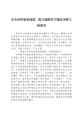 在全市检察系统第二批主题教育专题读书班上的讲话党的XX大报告对全面依法治国做了专章论述,强调公正司法是维护社会公平正义的最后一道防线,对严格公正司法做出明确部署。突出强调要规范司法权力运行,强化对司法活动的制约监督,促进司法公正。司法机关使命光荣、责任重大,唯有以更强的政治担当,忠诚履职,严格公正司法守护人民美好生活,才能不负时代、不负人民。一、深刻认识司法权的政治属性,正确行使权力必须毫不动摇坚持党对司法工作的绝对领导。司法机关作为我国人民民主专政的重要组成部分,是党和人民手中的刀把子,首要定位是政治机关,首要属性是政治属性,必须旗帜鲜明讲政治。坚持党对司法工作的绝对领导,是中国特色社会主义司法制度的根本特征。司法机关要以党的XX大精神为指引,认真贯彻XXX法治思想,坚定不移走中国特色社会主义法治道路,坚决捍卫两个确立,坚决做到两个维护,始终胸怀国之大者,不断提高政治判断力、政治领悟力、政治执行力,坚决防范和抵制西方宪政三权鼎立司法独立等错误思潮,确保在政治立场、政治方向、政治原则、政治道路上同以XXX同志为核心的党中央保持高度一致,牢牢把握司法工作在党和国家工作大局中的政治定位,始终将党的绝对领导贯穿于司法活动的各个方面,不折不扣地贯彻执行党的路线方针政策,切实维护党的执政地位,巩固党的执政基础,体现党的意志主张,落实坚持全面依法治国、推进法治中国建设的各项新部署新要求。必须注重政治效果、法律效果、社会效果的有机统一。XXXXXX指出:要树立正确法治理念,把打击犯罪同保障人权、追求效率同实现公正、执法目的同执法形式有机统一起来,坚持以法为据、以理服人、以情感人,努力实现最佳的法律效果、政治效果、社会效果。司法机关肩负维护国家政治安全,确保社会大局稳定,促进社会公平正义,保障人民安居乐业的重要职责使命,司法办案决不能机械司法、固守法条、就案办案、就事论事,必须兼顾天理、国法、人情;既要关注法律的逻辑推理与形式正义,更要关注法律背后的价值观念与实质正义,公正司法,依法能动履职,做好做实溯源治理,促进人民群众根本利益的最大化,以高度的政治自觉、法治自觉,发挥司法在引领社会风尚、维护社会稳定、参与社会治理、服务社会发展等方面的重要作用,厚植党的执政基础。必须勇于开展自我革命。打铁必须自身硬。勇于自我革命是我们党最鲜明的品格,也是我们党最大的优势。XXXXXX强调:权力是一把双刃剑,在法治轨道上行使可以造福人民,在法律之外行使则必然祸害国家和人民。2021年,在党中央直接部署下,全国政法机关掀起一场声势浩大、力度空前、刀刃向内、刮毒疗伤的自我革命,取得了明显成效,筑牢了政治忠诚,清除了害群之马,整治顽瘴痼疾,政治生态明显优化、纪律作风明显好转、执法司法公信力明显提升。要持续深化和巩固教育整顿来之不易的成果,聚焦问题整改落实,推动长效常治,织密织牢制度笼子,使规范司法成为思想自觉和行为习惯。要严格落实三个规定和新时代政法干警十个严禁,防止违法干预司法活动,规范三个规定和重大事项填报,严格办案纪律,规范办案行为,让人民群众对司法活动更有信心,对司法人员更加信任。要落实《关于建立健全禁止法官、检察官与律师不正当接触交往制度机制的意见》《关于进一步规范法院、检察院离任人员从事律师职业的意见》有关规定,规范法官、检察官与律师之间接触交往行为,整治司法掮客等突出问题,共同维护司法廉洁和司法公正。二、始终恪守司法为民理念,站稳人民立场树牢司法为民理念。司法的人民性是中国特色社会主义司法的本质特征。我国的国体和政体决定了司法权来自人民、属于人民、服务人民。是由代表全体人民意志的宪法和法律授予的,人民始终是司法机关权从何来,为谁司法,靠谁司法的唯一答案。这就要求一切司法活动必须坚持以人民为中心,为了人民、依靠人民、造福人民、保护人民,把体现人民利益、反映人民意愿、维护人民权益、增加人民福祉、促进人的全面发展作为司法工作的出发点和落脚点。坚守司法为民初心。司法为民是我们党领导人民司法事业发展中形成并始终践行的优良传统,是不忘为人民谋幸福初心的必然要求,是立党为公、执政为民思想在司法领域的具体体现,是中国特色社会主义司法制度区别于其他司法制度的鲜明特征和独特优势。司法为民要始终坚持以人民为中心,奋斗新征程,要以更暖举措守护人民美好生活。用心用情办好群众身边小案,积极回应群众诉求,持续落实群众信访件件有回复,关心关爱弱势群体,加大未成年人保护力度,精准开展司法救助,让更多法治关怀惠及最需要的群众。坚持严格公正司法。以公正司法守牢社会公平正义的最后一道防线。公平正义是司法的灵魂和生命,是人民群众感知法治建设的一把尺子。XXXXXX多次强调,要努力让人民群众在每一个司法案件中感受到公平正