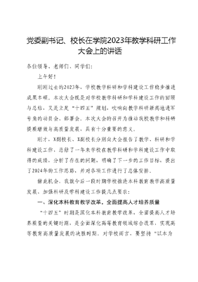党委副书记、校长在学院2023年教学科研工作大会上的讲话各位领导、老师们、同学们:上午好!刚刚过去的2023年,学校教学科研和学科建设工作稳步推进成果丰硕。本次大会既是对学校教学科研和学科建设工作的回顾与总结,又是立足十四五规划,吹响向教学科研新高地进军号角的动员会、部署会。本次大会的召开为推动我校教学和科研提质增效与高质量发展,具有十分重要的意义。刚才,X副校长、X副校长分别向大会报告了教学、科研和学科建设工作,总结了一年来学校在教学科研和学科建设工作中取得的成绩,分析了存在的问题,明确了下一步的工作目标,提出了2024年的工作思路,并对各项工作进行了总体安排。借此机会,我就今后一段时期学校推进本科教育教学高质量发展、加强科研及学科建设工作提几点要求:一、深化本科教育教学改革,全面提高人才培养质量十四五时期是深化本科教育教学改革,全面提高人才培养质量的关键时期,是全面深化高等教育领域综合改革,实现高等教育高质量发展的决胜时期。对学校而言,要坚持以本为本,推进四个回归,深化教育教学改革,释放新的发展动力,培育新的竞争优势,筑牢本科教育教学基础,实现教育教学高质量发展。——加强师德师风建设。坚持把教师思想政治素质和师德师风建设放在第一位,教育引导教师学习贯彻XXXXXX关于新时代教师队伍建设的重要讲话精神,用XXX新时代中国特色社会主义思想武装头脑,时刻保持政治上的清醒。教育引导教师学习教育部关于师德师风建设的系列规定,对标新时代师德师风建设的内涵和标准,做到凡事有分寸、有标准、有底线。抓实抓细《学院党委关于建立健全师德师风建设长效机制实施办法(试行)》《学院师德师风监督预警工作实施办法》《学院师德师风考核实施办法(试行)》等文件的落实,筑牢师德师风防线。把师德规范纳入教师管理全过程,做在平时,严在日常,主要抓好新教师入职教育、师德师风专题讲座,帮助教师树立正确的职业理想,提升职业道德水平,为教育教学高质量发展提供强有力的保障。——落实立德树人根本任务。明确高等教育的核心任务是立德树人,坚持把立德树人成效作为检验学校一切工作的根本标准完善思想政治教育体系,持续做好XXX新时代中国特色社会主义思想教育三进工作,统筹思想政治理论课、红微课、四史课、课程思政和课程思政示范课,构建系统完善的思想政治教育课程体系,解决培养什么人的根本问题。持续推进X精神铸红魂三全育人体系建设,在教学科研工作中落实管理育人服务育人,协同构建全员全程全方位育人格局,促进学生健康成长。强化体育教育、美育教育,补齐劳动教育短板,实现德智体美劳五育并举,全面提升人才培养综合素质。——推进学科专业改革建设。前不久学校实施了机构优化和专业调整,物理学专业划归数理与统计学院,整合了师范办学力量;教育科学学院更名为教师教育学院,突出了应用型的特点;整合成立旅游与电子商务学院,这是特色与特色的联合,是基于地方经济社会发展和特色办学的需要。我们要把学校机构改革和专业调整决策部署落到实处,在学科专业特色培育上下功夫。树立学科建设是龙头、专业建设是生命的理念,把学科专业调整优化作为学校治理体系现代化建设的基础,深化专业供给侧结构性改革,建立学科专业建设与产业发展更加协调、人才培养与市场需求更加适应的机制,不断提升学校专业人才培养与社会需求的匹配度。——深化人才培养模式改革。强化内涵建设,提升人才培养质量。对标师范专业认证、工程教育认证、专业综合评估,全面落实学生中心、产出导向、持续改进的教育教学理念。全面推进审核评估整改工作,根据整改意见建议,从课时优化等方面,进一步优化57个本科专业人才培养方案。以新工科、新农科、新文科为抓手,持续加强创新人才培养探索。做好辅修专业招生培养加强辅修专业和双学士学位教育。——深入推进实习就业一体化试点改革。贯彻落实《教育部关于加强和规范普通本科高校实习管理工作的意见》《X壮族自治区普通本科高校实习管理办法》,加强对校企合作单位的走访调研,规范实习教学安排,拓展学生实习就业渠道。深化双向选择实习就业一体化改革,以点带面突破毕业生高质量就业瓶颈,畅通人才供给侧和需求侧对接渠道,构建实习就业一体化的人才培养机制。——推进产教融合人才培养改革。实现产学研深度融合是提升人才培养质量的重要途径。持续深化双元制+双园制应用型人才培养模式,推进产教融合协同育人。大力推进两个X示范性现代产业学院和五个校级示范性现代产业学院建设进度,尽快出成果见成效。深化校企合作模式改革,加强与行业企业对接,搭建学生实践锻炼和成才的平台。积极对接X经济社会和产业发展需求,构建学校人才培养与行业产业同频共振产教供需双向对接的联动机制。加强人才需求预测、预警、培养、评价等方面协同,实现学科专业与产业链、创新链、人才链相互匹配、相互促进。——严格教