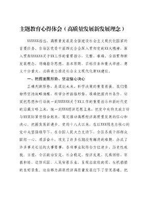 主题教育心得体会(高质量发展新发展理念)XXXXXX指出,高质量发展是全面建设社会主义现代化国家的首要任务。自治区党委十届四次全会深入贯彻党的XX大精神,深入贯彻XXXXXX关于XX工作的重要指示,完整、准确、全面贯彻新发展理念,明确指导思想、基本原则、目标任务和重大举措,意义十分重大,必将有力推进社会主义现代化新XX建设。一、把握发展形势、坚定信心决心正确判断形势,是谋划未来、科学决策的重要前提。我们要始终坚持战略清醒,科学分析面临形势、准确把握内外条件,切实把思想和行动统一到XXXXXX关于XX工作的重要指示和新时代党的治藏方略上来,统一到XXX经济思想上来,把党中央的大政方针与XX实际紧密结合起来,笃定推动高原经济高质量发展的信心和决心。把握发展新进步。党的十八大以来,在以XXX同志为核心的党中央坚强领导下,在全国人民大力支持下,全区各族干部群众团结一心、艰苦奋斗,攻克了许多长期没有解决的难题,办成了许多事关长远的大事要事,各项事业取得全方位进步、历史性成就。当前,全区政治安定、社会稳定、经济发展、民族团结、宗教和睦、边防巩固、人民安居乐业,呈现出欣欣向荣、生机勃勃的良好景象。这些都为高原经济高质量发展打下了坚实基础。把握发展新要求。发展理念是发展行动的先导,发展理念是否对头从根本上决定着发展成效乃至成败。新发展理念传承党的发展理论,坚持以人民为中心的发展思想,进一步科学回答了实现什么样的发展、怎样实现发展的问题,深刻揭示了实现更高质量、更有效率、更加公平、更可持续、更为安全的发展之路,开拓了中国特色社会主义政治经济学新境界。完整、准确、全面贯彻新发展理念,坚持三个赋予一个有利于,扬长避短,因地制宜,加快推进高质量发展,努力走出一条符合XX实际的高质量发展之路,让人民过上更加幸福美好的生活。二、坚持系统观念、统筹协调推动XX高质量发展不仅仅是单纯的经济问题,而是政治问题、经济问题、社会问题、民生问题的辩证统一。推动高原经济高质量发展,需要坚持和运用系统观念处理好各方面关系、统筹好各方面利益、调动好各方面积极性。统筹速度和质量。质量和速度是经济发展的一体两面,互为依托、互相促进,唯有形成合力、同向发力,方能强基固本、行稳致远。XX底子薄、欠账多,经济总量偏小、发展相对滞后。发挥后发优势,聚焦转型、苦练内功,加快推动经济优化升级,厚植发展优势、增强发展后劲,不断提升发展质量。在保证质量的前提下,保持一定的经济增长速度,尽可能缩小与发达地区的发展差距,努力实现质的有效提升和量的合理增长。统筹当前和长远。当前和长远,相辅相成、辩证统一。当前是前提与基础,长远是愿景与蓝图。要坚持把谋当下和谋未来统一起来,处理好短期目标和长远目标的关系,行动于当下、着眼于未来,在战略上坚持持久战,坚持稳中求进搞好顶层设计,把握好节奏和力度,久久为功,防止杀鸡取卵、竭泽而渔、饮鸩止渴;在战术上打好歼灭战,抓落实、办实事,一仗接着一仗打、一件接着一件干,注重实效,步步为营,决不能把马拉松跑成百米赛。统筹发展和安全。安全是发展的前提,发展是安全的保障。要牢固树立总体国家安全观,坚持把维护稳定作为第一位的工作任务,始终保持警钟长鸣、警惕常在,加强国家安全教育,学习践行新时代枫桥经验和浦江经验,完善社会治理体系,把工作做在日常、做到基层,建设更高水平的平安XX,努力实现高质量发展和高水平安全的良性互动。统筹保护和发展。XX最大的价值在生态、最大的责任在生态最大的潜力也在生态。要深入践行XXX生态文明思想,从长远考虑从大局考量,坚持有所为、有所不为,把握好经济发展和生态保护的平衡点,把高质量发展置于绿色低碳的基础之上,在保护中发展、在发展中实现更高水平的保护,守护好高原的生灵草木、万水千山,筑牢国家生态安全屏障,努力走出一条生态优先、绿色发展之路。统筹物质和精神。物质贫困不是社会主义,精神贫乏也不是社会主义。要坚持物质文明和精神文明协调发展、相互促进,在推动经济高质量发展的同时,高度重视精神文明建设,培育和弘扬社会主义核心价值观,深入开展国家意识、公民意识、法治意识教育,铸牢中华民族共同体意识,为高原经济高质量发展提供坚强思想保证、丰润道德滋养、强大精神力量。三、坚持守正创新、抓住重点突破守正才能不迷失方向、不犯颠覆性错误,创新才能把握时代、引领时代。要坚持把高原经济高质量发展放在党和国家工作大局中思考谋划,立足维护祖国统一、加强民族团结这个着眼点和着力点,把握改善民生、凝聚人心这个出发点和落脚点,聚焦发展不平衡不充分问题,以优化发展格局为切入点,以要素和设施建设为支撑,以制度机制为保障,加快推动高原经济高质量发展。坚持以抓好项目为支撑。项目是点、产业是线、经济是面。要牢固树立项目带动发展的思想坚持问题导向,做好项目前期工作,谋