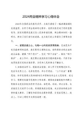 2024两会精神学习心得体会2024年全国两会的胜利召开,为我们描绘了一幅波澜壮阔的发展蓝图。在学习两会精神的过程中,我深刻感受到了党的坚强领导、国家的繁荣发展以及人民的幸福安康。两会精神如同一盏明灯,照亮了我们前行的道路,也为我们的工作提供了重要的指导。一、紧握忠诚之心,勾勒一心向党的深情画卷。忠诚是共产党员最鲜明的品质,我们要坚定理想信念,始终保持对党忠诚的政治品格,增强四个意识、坚定四个自信、做到两个维护。在工作中,我们要以高度的责任感和使命感,不折不扣地贯彻落实党的决策部署,为党和人民的事业不懈奋斗。1.加强政治学习,提高政治觉悟:深入学习党的理论知识,包括马克思主义、毛泽东思想、邓小平理论、三个代表重要思想、科学发展观以及XXX新时代中国特色社会主义思想等。通过学习,理解党的指导思想和方针政策,增强政治敏锐性和判断力积极参与党组织组织的学习活动,如党课、培训、研讨会等,与其他党员交流学习心得,共同提高政治觉悟。关注国内外政治形势和重大事件,了解党和国家的决策和部署,自觉在思想上、政治上、行动上同党中央保持高度一致。2.严守党的纪律,做到心中有戒、行为有度:认真学习党的纪律规定,如党的章程、党纪处分条例等,明确自己的行为准则和底线。增强纪律意识,时刻牢记党的纪律要求,不触碰红线,不越底线。自觉遵守党的组织纪律,服从组织安排,积极参加党组织的活动和工作。严格要求自己,做到廉洁自律,坚决抵制腐败和不正之风,保持清正廉洁的政治品行。3.忠诚履行职责,努力做好本职工作:明确自己的工作职责和任务,认真履行岗位职责,努力提高工作质量和效率。积极主动地承担工作任务,不怕困难,勇于担当,为实现党的目标和任务贡献自己的力量。不断提升自己的业务能力和综合素质,通过学习和培训,不断适应工作的新要求和新挑战。与同事密切合作形成团结协作的工作氛围,共同为党的事业努力奋斗。4.积极参与党的建设,为增强党的凝聚力和战斗力发挥自己的作用:积极参加党组织的各项活动,如组织生活会、主题党日等,为党组织的建设和发展出谋划策。关心和帮助其他党员同志形成团结互助的党组织氛围,共同提高党组织的凝聚力。发挥自己的特长和优势,为党组织的工作提供支持和帮助,如组织活动宣传工作等。参与党员志愿服务活动,为社会和群众提供帮助和服务,展现党员的先锋模范作用。5.传承红色基因,弘扬党的优良传统,不忘初心、牢记使命文可居文库——海量学习资料,手机电脑下载www.wenkeju.com学习党的历史和传统,了解党的光辉历程和伟大成就,增强对党的认同感和自豪感。传承党的优良作风,如艰苦奋斗、实事求是密切联系群众等,将这些作风贯穿于工作和生活中。践行党的初心和使命,始终以人民为中心,为人民群众谋幸福、谋发展。通过自己的言行和行动,影响和带动身边的人,共同弘扬党的优良传统和价值观。二、紧握实干精神,渲染实干兴邦的奋斗色彩。实干是实现中国梦的关键,我们要发扬实干精神,勇于担当作为,以实际行动为国家的发展贡献力量。在工作中,我们要注重实际、讲求实效,切实解决好群众关心的问题,努力创造经得起实践和历史检验的业绩。1.树立正确的政绩观:要明确政绩的真正含义,认识到政绩不仅仅是表面的数字和指标,更重要的是实际的工作成果和对人民的贡献。摒弃形式主义和官僚主义,注重工作的质量和实效,不追求虚假的政绩。以实际行动为导向,注重解决实际问题,把工作重点放在为人民群众办实事、做好事上。2.勇于担当责任:在面对困难和挑战时,要有勇气挺身而出不退缩、不回避。主动承担工作中的责任,不怕困难,敢于面对问题并寻找解决方案。培养坚韧不拔的精神,克服畏难情绪,以积极的态度迎难而上,展现担当和决断力。文可居文库——海量学习资料,手机电脑下载www.wenkeju.com3.提高工作能力:保持学习的状态,不断学习新知识、新技能,跟上时代的发展步伐。通过参加培训、阅读专业书籍、与同行交流等方式,提升自己的专业素养。将所学的知识应用到实际工作中,解决实际问题,提高工作的效率和质量。4.注重创新实践:积极思考新的工作思路和方法,勇于尝试创新举措。培养创新意识,关注行业的新趋势和新技术,将其应用到工作中。鼓励团队成员提出创新性的想法和建议,共同探索新的工作模式和方法。通过创新实践,推动工作的发展和进步,取得更好的工作成果。5.形成团结协作的氛围:建立良好的沟通机制,加强与同事之间的交流与合作。尊重他人的意见和建议,充分发挥团队成员的优势,共同努力实现工作目标。培养团队精神,相互支持、相互帮助,共同克服困难。通过团结协作,提高工作效率,创造良好的工作氛围。三、紧握为民情怀,绘画全心为民的精神图谱。为民是我们工作的出发点和落脚点,我们要始终坚持以人民为中心的发展思想,不断满足人民对美好生活的向往。在