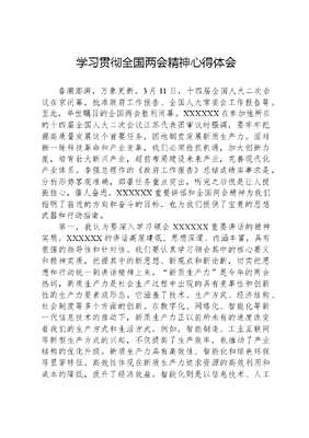 学习全国两会精神心得体会这次全国两会是在中华人民共和国成立75周年,实现十四五规划目标任务的关键之年,召开的一次十分重要的会议,是我国政治生活中的一件大事,在党和国家事业发展史上具有里程碑意义。全国两会的胜利召开,对于进一步把全党全军全国各族人民的思想和行动统一到党中央决策部署上来,奋力实现党中央确定的经济社会发展目标,谱写中国式现代化的崭新篇章,具有十分重要的意义。我和大家一样对全国两会非常关注,通过新闻媒体观看大会的盛况,逐字逐句学习理解《政府工作报告》,特别是深入学习了×××XXX参加江苏代表团审议、看望参加政协会议的民革科技界环境资源界委员、出席解放军和武警部队代表团全体会议等重要讲话精神,感觉思想上豁然开朗、行动上有了明确方向,收获满满,倍感振奋。今天,我们围绕深入学习两会精神,第一时间组织开展党委理论学习中心组研讨交流,就是要通过深入学习,反复学习,促进大家在思想上得到新认识、境界上得到新提高、工作上得到新启发,时刻用党的创新理论武装头脑指导实践、推动工作,把学习成果转化为砥砺初心、奋进拼搏,推动集团公司高质量发展的强大精神动力,努力以更大更新的作为,为××全面振兴突破贡献××力量,提供××支撑。下面,利用这次机会与大家作以交流。一、认真学习、深刻领会,坚决把思想和行动统一到×××XXX重要讲话和全国两会精神上来。×××XXX在两会期间发表了一系列重要讲话,主题鲜明、高瞻远瞩、思想深邃、内涵丰富,特别是站在全局和战略高度,围绕因地制宜发展新质生产力提出的新论断、作出的新部署、明确的新要求,深刻阐释了事关国家发展全局和长远的重大问题,充分体现了×××XXX一贯深远的战略考量,宏阔的理论视野、高超的政治智慧、深沉的忧患意识,进一步创新发展了马克思主义生产力理论是×××经济思想的最新成果,是两会精神最核心、最集中最重要的内容,具有很强的思想性、针对性和指导性,对全面建设社会主义现代化国家、全面推进中华民族伟大复兴具有重大而深远的意义,为我们开启现代化建设新征程指明了前进方向,也为我们做好新时代××事业注入了强大信心,提供了强劲动力。深刻领会×××XXX重要讲话的精髓内涵、核心要义,坚定拥护两个确立、坚决做到两个维护,增强看齐意识,始终在思想上、政治上、行动上同以×××同志为核心的党中央保持高度一致,知责于心、担责于身、履职于行,满怀信心创新业,踔厉奋发建新功。二、牢记高质量发展这个新时代的硬道理,为谱写中国式现文可居文库——海量学习资料,手机电脑下载www.wenkeju.com代化××新实践壮美华章贡献××力量。×××XXX参加十四届全国人大二次会议江苏代表团审议时强调,要牢记高质量发展是新时代的硬道理,把握好发展新质生产力的精髓要义,在以中国式现代化全面推进强国建设、民族复兴伟业的新征程上再建新功。我们必须深刻领会因地制宜加快发展新质生产力的核心要义和实践要求,坚持从实际出发,立足集团公司现有的资源优势、产业基础、科研条件等,抢抓机遇,以敢闯敢干加实干的精神状态狠抓落实,统筹推进传统产业转型升级、新兴产业发展壮大、科技人才队伍建设等重点工作,持续为培育发展新质生产力注入新动能。一要加快传统产业转型升级。聚焦供水主业强基固本,提升数字化、信息化、智能化管理能力,优化水费营收系统、完善GIS管网信息系统、加快建设无水泵站、论证黑灯水厂和数字孪生水厂建设,持续做强主业链条。二要加快数字××产业发展。积极适应行业智慧化发展趋势,聚焦集团数字化转型的迫切需求以产学研联盟为技术支撑,全力推动智慧××公司建设,提高集团公司营收水平和自主创新能力,开拓××地区的广阔项目市场引领集团高质量发展。三要加快科技人才队伍建设。要把建设科技人才队伍作为重中之重来抓,大力引才、育才、用才,为优秀人才提供需要的肥沃土壤和适宜的阳光雨露,营造崇尚创新、鼓励探索、追求卓越、宽容失败的文化氛围,让人才心无旁骛、潜文可居文库——海量学习资料,手机电脑下载www.wenkeju.com心致研,致力打造一批符合集团公司科技发展战略的一流创新团队,造就一支具有规模的青年科技人才队伍。三、迅速行动,抓好贯彻落实,切实用×××XXX重要讲话精神和全国两会精神凝聚奋进合力。根据市委关于全国两会精神传达学习的部署要求,我们要把学习贯彻×××XXX重要讲话精神和全国两会精神作为当前和未来一个时期的重要政治任务来抓,持续加强党的创新理论武装,进一步夯实拥护两个确立、坚决做到两个维护的思想根基,凝聚起上下一心朝着×××XXX指引的方向前进的强劲动力。一要强化示范带头学,在引领带动上下硬功。在座的领导班子成员是我们集团公司的关键少数,必须始终坚持以身作则、以上率下,立好标杆、作好示范,拿出挤和钻的精神,先