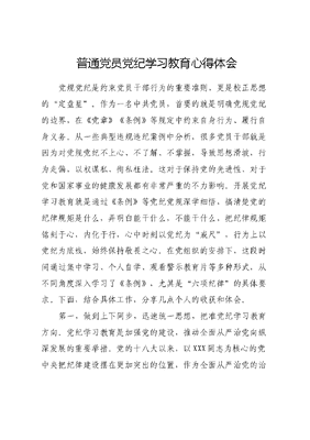 普通党员党纪学习教育心得体会党规党纪是约束党员干部行为的重要准则,更是校正思想的定盘星。作为一名中共党员,首要的就是明确党规党纪的边界,在《党章》《条例》等规定中约束自身行为、履行自身义务。从一些典型违规违纪案例中分析,很多党员干部就是因为对党规党纪不上心、不了解、不掌握,导致思想滑坡,行为走偏,以权谋私、徇私枉法。这对于保持党的先进性、对于党和国家事业的健康发展都有非常严重的不力影响。开展党纪学习教育就是通过《条例》等党纪党规深学细悟,搞清楚党的纪律规矩是什么,弄明白能干什么,不能干什么,把纪律规矩铭刻于心,内化于行,心中时刻以党纪为戒尺,行为上以党纪为底线,始终保持敬畏之心。在党组织的安排下,这段时间通过集中学习、个人自学、观看警示教育片等多种形式,从不同角度深入学习了《条例》,尤其是六项纪律的具体要求。下面,结合具体工作,分享几点个人的收获和体会。第一,做到上下同步,迅速统一思想,把准党纪学习教育方向。党纪学习教育是加强党的建设,推动全面从严治党向纵深发展的重要举措。党的十八大以来,以XXX同志为核心的党中央把纪律建设摆在更加突出的位置,作为全面从严治党的治本之策,与时俱进推进理论、实践和制度创新,纪律建设成为新时代党的建设总体布局的突出亮点。党中央先后于2015年、2018年和2023年三次修订《条例》,始终坚持严的基调,不断完善纪律规矩,释放了全面从严治党越来越严、越往后执纪越严的强烈信号,充分彰显了我们党推进自我革命的坚定决心和坚强意志。在全党开展党纪学习教育,就是要教育引导党员干部搞清楚党的纪律规矩是什么,弄明白能干什么、不能干什么。作为党员干部,要更加深刻领悟两个确立的决定性意义,坚决做到两个维护,切实把思想和行动统一到党中央决策部署上来,切实把自己摆进去、把工作摆进去、把职责摆进去,深入领会《条例》的重点内容和着力方向,强化自我约束,提高免疫能力。党纪学习教育全面开展以来,我切实进一步提高政治站位,增强开展党纪学习教育的使命感责任感紧迫感,在党组织的统一安排下,深入学习领悟XXXXXX关于党纪学习教育的重要讲话和重要指示精神,把准党纪学习教育的政治指向、目标任务、实践要求。我深刻认识到,开展党纪学习教育,是巩固拓展学习贯彻XXX新时代中国特色社会主义思想主题教育成果、推动党的创新理论武装不断走深走实的重要举措,是加强党的纪律建设、推动全面从严治党向纵深发展的重要举措,是强化纪律作风保障、确保中国式现代化顺利推进的重要举措。文可居文库——海量学习资料,手机电脑均可下载www.wenkeju.com作为党员干部,要把扎实开展党纪学习教育作为重要政治任务,聚焦学纪、知纪、明纪、守纪总体要求,搞清楚党的纪律规矩是什么,弄明白能干什么、不能干什么,把遵规守纪刻印在心,内化为日用而不觉的言行准则,进一步强化纪律意识、加强自我约束、提高免疫能力,增强政治定力、纪律定力、道德定力、抵腐定力,始终做到忠诚干净担当。第二,做到内外兼修,切实内化于行,聚焦党纪学习教育重点。学习贯彻新修订的《中国共产党纪律处分条例》是这次学习教育的重点。新修订的《条例》以XXX新时代中国特色社会主义思想为指导,全面贯彻党的XX大精神,是根据党章、宪法和法律,针对新时期党内存在的突出问题,结合现阶段从严治党新的实践制定的,既把反腐败斗争的成果以制度的形式固定下来,又对未来领导干部的工作提供指南遵循,将新时期党全面从严治党的实践成果转化为新的纪律要求,推动新时代党员干部更加深刻地领悟两个确立的决定性意义、更加坚决地做到两个维护,确保全党团结一致,打赢新时代反腐败斗争攻坚战持久战。在二十届中央纪委二次全会上,XXXXXX用六个如何始终深入阐述了我们党前进路上必须解决的最为紧迫、最为关键、最为根本的独有难题。《条例》的修订以解决大党独有难题为导向,从纪律保障层面推动解决大党独有难文可居文库——海量学习资料,手机电脑均可下载www.wenkeju.com题,体现了鲜明的问题导向和忧患意识。作为党员干部要牢记加强党纪教育是纵深推进全面治党的重要要求,把《中国共产党纪律处分条例》的学习融入日常,养成坚持学的习惯,原原本本读、逐字逐句学,在学思践悟中明白什么该做、什么不该做,真正知其然知其所以然,把党纪学习教育内化于心、外化于行,做到知敬畏、存戒惧、守底线。时刻用反面案例警醒自己,以案为鉴警钟长鸣,做到自重自省自警自律。要把纪律这个管党治党的戒尺摆在突出重要位置,持续加固中央八项规定堤坝,经常打扫政治灰尘、纠正思想偏差、解决行为不正等突出问题,不断增强纪律刚性约束力,把严的基调贯彻到纪律教育、纪律执行全过程。要以身作则,注重发挥榜样的力量,带领身边的同志一起学习进步,同时结合实际情况创新方式方