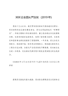 XXX论全面从严治党 (2019年)党的十九大以来,我们贯彻落实新时代党的建设总要求,坚持把党的政治建设摆在首位,深化运用监督执纪四种形态,夺取反腐败斗争压倒性胜利,着力惩治群众身边的腐败问题,完善党和国家监督体系,取得了新的重大成果,为实现党和国家事业新发展提供了坚强保障。一年多来,经过全党共同努力,党的集中统一领导更加坚强有力,党的建设新的伟大工程全方位加强,全面从严治党实效性不断提高,党内政治生态进一步改善,党在新时代新征程中焕发出更加强大的生机活力。XXX2019年1月11日在中共十九届中央纪委三次全会上的讲话腐败是党面临的最大威胁,坚决防治腐败是党自我革命必须长期抓好的重大政治任务。XXX2019年1月11日在中共十九届中央纪委三次全会上的讲话改革开放40年来,在党中央坚强领导下,各级纪检监察机关坚持党的领导、从严管党治党,探索积累了宝贵经验。这就是,必须坚决维护党中央权威和集中统一领导,确保全党步调一致、行动统一;必须坚持治国必先治党、治党务必从严,确保党成为中国特色社会主义事业的中流砥柱;必须坚持以人民为中心,确保立党为公、执政为民;必须坚持改革创新、艰苦奋斗作风,确保党始终走在时代前列;必须坚决同消极腐败现象作斗争,确保党永葆清正廉洁的政治本色。XXX2019年1月11日在中共十九届中央纪委三次全会上的讲话文可居文库——海量学习资料,手机电脑均可下载www.wenkeju.com回顾改革开放四十年的历程,我们可以清楚看到,在进行社会革命的同时不断进行自我革命,是我们党区别于其他政党最显著的标志,也是我们党不断从胜利走向新的胜利的关键所在。四十年管党治党的经验深刻昭示我们:必须不断进行自我革命,同一切影响党的先进性、弱化党的纯洁性的问题作坚决斗争,实现自我净化、自我完善、自我革新、自我提高。——自我净化,就是要过滤杂质、清除毒素、割除毒瘤,教育引导全党坚定理想信念宗旨,自觉抵御各种腐朽思想侵蚀,提高政治免疫力,同时聚焦突出问题,自觉向体内病灶开刀,清除一切侵蚀党的健康肌体的病毒。——自我完善,就是要修复肌体、健全机制、丰富功能,着眼于加强党的长期执政能力建设,着力补短板、强弱项,不断构建系统完备、科学规范、运行有效的制度体系,完善决策科学、执行坚决、监督有力的权力运行机制。——自我革新,就是要与时俱进、自我超越,善于调动全党积极性、主动性、创造性,坚决破除一切不合时宜的思想观文可居文库——海量学习资料,手机电脑均可下载www.wenkeju.com念和体制机制弊端,通过改革和制度创新压缩腐败现象生存空间和滋生土壤,营造风清气正的政治生态。——自我提高,就是要有新本领、有新境界,永不僵化、永不停滞,在学习实践中砥砺品格、增长才干,全面增强执政本领,不断提升政治境界、思想境界、道德境界,永葆党的生机活力。XXX2019年1月11日在中共十九届中央纪委三次全会上的讲话加强党的政治建设,保证全党集中统一、令行禁止。要贯彻落实新形势下党内政治生活若干准则,发展积极健康的党内政治文化。XXX2019年1月11日在中共十九届中央纪委三次全会上的讲话文可居文库——海量学习资料,手机电脑均可下载www.wenkeju.com弘扬优良作风,同心协力实现小康。要把刹住四风作为巩固党心民心的重要途径,对享乐主义、奢靡之风等歪风陋习要露头就打,对四风隐形变异新动向要时刻防范。XXX2019年1月11日在中共十九届中央纪委三次全会上的讲话坚决惩治腐败,巩固发展压倒性胜利。要坚持靶向治疗、精确惩治,聚焦党的十八大以来着力查处的重点对象,紧盯事关发展全局和国家安全的重大工程、重点领域、关键岗位,加大金融领域反腐力度,对存在腐败问题的,发现一起坚决查处一起。要深化标本兼治,夯实治本基础,一体推进不敢腐、不能腐、不想腐。XXX2019年1月11日在中共十九届中央纪委三次全会上的讲话文可居文库——海量学习资料,手机电脑均可下载www.wenkeju.com强化主体责任,完善监督体系。要深化国家监察体制改革高质量推进巡视巡察全覆盖,发挥派驻机构职能作用。各级党委(党组)特别是书记要强化政治担当、履行主体责任,把每条战线、每个领域、每个环节的党建工作抓具体、抓深入。向群众身边不正之风和腐败问题亮剑,维护群众切身利益要做深做实做细市县巡察和纪委监委日常监督,在实践中拓展整治群众身边腐败和作风问题工作,从具体人、具体事着手,将问题一个一个解决。XXX2019年1月11日在中共十九届中央纪委三次全会上的讲话增强四个意识、坚定四个自信、做到两个维护,是具体的不是抽象的,领导干部特别是高级干部必须从文可居文库——海量学习资料,手机电脑均可下载www.wenkeju.com知行合一的