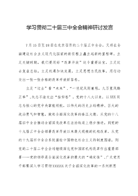 学习贯彻二十届三中全会精神研讨发言7月15日至18日在北京召开的二十届三中全会,又将在全面建设社会主义现代化国家的新征程上矗立起新的里程碑。立足关键时期,我们要用好改革开放这个重要法宝,立足过去复盘总结,立足机遇加快发展,立足思想为民改革,用行动交出一张一张合格的改革开放新答卷。立足过去看未来,一世纪风雨兼程,九万里风鹏正举,矢志不渝交出信仰卷。党的十八大以来,以XXX同志为核心的党中央掌舵领航,以伟大的历史主动精神、巨大的政治勇气和智慧,掀起全面深化改革的春江大潮。从党的十八届四中全会推动全面深化改革在法治轨道上稳步推进,到党的十九届三中全会部署改革开放以来最大规模的机构改革,从党的十九届四中全会系统描绘中国特色社会主义的制度图谱,到党的二十届二中全会对继续深化党和国家机构改革作出重要部署……党的领导是全面深化改革的最大的确定性,广大党员干部要深入学习贯彻XXXXXX关于全面深化改革的一系列新思想、新观点、新论断,完整、准确、全面贯彻新发展理念,始终把党的领导贯穿改革开放工作全过程,心怀国之大者,以开局就是决战,起步就是冲刺,转身即抓落实的使命感和精气神将新时代改革开放进行到底。立足机遇看挑战,风生水起逐浪高,扬帆破浪再起航,迎难而上交出发展卷。新时代,我们推动的改革是全方位、深层次、根本性的,取得的成就是历史性、革命性、开创性的。