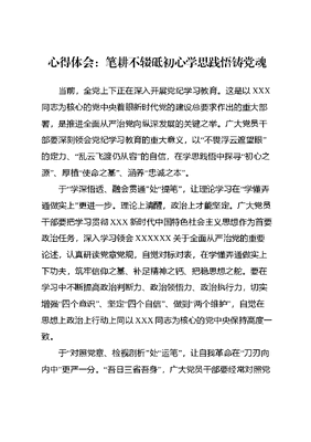 心得体会:笔耕不辍砥初心学思践悟铸党魂当前,全党上下正在深入开展党纪学习教育。这是以XXX同志为核心的党中央着眼新时代党的建设总要求作出的重大部署,是推进全面从严治党向纵深发展的关键之举。广大党员干部要深刻领会党纪学习教育的重大意义,以不畏浮云遮望眼的定力、乱云飞渡仍从容的自信,在学思践悟中探寻初心之源、厚植使命之基、涵养忠诚之本。于学深悟透、融会贯通处提笔,让理论学习在学懂弄通做实上更进一步。理论上清醒,政治上才能坚定。广大党员干部要把学习贯彻XXX新时代中国特色社会主义思想作为首要政治任务,深入学习领会XXXXXX关于全面从严治党的重要论述,认真研读党章党规,自觉对标对表,在学懂弄通做实上下功夫,筑牢信仰之基、补足精神之钙、把稳思想之舵。要在学习中不断提高政治判断力、政治领悟力、政治执行力,切实增强四个意识、坚定四个自信、做到两个维护,自觉在思想上政治上行动上同以XXX同志为核心的党中央保持高度一致。于对照党章、检视剖析处运笔,让自我革命在刀刃向内中更严一分。吾日三省吾身,广大党员干部要经常对照党章党规党纪,对照人民群众新期待,对照先进典型、身边榜样,查找自身在理想信念、政治纪律、组织生活、作风建设等方面存在的差距和不足,深刻剖析问题根源,明确整改方向,切实把改字贯穿始终、落到实处。要坚持高标准、严要求,防止学习教