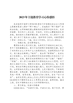 2023年主题教育学习心得感悟扎实组织开展学习贯彻XXX新时代中国特色社会主义思想主题教育是衷心拥护两个确立、忠诚践行两个维护的政治检验,必须准确把握主题教育的总要求和目标任务,在深学细悟、笃信笃行上走在前、作表率,切实以主题教育的扎实成效,推动组织工作高质量发展。近段时间,本人通过个人自学,深入学习了党的XX大报告、党章等学习材料,对新思想有了更进一步的认识。下面,结合工作实际,谈几点心得体会。一、站稳立场,坚定理想信念。理想信念是立党兴党之基,也是党员干部安身立命之本,青年干部的健康成长,离不开信仰的明灯和理想的支撑。缺少了对实现社会主义和共产主义的理想信念,或者理想信念不坚定,我们就会在精神上缺钙,就会得软骨病。在成长成才的道路上,我们总会遇到形形色色的诱惑以及来自各个方面的压力。此时,惟有坚定的理想信念才能压舱掌舵领航。深入学习XXX新时代中国特色社会主义思想,对于我们认清时代方位,领悟历史使命,坚定理想信念,统一思想行动,推动各项事业发展具有重大意义。通过学习我深刻认识到,必须坚持马克思主义基本原理,立足中国实际,不断推进理论创新、实践创新、制度创新,以马克思主义中国化最新成果统一思想、指导实践。我将牢记初心使命,坚定四个自信,自觉在思想上政治上行动上同党中央保持高度一致,用XXX新时代中国特色社会主义思想武装头脑、指导实践、推动工作,坚定中国特色社会主义共同理想和信念。二、勇于担当,发扬斗争精神XXXXXX指出:知者行之始,行者知之成。敢于负责、勇于担当最能体现党员干部的政治品格和党性作风。作为一名党员干部,必须知行合一、做实干家,在工作实践中弘扬担当精神,加强实践锻炼、真刀真枪打拼,多当几回热锅上的蚂蚁,在急难险重任务中经受摔打,以时时放心不下的责任感、积极担当作为的精气神履好职、尽好责。进入新时代,我国社会主要矛盾的变化,提出了更高的要求。作为共产党员,我们必须勇于担当,甘于奉献,敢于斗争,以永不懈怠的精神状态和一往无前的奋斗姿态,把党和人民赋予的任务完成好。通过学习我深刻认识到,必须继续推进全面从严治党,坚决反对形式主义、官僚主义,坚持稳中求进工作总基调,推动全面深化改革,坚持以人民为中心的发展思想。我将不断强化四个意识,坚定四个自信,做到两个维护,以对党和人民事业高度负责的政治觉悟,发扬斗争精神,坚决反对一切形式主义、官僚主义,以永不懈怠的劲头抓好工作,以一往无前的姿态解决发展过程中的风险挑战。三、立足本职,做出工作成效今年是进入全面建设社会主义现代化国家、向第二个百年奋斗目标进军新征程的重要一年,我们党将召开XX大,这是党和国家政治生活中的一件大事。我们必须立足本职,做好自己的工作,以实际行动推动各项事业不断取得新成就。我深刻认识到,全面建成小康社会、实现中华民族伟大复兴的中国梦任重道远。我们必须立足新发展阶段,贯彻新发展理念,构建新发展格局,推动高质量发展。我将进一步提高政治站位,牢固树立大局意识,深入贯彻XXX新时代中国特色社会主义思想,以对党和人民高度负责的精神,履职尽责,在推动经济高质量发展和社会事业进步上展现出新作为。下一步,我将结合工作实际,进一步提高政治水平和业务素质,增强文字功底和思维能力,强化协调意识和服务意识,努力成为可堪大用、能担重任的党办干部,以强烈的主动精神奋进新征程、建功新时代。通过此次学习,我将以崭新精神风貌和务实作风,推动各项事业在新时代取得新成就。