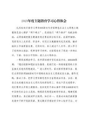 2023年度主题教育学习心得体会扎实组织开展学习贯彻XXX新时代中国特色社会主义思想主题教育是衷心拥护两个确立、忠诚践行两个维护的政治检验,必须准确把握主题教育的总要求和目标任务,在深学细悟、笃信笃行上走在前、作表率,切实以主题教育的扎实成效,推动组织工作高质量发展。近段时间,本人通过个人自学,深入学习了党的XX大报告、党章等学习材料,对新思想有了更进一步的认识。下面,结合工作实际,谈几点心得体会。一要狠抓理论学习,在学深悟透中坚定政治方向。XXXXXX强调:理论创新和理论宣传教育,是我们党一项极端重要的工作直接关系党的思想建设。进入新时代,面对新形势新任务,我们必须坚持用XXX新时代中国特色社会主义思想武装头脑、指导实践、推动工作,把学习贯彻新思想作为首要政治任务。当前,我县正处在建设社会主义现代化的新征程上。在这个历史进程中,我们要带头开展主题教育,组织党员干部认真学习领会XXX新时代中国特色社会主义思想,特别是思想理论的科学体系、精神实质实践要求,真正做到学以致用、知行合一,在推动本地区高质量发展中不断开创新局面。要定期召开理论学习中心组学习会,对新思想新战略进行系统学习,坚定道路自信、理论自信、制度自信、文化自信,确保全县上下在思想上政治上行动上与党中央保持高度一致。二要突出调查研究,在求真务实中破解难点问题。调查研究是我们党的优良传统和工作作风。XXXXXX强调,要坚持问题导向,以调查研究推动工作。当前,我县正处在转型发展的关键时期,发展任务艰巨,改革攻坚任务繁重。必须坚持以人民为中心的发展思想,立足新发展阶段,贯彻新发展理念,构建新发展格局,找准发展定位,明确发展方向,破解发展难题。我们要继续坚持调查研究,深入基层一线调查研究,广泛听取群众呼声,以眼睛下的问题推动工作。要组织党员干部深入产业园区、企业进行调研,了解企业发展面临的困难和问题,研究解决企业发展最后一公里问题。要定期组织党员干部进入农村进行调查研究,掌握第一手资料,找出推进乡村振兴的正确路径。只有坚持深入调查研究,我们才能在发展中找准方向、破解难题以优异成绩庆祝建党100周年。三要狠抓推动发展,在担当作为中彰显组工价值。发展是党执政兴国的第一要务。党的十八大以来,我国发展取得历史性成就、发生历史性变革。这些成就的取得,根本在于我们党始终坚持发展第一要务,坚持以人民为中心的发展思想。作为组织部门我们肩负着推动发展的重要职责。进入新时代,面对新形势新任务,我们必须坚持发展第一要务,坚持以人民为中心,狠抓发展在担当作为中彰显组工价值。当前,我县正处在转型发展和乡村振兴的关键阶段。下一步,我们将牢固树立发展第一要务理念,把推动高质量发展作为首要任务。我们将深入贯彻新发展理念,聚焦供给侧结构性改革,推动产业转型升级和农业供给侧结构性改革,为经济高质量发展提供人才支撑。此外,我们将主动作为积极作为,在项目建设、招商引资、人才引进等方面发挥组织协调作用,推动各项发展举措落地见效。只有狠抓发展,我们才能在新时代新征程中展现组工价值,以实际行动推动全县高质量发展。四要发扬自我革命,在检视整改中锻造模范队伍。全面从严治党是我们党永葆生机活力、团结带领人民进行伟大奋斗的根本保证。党的十八大以来,以XXX同志为核心的党中央以前所未有的勇气和定力推进全面从严治党,党的建设开创新局面。进入新时代,我们必须继续推进全面从严治党,坚持自我革命,不断提高党的建设质量,以优异成绩庆祝建党100周年。在新征程上,我们将以永远在路上的坚韧来推进全面从严治党,以自我革命精神锤炼模范队伍。我们将组织党员干部开展批评和自我批评,严格落实中央八项规定精神,坚决反对四风问题,以零容忍态度惩治腐败。我们还将定期召开民主生活会,严肃纪律要求和作风建设,坚决整治群众身边的不正之风和腐败问题。只有发扬自我革命精神,我们才能在新征程上展现新作为,以实际行动推动全面从严治党向纵深发展。