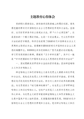 主题教育心得体会党的XX大报告指出,继续推进实践基础上的理论创新,首先要把握好新时代中国特色社会主义思想的世界观和方法论,坚持好、运用好贯穿其中的立场观点方法,即六个必须坚持。这是报告的一个重大理论贡献,也是一个突出亮点。它从世界观和方法论的哲学高度,科学总结提炼了XXX新时代中国特色社会主义思想的立场观点方法,是理解把握XXX新时代中国特色社会主义思想的精髓所在。XXXXXX在参加党的XX大广西代表团讨论时强调,学习贯彻党的XX大精神,要做到五个牢牢把握,其中之一就是牢牢把握新时代中国特色社会主义思想的世界观和方法论一、深刻理解其世界观和方法论的哲学根基:坚持辩证唯物主义和历史唯物主义辩证唯物主义和历史唯物主义是马克思主义最根本的世界观和方法论,是构成马克思主义科学理论体系的哲学基础。哲学是理论化系统化的世界观和方法论,作为对人类知识成果的高度概括,马克思视其为时代精神的精华。马克思主义哲学即辩证唯物主义和历史唯物主义,它的产生实现了人类哲学思想史上的伟大革命。马克思主义的哲学就是辩证唯物主义和历史唯物主义这是中国共产党人始终坚持、反复强调的重要思想。XXX新时代中国特色社会主义思想的世界观和方法论,是对辩证唯物主义和历史唯物主义在新时代的守正创新。XXXXXX指出:马克思主义哲学尽管诞生在一个半世纪之前,但由于它深刻揭示了客观世界特别是人类社会发展一般规律,被历史和实践证明是科学的理论,在当今时代依然有着强大生命力,依然是指导我们共产党人前进的强大思想武器。党的十八大以来,以XXX同志为核心的党中央运用辩证唯物主义和历史唯物主义的世界观和方法论对关系新时代党和国家事业发展的一系列重大理论和实践问题进行了深邃思考和科学判断,就新时代坚持和发展什么样的中国特色社会主义怎样坚持和发展中国特色社会主义,建设什么样的社会主义现代化强国、怎样建设社会主义现代化强国,建设什么样的长期执政的马克思主义政党、怎样建设长期执政的马克思主义政党等重大时代课题,提出一系列原创性的治国理政新理念新思想新战略,形成了XXX新时代中国特色社会主义思想,丰富和发展了辩证唯物主义和历史唯物主义的世界观和方法论。这一理论成果坚持运用辩证唯物主义和历史唯物主义来解决中国实际问题,强调学习掌握世界统一于物质、物质决定意识的原理,坚持从客观实际出发制定政策、推动工作;强调学习掌握事物矛盾运动的基本原理,不断强化问题意识,积极解决前进中遇到的矛盾;强调学习掌握唯物辩证法的根本方法,不断增强辩证思维能力,提高处理复杂问题的本领;强调学习掌握认识和实践辩证关系的原理,坚持实践第一的观点,不断推进实践基础上的理论创新;强调学习掌握社会基本矛盾分析法,深入理解全面深化改革的重要性和紧迫性强调学习掌握物质生产是社会生活的基础的观点,准确把握全面深化改革的重大关系;强调学习掌握人民群众是历史创造者的观点,紧紧依靠人民推进改革等。可以说,XXX新时代中国特色社会主义思想的世界观和方法论,沿着马克思主义世界观和方法论的逻辑理路,守着辩证唯物主义和历史唯物主义之正,把马克思主义的辩证唯物主义和历史唯物主义同新时代中国具体实际相结合在科学回答一系列根本问题中开辟了马克思主义中国化时代化新境界。二、深刻领悟其世界观和方法论的基本要求:贯穿立场观点方法的六个坚持毛泽东同志曾明确提出,对待马克思列宁主义有两种互相对立的态度:一种是主观主义的态度,只会片面地引用马克思、恩格斯、列宁、斯大林的个别词句,而不会运用他们的立场观点和方法;另一种是马克思列宁主义的态度,是为着解决中国革命的理论问题和策略问题而去从它找立场,找观点,找方法的。以毛泽东同志为主要代表的中国共产党人坚持以马克思主义为指导,运用马克思主义立场观点方法来观察中国社会,分析、解决中国实际问题。XXXXXX指出:坚持马克思主义,最重要的是坚持马克思主义基本原理和贯穿其中的立场、观点、方法这是马克思主义的精髓和活的灵魂,强调坚持以马克思主义为指导,首先要解决真懂真信的问题核心要解决好为什么人的问题最终要落实到怎么用上来。把握好XXX新时代中国特色社会主义思想的世界观和方法论,要坚持运用好贯穿其中的立场观点方法,做到六个坚持,即坚持人民至上、坚持自信自立、坚持守正创新、坚持问题导向、坚持系统观念、坚持胸怀天下。坚持人民至上,就是要求站稳人民立场、把握人民愿望、尊重人民创造、集中人民智慧;坚持自立自信,就是要求坚定道路自信、理论自信、制度自信、文化自信,做到自立自强;坚持守正创新,就是要求不忘本来、面向未来,以科学的态度和真理的精神,不断开拓进取;坚持问题导向,就是要求聚焦改革发展实践中的重大突出问题和深层次问题,不断提出解决难题的新理念新思路新办法;坚持系统观念,就是要求不断提高战