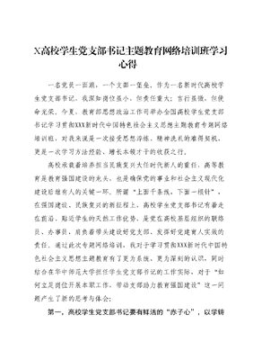 X高校学生党支部书记主题教育网络培训班学习心得一名党员一面旗,一个支部一堡垒。作为一名新时代高校学生党支部书记,我深知岗位虽小,但责任重大;言行虽微,但使命光荣。今夏,教育部思想政治工作司举办全国高校学生党支部书记学习贯彻XXX新时代中国特色社会主义思想主题教育专题网络培训班,对我来说是一次接受思想淬炼、精神洗礼的难得契机,更是一次学习方法经验、增长本领才干的收获之行。高校承载着培养担当民族复兴大任时代新人的重任,高等教育是教育强国建设的龙头,也是确保党的事业和社会主义现代化建设后继有人的关键一环。所谓上面千条线,下面一根针,在强国建设、民族复兴的新征程上,高校学生党支部书记有着走在前沿、贴近学生的天然工作优势,是党在高校基层组织的联络员、办事员,肩负着带头建设好党支部、发挥好党建育人实效的责任。通过此次专题网络培训,我对于学习贯彻XXX新时代中国特色社会主义思想主题教育有了更为系统、更为深刻的认识,同时结合在华中师范大学担任学生党支部书记的工作实际,对于如何立足岗位开展本职工作,带动支部助力教育强国建设这一问题产生了新的思考与体会:第一,高校学生党支部书记要有鲜活的赤子心,以学铸魂,守好政治关。此次培训对我的最深影响,就在于补足了精神之钙,充满了思想之电。思想上的统一,是党的团结最深厚、最持久最可靠的保证。XXXXXX在中共中央政治局第五次集体学习时强调我们要建设的教育强国,是中国特色社会主义教育强国,必须以坚持党对教育事业的全面领导为根本保证。身为部属师范大学的学生党支部书记,我们首先要坚定理想信念,在加快建设教育强国的新征程上坚定不移听党话、跟党走,擦亮信仰底色,把稳思想之舵。其次是要铸牢对党忠诚,我们要始终把共产党员当成自己的第一身份,把为党工作当成第一职责,做到对党忠诚、为党分忧、为党尽责,锚定为党育人、为国育才这一根本目标,带动支部党员争做在社会主义现代化建设中可堪大用、能担重任的栋梁之才。最后还要站稳人民立场,师范大学学生党支部书记不仅要上接天线,了解国家教育政策,服务教育强国战略,同时也要下接地气,关注百姓教育需求,聚焦教育薄弱环节,带领支部走在教育研究前沿、改革一线,问计问需、群策群力,发挥专业优势,为办好人民满意的教育而矢志奋斗。第二,高校学生党支部书记要有旺盛的求知欲,以学增智,守好理论关。此次培训为我们提供了一个系统化学习理论、领会精神的广阔平台,是用心用情用力推动主题教育往深里走、往心里走、往实里走的生动体现。建设教育强国要以教育理念、体系、制度、内容、方法、治理现代化为基本路径,这就需要有科学的思想理论作为指引、提供遵循,而XXX新时代中国特色社会主义思想正是我们找准方向、吸收智慧、汲取力量的源头活水、真理宝库。在培训期间,我始终坚持读原著、学原文、悟原理,通过原原本本、反反复复地学习,进一步学习领会了XXX新时代中国特色社会主义思想的科学体系、核心要义、实践要求,并深切感觉到这一重要思想的世界观和方法论使我们大为受用、大获裨益。坚持好、运用好其中的立场观点方法,能够帮助我们更好地实现教育理论与实践的相互转化,助力推动教育强国建设。支部书记作为支部建设的带头人,除去自身学习提高理论水平,还应该结合工作实际,带领支部全员打出一套理论学习的连环招组合拳。在工作中,我发现党支部成员在理论学习中存在学习时间碎片化、目标模糊化、过程浅表化等问题,因此提出一学期共读一本书、每一月共议一章节的学习模式,帮助支部成员在导读、精读、研讨、反思的过程中全面系统地夯实理论基础,筑牢知识体系。在围坐讨论的过程中,支部成员共享学习感悟、共学思想理论、共议问题困惑,力争做到学深悟透、融会贯通、真信笃行逐渐成长为活字典政策通。第三,高校学生党支部书记要有十足的踏实劲,以学正风,守好作风关。此次培训不仅是思想理论的提升,更是党性作风的浸润。学生党支部书记要牢记三个务必,找准自身定位,用好工作方法,对自己应当履什么职、尽什么责心中有数。XXXXXX多次强调调查研究的极端重要性,指出:调查研究是我们党的传家宝,是做好各项工作的基本功。作为高校基层党支书,我们不仅要在学校学院内把强化思想的阵地建好,更要在广阔社会中把施展才干的舞台搭好。因此,只有将调研工作做细做实做好,弘扬好务实之风,我们才能真正使育人工作与国家战略、社会需求、人民期盼相结合,为教育强国建设贡献自身的智慧力量。为响应在全党大兴调查研究之风的号召,支部深入九个乡镇开展乡村调研,收集了20个优秀党员故事、20个基层榜样故事以及20个乡村振兴故事,并汇编成册。通过调研,支部成员更加直观地领略了党建引领下乡村振兴的变革性实践、突破性成果,更加深切地感受到了基层榜样背后的爱国主义精神、艰苦奋斗品格,耳濡目染、