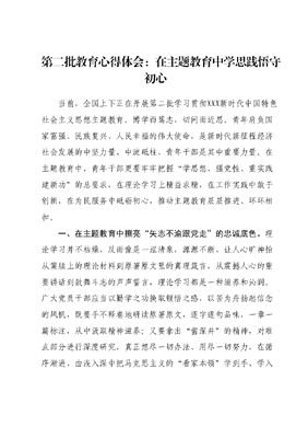 第二批教育心得体会:在主题教育中学思践悟守初心当前,全国上下正在开展第二批学习贯彻XXX新时代中国特色社会主义思想主题教育。博学而笃志,切问而近思。青年肩负国家富强、民族复兴、人民幸福的伟大使命,是新时代新征程经济社会发展的中坚力量、中流砥柱,青年干部是其中重要力量。在主题教育中,青年干部更要牢牢把握学思想、强党性、重实践建新功的总要求,在理论学习上精益求精,在工作实践中敢于创新,在为民服务中砥砺初心,推动主题教育层层推进、环环相扣。一、在主题教育中擦亮矢志不渝跟党走的忠诚底色。理论学习并不枯燥,反而像是一泓清泉,源源不断,让人心旷神怡从案牍上的理论材料到原著原文里的真理箴言,从震撼人心的重要讲话到鼓舞斗志的声声誓言,理论学习都是一种滋养和沁润。广大党员干部应当以勤学之功换取顿悟之感,以苦为舟扬起信念的风帆,既要手不释卷地研读原著原文,逐字逐句品味,一章一篇标注,从中汲取精神滋养;又要拿出凿深井的精神,对难点部分进行深度研究,真正想尽一切办法、用尽一切努力,在循序渐进、由浅入深中把马克思主义的看家本领学到手、学入心。只有这样,才能以理论的清醒带来政治的坚定,不断擦亮矢志不渝跟党走的忠诚底色。作为青年干部,要多一点学习多一点思考,少一点应酬、少一点躺平,利用好空余时间,让学习时间再多一些,把碎片化的时间加在一起,把挤出来的时间揉成团,通过原原本本读原著、学原文、悟原理,向实践学习向人民学习,努力掌握XXX新时代中国特色社会主义思想中蕴含的领导方法、思想方法、工作方法,提高适应新时代、实现新目标落实新部署的工作能力和履职本领。二、在主题教育中擦亮吹尽狂沙始到金的奋斗底色。看似寻常最奇崛,成如容易却艰辛。时代是出卷人,不同的发展阶段有着不同的考卷。过去的成功意味着我们走对了路用尽了力量。然而,未来的胜利还需要我们继续脚踏实地,勤勉奋斗。我们深信,在党的领导下,蓝图和梦想必将如期实现。广大党员干部要充分利用主题教育这一宝贵机会,不断拓宽知识面提升能力,磨练意志,焕发奋斗精神。从一点一滴为人民服务做起,拿出不获全胜决不收兵的决心,展现敢为人先的勇气,发挥顽强拼搏的韧性。我们要真正成为新时代的答卷人,用非同寻常地努力去实现吹尽狂沙始到金的奋斗目标年轻人就要有年轻人的办法,要具备扛大旗的实践能力在关键时刻能够顶得上、靠得住。要提升与时俱进的能力,时刻保持常学常新的态度,不断拓宽工作思路、创新工作方法,重点关注新变化、新要求,确保工作举措接地气、有实效。善于总结工作办法,在不同办法中做乘法,取其精华、去其糟粕,不断提升、不断升华,做业务上的明白人有心人,锤炼人无我有、人有我优、人优我强的实践本领。三、在主题教育中擦亮一枝一叶总关情的为民底色。江山就是人民,人民就是江山。我们党始终以人民对美好生活的向往为奋斗目标,这是初心的坚守,是使命的担当,更是承诺与责任。在新时代十年的征程中,在XXX新时代中国特色社会主义思想的指引下,数以万计的干部勇往直前,攻坚克难,以忘我的奋斗和拼搏铸就了非凡的业绩,如脱贫攻坚的卓越成就和抗击疫情的伟大史诗。这是团结的力量,是初心和情怀的力量,更是理论生命力的现实体现。广大党员干部应当坚持初心,汲取源源不断的动力,应始终以群众的期盼为依归,倾听群众的心声,积极解决实际问题,应以实际行动为己任,真正落实我将无我,不负人民的追求,以实际行动展现对人民的深情厚谊和为民底色。青年干部要厚植人民至上的情怀,干字当头,多深入群众,多服务群众,以百姓的心为心,在实践中学习成长,在滚石上山的实践中强化斗争意识,练就出把前进道路上的苦辣酸甜变成营养的过硬功夫。时刻把群众的安危冷暖放在心上,以敬畏之心对待群众,以实际行动取信于民,当好群众的勤务员跑腿员和马前卒。在工作中敢于扛起重担,始终保持积极进取的良好精神状态,坚持高标准、严要求,在工作中体现落实,在实践中检验成效,把小我融入大我,用担当诠释忠诚,用实际行动谱写新时代为民服务的青春之歌。