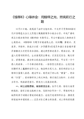 《榜样8》心得体会:用榜样之光,照亮前行之路12月21日晚,我观看了由中央组织部、中央学习贯彻XXX新时代中国特色社会主义思想主题教育领导小组办公室、中央广播电视总台联合制作的《榜样8》专题节目,节目中播出的人物事迹引让我感动。《榜样8》专题节目邀请钱七虎、刘玲、唐菊兴、吴琍惠芳、李桂科、热孜万古丽·沙吾提等6名党员和浙江省余姚市梁弄镇横坎头村党委参加录制,通过典型事迹展示、现场访谈、重温入党誓词等形式,生动展现突出事迹,以及坚定信念、践行宗旨、拼搏奉献、廉洁奉公的高尚品质和精神风范。节目里一个个感人的故事,一个个鲜活的形象,一份份坚定的誓言,让我们看到榜样身上蕴藏的信仰之力,饱含的为民之力,肩负的担当之力榜样力量催人奋进,透过节目,感受到了初心的重量、使命的力量,看到榜样身上的光和热,将以他们为标杆,主动担当作为,砥砺奋进前行,照亮为人民服务的路。一、树立进取思维,做信仰坚定者。信仰之塔,恰似大海里的航标,指引巨轮远航的方向。坚持30余年如一日,帮助有听力缺陷的孩子训练正常说话的能力,让他们逐渐回归社会,拥有美好前途和幸福家庭……正是对自己事业的热爱、对工作的进取激励着刘玲不断前进。今后,我将更加注重跟进学习榜样身上的琍不抛弃不放弃的进取精神,持续增进对XXX新时代中国特色社会主义思想的政治认同、思想认同、理论认同、情感认同,坚持从政治上看问题,把握大局大势,在重大问题上头脑清醒、态度坚决始终保持政治立场不移、政治方向不偏,坚定捍卫两个确立坚决做到两个维护。二、树立群众思维,做为民服务者。江山就是人民、人民就是江山。2005年,榜样吴惠芳放弃大城市优越的生活条件,选择自主择业回到家乡永联村。18年来,他将乡村建设当作第二战场推动形成四治融合的现代化乡村治理模式,带领全村党员群众一张蓝图绘到底,走出了一条强富美高的乡村振兴之路。榜样的力量是无穷的,要把对榜样的学习动力转化为带领全村百姓奔向共同富裕的实际行动。下一步我增强民本意识。要以服务群众为荣、以背离人民为耻,牢固树立向人民群众学习的观点,心系基层、情暖群众。求真务实,重在落实,贵在行动。单有主观上为人民服务的良好愿望和热情是远远不够的。全心全意为人民服务关键在全字,要做到尽心尽职,不遗余力,吃苦在前、克己奉公、无私奉献,要想干事、干好事、干成事,力争多掌握一些思想方法和工作方法。三、树立奋斗思维,做事业拼搏者。奋斗成就历史,实干创造未来。海南热带雨林国家公园管理局霸王岭分局高级工程师齐旭明,始终以为国家找到更多更好的地质矿产宝藏为己任,28年来坚持奔波在海拔4500米以上的青藏高原生命禁区;主持或参与勘查评价和发现多个大型—超大型铜多金属矿床,为缓解我国资源瓶颈作出了突出的贡献……进道路虽然崎岖不平,困难重重,但是,我们要奋力创造新的更大奇迹,去赢取新的更大胜利。不断提高把握新发展阶段、贯彻新发展理念、构建新发展格局的政治能力、战略眼光、专业水平,增强工作积极性、主动性、创造性,敢于担当、善于作为,不断提高与时代发展和事业要求相适应的素质和能力,就能把党中央决策部署贯彻落实好,创造出经得起历史和实践检验的实绩。《榜样8》给我们上了一堂鲜活生动的党课。榜样是一面镜子更是一种力量。我将以此次观看学习为契机,以榜样为标杆,充分发挥基层党组织战斗堡垒作用和广大党员先锋模范作用,以更饱满的精神状态投入到业务工作中,以更加坚定的政治信念、更加昂扬的精神状态、更加鲜明的创新举措,将主动把学习榜样精神与学习贯彻XXX新时代中国特色社会主义思想、扎实开展第二批主题教育结合起来,在持续推动事业高质量发展、全面建设社会主义现代化强国中作出自己应有的贡献。