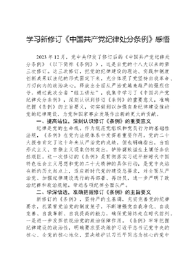 学习新修订《中国共产党纪律处分条例》感悟2023年12月,党中央印发了修订后的《中国共产党纪律处分条例》(以下简称《条例》),这是自党的十八大以来的第三次修订。这三次修订,把党的纪律建设的理论、实践和制度创新成果以法纪的形式固定下来,充分体现了党坚持自我革命、刀刃向内的政治决心,释放出全面从严治党越来越严的强烈信号。通过此次全省组工讲坛,我集中学习了《中国共产党纪律处分条例》,深刻认识到修订《条例》的重要意义,准确把握《条例》的主旨要义,切实做到以加强自身纪律建设推动党的纪律建设,为党和国家事业发展作出新的更大的贡献。一、提高站位,深刻认识修订《条例》的重要意义纪律是党的生命线。作为规范党组织和党员行为的基础性法规,《条例》在党内法规体系中发挥着重要作用。党的二十大报告肯定了这十年来从严治党的成绩,但也明确指出,当前形式主义、官僚主义现象仍较突出,铲除腐败滋生土壤任务依然艰巨。这一次修订的《条例》是贯彻落实习近平新时代中国特色社会主义思想和党的二十大精神的具体行动,是党中央站在新的历史起点上,适应新时代党的建设总要求,对全面从严治党、加强纪律建设进行的再部署、再动员,进一步严明了政治纪律和政治规矩,带动各项纪律全面从严。二、学深悟透,准确把握修订《条例》的主旨要义新修订的《条例》,坚持严的主基调,充实完善党的纪律要求,扎紧管党治党的制度笼子,不断增强党自我净化、自我完善、自我革新、自我提高的能力,确保党始终走在时代前列。一是进一步发挥依规治党的政治保障作用。《条例》牢牢把握纪律建设的政治性,明确要求坚决维护习近平总书记党中央的核心、全党的核心地位,坚决维护以习近平同志为核心的党中央权威和集中统一领导,把两个维护作为出发点和落脚点,旗帜鲜明地向全党全社会传达了坚定不移向习近平总书记和党中央对标看齐的政治决心和政治态度。二是进一步严明党的政治纪律和政治规矩。《条例》完善保障党中央政令畅通的纪律条款,在第五十六条中增写对不顾党和国家大局、搞部门或者地方保护主义行为的处分规定,将贯彻党中央决策部署只表态不落实行为由违反工作纪律调整到违反政治纪律。对维护党中央集中统一领导做出了具体指导,确保党员及各级党组织能够正确处理好保证中央政令畅通和立足实际创造性开展工作的关系。三是进一步促进纪法衔接纪法贯通。《条例》增写了执纪执法贯通,将党内法规和国家法律衔接协调进一步上升为执行原则,在坚持纪严于法、纪在法前的基础上,进一步要求纪法协同,精准执纪。除此之外,《条例》还进一步促进了党纪政务处分匹配,充实完善了从轻减轻处分、党纪处分影响期计算规则、首犯从重等规定。四是进一步完善严管厚爱相结合机制。《条例》坚持三个区分开来,深化运用监督执纪四种形态,区分一般违纪、轻微违纪和不追究责任,把从严管理监督和鼓励担当作为高度统一起来,引导干部牢固树立正确政绩观,专心致志为党和人民干事创业、建功立业。五是进一步突出纪律建设的全覆盖。《条例》对党员行为进一步覆盖到网上网下,要求党员干部网上网下保持一致;对政治纪律、工作纪律、生活纪律方面的违规违纪行为涵盖面更广,针对性更强;对离职和离退休党员违规违纪的纪律惩处更严密;对受请托人、新任官员的纪律要求更严格。真正做到了在党的纪律面前一律平等,在管党治党上,没有特殊党员,不留死角和空白。三、学以致用,强化自我使命担当通过这次学习使我认识到,作为一名党员,必须要遵守党的纪律,坚守初心使命,牢固树立四个意识,始终坚定四个自信,切实践行正确的权力观、政绩观、事业观,自觉遵守和维护党章,严格执行和维护党的纪律,自觉接受党的纪律约束,模范遵守国家法律法规。一要坚持理论学习,真正把《条例》牢记于心。坚持集中学习和个人自学相结合,做到原原本本认真学、联系实际深入学,在学习过程中把自己摆进去、把工作摆进去、把职责摆进去,充分学习《条例》原文、释义读本等,深入领会修订《条例》的重点内容和着力方向,做到熟知精通,学以致用,内化于心,外化于行。二要强化纪律意识,在工作生活中自觉践行《条例》。带头讲政治、守规矩,用实际行动将党的纪律严起来。时刻紧绷纪律规矩这根弦,做到心有所畏、言有所戒、行有所止,把严管视为厚爱,自觉做到政治坚定、公道正派、廉洁勤奋、求实创新,切实履行党和人民赋予的神圣职责。三要树立斗争意识,以实际行动捍卫《条例》权威。强化责任担当,勇于揭露和纠正违反党的原则的言行和工作中的缺点、错误,坚决同消极腐败现象作斗争。时刻牢记党的纪律规定,主动发挥党员先锋模范作用,以敢作敢为的工作作风,努力为党的各项事业发展贡献力量。