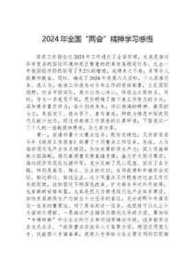 2024年全国两会精神学习感悟政府工作报告对2023年工作进行了全面回顾,尤其是面对异常复杂的国际环境和艰巨繁重的改革发展稳定任务,过去一年我国经济仍然取得了5.2%的增速,成绩来之不易,非常令人鼓舞和振奋。同时,确定了2024年发展六大目标,十大具体任务。我认为,政府工作报告对今年工作的安排部署,立足国际视野,切合中国实际,展示出信心决心,体现出大国担当。同时,作为一名党员干部,更加明确了接下来工作努力的方向,深知使命重在担当,奋斗创造未来,将以饱满的精神、高昂的斗志,真抓实干、埋头苦干、善作善成,积极为推进中国式现代化献计出力。经过对政府工作报告的认真研读,下面我谈一下个人的一些收获和感受,与大家分享。第一,安排部署十大重点任务,既有连续性,又有新要求今年《政府工作报告》部署了十项重点工作任务,包括,大力推进现代化产业体系建设,加快发展新质生产力;深入实施科教兴国战略,强化高质量发展基础支撑;着力扩大国内需求,推动经济实现良性循环等,充分反映了民心民意、回应了各方面,特别是基层、群众、企业的关切,各项政策和举措符合实际、贴近群众、贴近企业。这十项重点工作既有对过去工作任务的延续,比如坚定不移深化改革、扩大高水平对外开放等,也有新的安排布置,尤其是把大力推进现代化产业体系建设,加快发展新质生产力放在十大任务的首位,充分说明今年落实这一任务的重要性。对于落实好这一任务,我觉得可以从三个方面进行理解。一是推动产业链供应链优化升级方面,要加快专精特新中小企业向行业单项冠军梯次升级,逐步培育行业龙头企业。政策重点应放在人才集聚方面,建设应用型人才、技能型人才储备库,提高人才供给与企业需求间的匹配精度。二是积极培育新兴产业和未来产业方面,培育新兴产业和未来产业要建立创新型产业政策体系,在技术研发阶段,政策部门通过小额资助筛选出真正进行技术创新的企业。对技术研发取得初步成功的项目,继续提供大额资助,以加快推进成功项目的技术成熟。当技术成果进入商业化阶段,积极搭建投融资对接平台,促进技术项目与金融资本深度融合,助力科技成果商业化、产业化。三是深入推进数字经济创新发展方面,要着力建立以数字经济产业园区与科创走廊为载体的产业协同发展工作机制,统筹规划区域内各省市数字经济产业规划统筹工作,精准定位各地数字经济主导产业,逐步建立和完善错位竞争发展的数字经济产业政策体系。第二,民生工作提出明确具体新任务,回应民生关切,增进民生福祉。政府工作报告坚持以人民为中心的发展思想,履行好保基本、兜底线职责,采取更多惠民生、暖民心举措,扎实推进共同富裕,促进社会和谐稳定,不断增强人民群众的获得感、幸福感、安全感。一系列举措回应多群体、多层次的民生需求。聚焦报告中有力度、有温度的民生细节,一份民生清单跃然眼前。在教育、医疗、就业、收入等民生工作方面,政府工作报告都提出了明确具体的新任务,并在农村改革发展、城镇化、城市更新等方面关注到了种粮农民、农业转移人口、市民等多个群体的关切。重点来说,就业方面,稳就业政策在持续加力的基础上,增强了解决就业结构性矛盾的针对性,系列部署精准发力促进劳动力供需匹配,更大力度支持高校毕业生等重点群体就业和新业态就业人员权益保障,助力高质量充分就业。教育方面,常态化推动寄宿制学校教学和生活条件改善,保障农村学生健康成长、全面发展。促进消费方面,报告中的系列扩消费部署,从增强消费能力、改善消费环境、提升消费意愿、优化消费结构等多方面同向发力,有望进一步释放我国超大规模市场潜力,支撑经济运行持续回升向好。三农方面,启动实施第二轮土地承包到期后再延长30年整省试点,有利于进一步增强农业发展的预期和活力。报告提出适当提高小麦最低收购价,有助于稳定种粮收益预期,确保国家粮食安全。第三,预期发展目标务实、可靠、可行,体现了积极进取奋发有为的要求。2024年政府工作报告提出,今年GDP增速目标在5%左右。究其原因,第一,5%的目标增速与近年目标保持了连续性。第二,5%的目标增速和当前的潜在增长水平相符,具备实现的可能性。我认为,经济增长预期目标为5%左右,考虑了促进就业增收、防范化解风险等需要,并与十四五规划和基本实现现代化的目标相衔接,也考虑了经济增长潜力和支撑条件,体现了积极进取、奋发有为的要求。实现今年预期目标并非易事,需要政策聚焦发力、工作加倍努力、各方面齐心协力。中国经济已经走过了过度依赖数量和速度的阶段,逐步步入质量和效率的轨道。构建新发展格局、实现高质量发展、提高新质生产力,都是依据经济发展转型的需要提出的,也是中国经济摆脱数量路径、速度依赖的重要体现。尤其面对国际竞争加剧、打压和遏制中国发展的阻力加大,中国必须走高质量发展和创新之路,必须用更高的质量标准和效率目标来提升中国经济的国际竞争力、核心竞争力。经济实力强不
