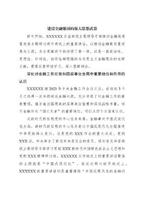 建设金融强国的强大思想武器新年伊始,XXXXXX在省部级主要领导干部推动金融高质量发展专题研讨班开班式上的重要讲话,以推动金融高质量发展为主题,为全党高级干部讲授了第一课。这是一篇政治性、思想性、针对性、指导性都很强的马克思主义金融理论的光辉文献,需要反复研读学习、深入理解领会。深化对金融工作在党和国家事业全局中重要地位和作用的认识XXXXXX继2023年中央金融工作会议之后,在短短3个月之内再一次专题阐述金融问题,充分体现了对金融工作的高度重视,蕴含着治国理政的深厚政治智慧和深远战略考量。对于金融作为国之大者的重要地位,可以从四个方面来认识。从新时代新征程党的中心任务来看,金融事关中国式现代化全局。新时代新征程的中心任务是以中国式现代化全面推进中华民族伟大复兴,这是党的XXX作出的重大决定。党的XXX后,中央举办了新进中央委员会的委员、候补委员和省部级主要领导干部学习贯彻XXX新时代中国特色社会主义思想和党的XXX精神研讨班,XXXXXX在开班式上的重要讲话聚焦的主题就是中国式现代化。在这次研讨班开班式上,XXXXXX的重要讲话则是着重围绕中国式现代化的金融问题而展开的。为什么要讲金融问题呢?因为金融是现代经济的核心,是国民经济的血脉,建设金融强国是建设社会主义现代化强国的战略任务和必然要求。做不好金融工作,没有金融的高质量发展,就没有整个经济社会的高质量发展,就不可能顺利实现中国式现代化。只有坚定不移走中国特色金融发展之路、推动我国金融高质量发展,才能为实现新时代新征程党的中心任务提供强有力的金融支撑。从百年大变局的国际形势来看,金融是大国博弈的必争之地。金融是国家重要的核心竞争力,金融改革发展是国家改革发展的重要内容,金融安全是国家安全的重要组成部分。历史上,大国崛起都离不开强大金融体系的关键支撑。当今世界,金融之战的烈度和影响程度,甚至超过武装冲突和科技之争。而且,在武装冲突和科技之争背后,金融制裁的手段都发挥着重要作用。我国现已成为金融大国,但还不是金融强国。只有加快建设金融强国,不断提高我国在国际金融中的竞争力和话语权,才能掌握大国博弈的主动权。从国内经济形势来看,防范化解金融风险仍任重道远。金融既十分重要,也极易产生风险。当前和今后一个时期,我国金融领域处在风险易发高发期。在2017年全国金融工作会议、2023年中央金融工作会议和这一次研讨班开班式上的重要讲话文可居文库——海量学习资料,手机电脑均可下载www.wenkeju.com中,XXXXXX都突出强调了防范化解金融风险问题。改革开放40多年来,我国没有发生过金融危机,这在世界大国中独一无二。但是,这并不表明一切都风平浪静。20世纪90年代我们出现过金融三乱现象,几家大银行事实上陷入过技术性困境。当前,中小金融机构风险、地方债务风险、房地产领域金融风险、非法金融活动风险等尤为突出,风险持续恶化,存量风险尚未见底,增量风险仍在集聚,而且金融风险的隐蔽性、突发性、传染性、破坏性特别强,处理不善极易引发社会风险、政治风险,决不能掉以轻心。只有增强忧患意识,坚持底线思维、极限思维,下决心从根本上解决金融领域的矛盾问题,牢牢守住不发生系统性金融风险的底线,才能确保国家安全和社会稳定。从干部队伍状况来看,提高金融工作本领、加强金融监督管理极为紧迫。金融领域权力集中、资金密集、资源富集,既是国之重器,也是腐败问题易发高发频发的重灾区。做好金融工作,要求各级领导干部特别是金融干部队伍必须政治过硬、能力过硬、作风过硬。当前金融领域的种种问题乱象很多是人为因素造成的。不少领导干部对金融工作知之不多、知之不深,存在比较严重的本领恐慌。特别是一些人政绩观扭曲,缺乏金融工作常识,违背金融市场规律,拍脑袋决策、文可居文库——海量学习资料,手机电脑均可下载www.wenkeju.com拍胸脯蛮干、拍屁股走人,肆意乱为、胡作非为造成了不可挽回的重大损失。更有甚者,一些人胆大妄为,靠金融吃金融,内外勾结、滥权敛财、贪婪无度。可见,提高领导干部金融工作本领,加大金融领域反腐败力度,是当前金融干部队伍建设的一项当务之急。深化对我们党探索中国特色金融发展之路历史进程的认识我们党历来高度重视金融工作,不断深化对金融工作的认识,不懈探索符合我国实际的金融发展道路。新民主主义革命时期。毛泽东非常重视金融工作,领导我们党早在苏维埃时期就发行了货币、设立了国家银行。延安时期,毛泽东将调整金融关系明确写入《陕甘宁边区施政纲领》,他还强调:认识贸易、金融、财政是组织全部经济生活的重要环节,离了它们,或对它们采取了错误方针,全部经济生活就会停滞,或受到障碍。我们党在抗日根据地和解放区陆续建立起有效的货币金融体系,有力地支持了根据地建设和武装斗争。但这一时