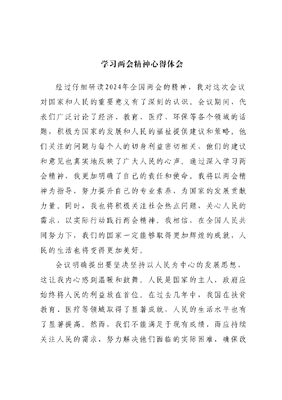 学习两会精神心得体会经过仔细研读2024年全国两会的精神,我对这次会议对国家和人民的重要意义有了深刻的认识。会议期间,代表们广泛讨论了经济、教育、医疗、环保等各个领域的话题,积极为国家的发展和人民的福祉提供建议和策略。他们关注的问题与每个人的切身利益密切相关,他们的建议和意见也真实地反映了广大人民的心声。通过深入学习两会精神,我更加明确了自己的责任和使命。我将以两会精神为指导,努力提升自己的专业素养,为国家的发展贡献力量。同时,我也将积极关注社会热点问题,关心人民的需求,以实际行动践行两会精神。我相信,在全国人民共同努力下,我们的国家一定能够取得更加辉煌的成就,人民的生活也将变得更加美好。会议明确提出要坚决坚持以人民为中心的发展思想,这让我内心感到温暖和鼓舞。人民是国家的主人,政府应始终将人民的利益放在首位。在过去几年中,我国在扶贫教育、医疗等领域取得了显著成就,人民的生活水平也有了显著提高。然而,我们不能满足于现有成绩,而应持续关注人民的需求,努力解决他们面临的实际困难,确保改革发展的成果惠及更多人群。以人民为中心的发展思想是我们党和政府的宗旨,也是我们不断前进的动力源泉。我们要时刻牢记人民的利益,将人民的满意度作为衡量工作成效的重要标准。在扶贫工作中,要加大力度,确保贫困人口如期脱贫,实现全面建设小康社会的目标。在教育领域,要不断提高教育质量,促进教育公平,让每个孩子都能享受到优质的教育资源。在医疗卫生方面,要进一步完善医疗保障体系,提高医疗服务水平,解决人民群众就医困难和高费用的问题。同时,我们还要关注人民的精神需求,加强文化建设,丰富人民的精神生活。要加强社会治安综合治理,维护社会稳定,让人民群众在和谐安定的环境中生活。要不断改进工作作风,密切联系群众,倾听人民的呼声,切实解决人民群众关心的热点难点问题。会议特别强调了创新和科技的关键意义。作为引领发展的主要动力,创新是战胜困难的有力武器。在当前全球舞台上,科技发展日新月异,竞争态势日益激烈。因此,我们必须加大对科技创新的投入力度,提升自主创新能力加强知识产权保护,为经济社会的进步注入新的动力源泉创新是推动社会进步的核心力量,只有不断创新,才能在激烈的市场竞争中脱颖而出。我们要鼓励企业增加研发投文可居文库——海量学习资料,手机电脑均可下载www.wenkeju.com入,培养创新型人才,营造良好的创新创业环境,让创新的火花在各个领域迸发。科技是解决现实问题的关键手段面对各种挑战和困难,科技的进步为我们提供了更多解决方案。我们要加强基础研究,提高科技成果转化效率,推动科技与经济的深度融合,以科技创新驱动产业升级,提高国家的核心竞争力。知识产权保护是创新和科技发展的重要保障。我们要加强法律法规建设,加大对侵权行为的打击力度,保护创新成果和知识产权,激发创新主体的积极性和创造力。此外,会议还对环保、教育、医疗等领域的改革提出了具体要求。这些改革都涉及人民的切身利益,也关系到国家的长远发展。我们要积极支持和参与这些改革,为建设美丽中国、健康中国、教育强国贡献自己的力量。总之,通过学习2024年全国两会精神,我对国家的发展充满信心,也对自己的未来充满期待。我相信,在党的领导下,我们一定能够实现中华民族的伟大复兴,让我们的国家更加繁荣昌盛,人民更加幸福安康。作为一名〔具体身份〕,我也将牢记自己的使命和责任,努力工作,为国家和人民的事业贡献自己的力量。文可居文库——海量学习资料,手机电脑均可下载www.wenkeju.com