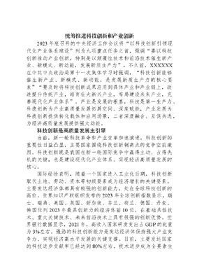 统筹推进科技创新和产业创新2023年底召开的中央经济工作会议将以科技创新引领现代化产业体系建设列为九项重点任务之首,强调要以科技创新推动产业创新,特别是以颠覆性技术和前沿技术催生新产业、新模式、新动能,发展新质生产力。不久前,XXXXXX在中共中央政治局第十一次集体学习时强调,科技创新能够催生新产业、新模式、新动能,是发展新质生产力的核心要素要及时将科技创新成果应用到具体产业和产业链上,改造提升传统产业,培育壮大新兴产业,布局建设未来产业,完善现代化产业体系。产业是发展的根基,科技是第一生产力。科技创新为产业高质量发展拓展空间、深度赋能,产业发展为科技创新提供转化载体和应用场景,二者深度融合、互促共进,为经济高质量发展提供强大动能。科技创新是高质量发展主引擎当前,新一轮科技革命和产业变革加速演进,科技创新的重要性日益凸显,主要国家围绕科技创新制高点的竞争空前激烈。科技创新既是我国在新一轮国际竞争中赢得主动、占得先机的关键,也是建设现代化产业体系、实现经济高质量发展的核心。国际经验表明,随着一个国家进入工业化后期,科技创新取代土地、劳动、资本等初级要素成为经济增长的关键要素。主要发达经济体都具有较强的创新能力,处在全球科技创新的高位。世界知识产权组织发布的2023年全球创新指数显示,瑞士、瑞典、美国、英国、新加坡、芬兰、荷兰、德国、丹麦、韩国位列2023年最具创新力的经济体前10位,在基础共性技术、重大关键技术、未来前沿技术上具有很强的创新优势。世界银行数据显示,2021年,高收入国家研发支出占GDP的比重为3%左右。强劲的科技创新能力是发达经济体保持强大产业竞争力、实现经济高水平发展的关键支撑。目前,主要发达国家的科技进步贡献率已经达到80%左右,技术进步成为全要素生产率提升的主要因素。随着我国进入发展新阶段,以科技创新推动产业创新是经济高质量发展的必然选择。当前,新旧动能转换成为经济高质量发展的关键,面对劳动、资本等传统要素投入增长动能减弱,加快培育壮大科技创新、人力资本等新增长动能形势紧迫、至关重要。经过多年发展建设,我国研发投入、人力资本、创新平台等科技创新条件不断改善,为产业创新发展提供了支撑。2022年,我国全社会研发经费投入突破3万亿元大关,研发经费投入强度提升到2.54%。目前,我国拥有深圳—香港—广州北京、上海—苏州等全球顶级科技创新集群,科技人才规模不断扩大、结构不断优化,研发人员全时当量由2012年的324.7万人年提高到2022年的635.4万人年,稳居世界首位,入选世界高被引科学家数量从2014年的111人次增至2022年的1169人次,排名世界第二。同时,我国以产业创新中心、制造业创新中心、技术创新中心等为主的创新平台体系不断完善,重大关键技术领域追赶步伐加快,新兴前沿技术领域不断取得突破,制约产业转型发展的技术短板正在逐渐被补齐并在部分领域锻长。综合来看,我国创新能力快速提升、技术突破积厚成势,为产业结构升级、路径模式转型、国际竞争力提升提供了坚实支撑,也为经济高质量发展积蓄了新动能。为现代化产业体系固本培元加快建设现代化产业体系,迫切要求实现高水平科技自立自强,在固本培元中塑造高质量发展新优势,形成技术供给和场景需求互动演进的持续创新能力,提升具有国际竞争力和技术主导权的产业高质量发展能力。经过改革开放40多年的快速发展,我国已经进入发展优势、产业结构、路径模式的深度转型调整时期。放眼全球,我国产业体系优势独具,科技创新势头向好,以科技创新推动产业创新既具有深厚坚实的基础条件支撑,也是加快新旧动能转换、建设现代化产业体系的关键路径。文可居文库——海量学习资料,手机电脑均可下载www.wenkeju.com传统产业改造提升需要科技创新赋能。传统产业是制造业的基本盘、参与国际竞争的压舱石,但是存在低端产品过剩、高端供给不足、发展模式粗放、要素约束趋紧、出口市场冲击等问题,亟待重构发展路径模式、重塑产业竞争优势。二十届中央财经委员会第一次会议指出,坚持推动传统产业转型升级,不能当成低端产业简单退出。传统产业转型升级的核心还是要解决效率效益问题。2023年,我国规上工业企业营业收入利润率为5.76%,其中,农副食品加工业为2.57%,纺织业为3.67%,计算机、通信和其他电子设备制造业为4.24%。传统产业改造提升需要在技术端发力,通过高端化、智能化、绿色化技术创新突破,全面推动技术、工艺、装备和产品升级,进一步拓展增效率、提品质、优结构的发展空间。只有以技术创新为支撑,才能实现传统产业向上向优向新向绿改造提升,更好满足高端化品质化差异化市场需求。实现产业自主可控亟待科技创新攻关。受压缩式工业化进程和嵌入式国际分工合作路径影响,跨国企业在产业链治理和供应