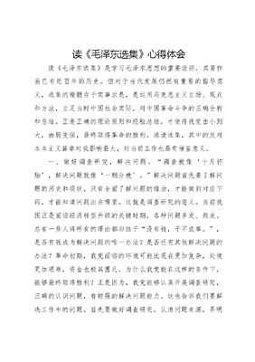 读《毛泽东选集》心得体会读《毛泽东选集》是学习毛泽东思想的重要途径,其著作虽已有近百年的历史,但对于当代发展仍然有重要的指导意义,选集的精髓在于实事求是,是运用马克思主义立场、观点和方法,立足当时中国社会实际,对中国革命斗争的正确分析和总结。正是正确的理论原则和经验总结,才使得我党由小到大,由弱变强,最终取得革命的胜利。通读选集,其中的反对本本主义篇章对我影响最大,对当前工作也最有借鉴意义。一、做好调查研究,解决问题。调查就像十月怀胎,解决问题就像一朝分娩。解决问题首先要了解问题的历史和现状,只有全面了解问题的缘由,才能做到对症下药,才能知道问题出在哪里。这就是调查研究的意义。当前我国正是面临经济转型升级的关键时期,各种问题多发、频发。总有一些人将所有的理由都归结于没有钱,干不成事。,是否有钱成为解决问题的唯一办法?是否还有其他解决问题的办法?革命初期,我党面临的环境可能比现在更加复杂,处境更加艰难,资金也极其匮乏,为什么我党能在这样的条件下,能够最终取得胜利?正是因为,我党能够认真开展调查研究,正确的认识问题,有较强的解决问题能力。这也告诉我们要解决工作中的问题,首先要做好调查研究,认清问题来源,弄明白现状,立足实际,考虑有什么样的条件,解决目前的问题。二、反对本本主义,注重实际。为什么反对本本主义?因为本本主义的危害极大,我党初期革命斗争的失利,在于盛行本本主义,照搬马克思主义思想、俄国十月革命的成功做法,这种脱离中国实际的做法,让我党付出惨重的代价。我们所反对的本本主义,实际上是反对脱离实际情况的本本主义。我们需要本本,本本为我们提供理论指导,但必须与实际情况相结合,在实践中证明对的才是我们需要的本本。毛泽东思想的成功就是最好的例子,为什么说它是中国化的第一次历史性飞跃?正因为其运用马克思主义思想,结合中国实际情况,正确的分析、解决当时中国革命的现实问题,是马克思主义中国化的第一次成功运用。因此,只有立足实际,才能避免本本主义,真正了解国情、评估各阶级相互关系,制定正确的政策,才能深入群众,争取群众的支持。我们在工作中,特别是制定地方方案、政策时,要认真调研本地实际情况,结合实情制定政策,才能避免出现政策打架、落实困难、群众不服的情况。三、提高决策能力,与时俱进。在经济下行压力增大,矛盾日益走向尖锐的形势下,更考验着我们领导干部的决策能力。在《反对本本主义》一文中,毛泽东就指出:共产党的文可居文库——海量学习资料,手机电脑均可下载www.wenkeju.com正确而不动摇的斗争策略,绝不是少数人坐在房子里能都产生的,他是要在群众的斗争过程中才能产生的,这就是说要在实际经验中才能产生。因此,我们需要时时了解社会情况,时时进行实际调查。这告诉我们不能一成不变,要不断学习正确的理论知识,学习成功经验,更要有独立思考的能力,经常进行调查研究,了解实际情况,做到与时俱进,作出正确的决策。四、总结调查方法,做好调研。总结《反对本本主义》文中的调研方法,主要是开调查会作讨论式的调查、组织有经验的人参与调查会、开调研会的人员不少于三人、确定调查纲目、要亲自调查、要深入调查、要自己做好记录。同时,做调查研究时也要学习借鉴陈云提出的调查研究十五字决不唯上、不唯书、只唯实,交换、比较、反复。整体上来说,就是要做到了解实情,全面认识问题,认真比较利害关系,反复论证决策正确性。读了这本书后,使我对中国革命有了更加深刻的认识,更深深地体会到共产党建立新中国的伟大,那真是用千百万烈士的鲜血换来的新中国,是那些革命的先驱用他们的智慧、他们的意志、他们大无畏的勇气建立了一个新中国,从而也知道了他们为什么伟大。这本书表现的就是中国革命史最重要的一文可居文库——海量学习资料,手机电脑均可下载www.wenkeju.com段。历史造就了英雄,英雄也创造了历史,艰难困苦玉汝于成。文可居文库——海量学习资料,手机电脑均可下载www.wenkeju.com