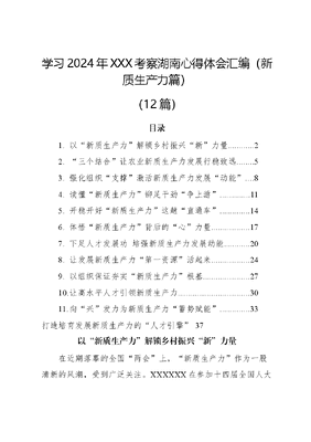 学习2024年XXX考察湖南心得体会汇编(新质生产力篇) (12篇)目录1.以新质生产力解锁乡村振兴新力量22.三个结合让农业新质生产力发展行稳致远..53.强化组织支撑激活新质生产力发展动能.84.读懂新质生产力铆足干劲争上游..115.开稳开好新质生产力这趟直通车..146.体悟新质生产力背后的心力量177.下足人才发展功 培强新质生产力发展动能208.让发展新质生产力第一资源活起来249.以组织保证夯实新质生产力根基.2710.让高水平人才引领新质生产力.3011.向兴发力为新质生产力蓄势赋能..33打造培育发展新质生产力的人才引擎37以新质生产力解锁乡村振兴新力量在近期落幕的全国两会上,新质生产力作为一股清新的风潮,受到广泛关注。XXXXXX在参加十四届全国人大二次会议江苏代表团审议时,再次强调:要牢牢把握高质量发展这个首要任务,因地制宜发展新质生产力。全国两会结束不到一周,XXXXXX赴湖南考察,并在长沙主持召开新时代推动中部地区崛起座谈会,发表重要讲话,对新质生产力的强调进一步突显了其在乡村振兴中的核心地位。这种新生产力,代表了融合性与创新性的经济活力,对乡村振兴战略具有不可估量的赋能作用。立足新征程新起点,广袤田野正成为展现新质生产力的新赛道,承载着乡村振兴战略的重大使命。以新质生产力的本质,解锁乡村振兴新力量,实现宜业宜居和美丽乡村建设的新潮流,是推动乡村向新方向发展的关键。以新为出发点,聚焦科技成果转化,守牢创新主阵地。科技创新是推动国家繁荣、民族复兴、人民幸福的重要支柱,科技创新和科技成果应跨出学校、研究所,深入到广阔的乡村领域,成为推动乡村振兴的实际力量。利用现代农业科技赋能产业发展,应用互联网信息技术提升工作效率,以及通过新能源技术确保乡村的安全生产,新技术新手段新方法正在基层沃土中生根发芽。加强政策支持,鼓励产学研的协同创新,利用科技市场的广阔,定期组织科技成果推介会,企文可居文库——海量学习资料,手机电脑均可下载www.wenkeju.com业需求对接会,让知产顺畅转变为资产,鼓励基层从业者勇于创新,大胆实践。以质为立足点,厚植乡村资源沃土,垒砌产业黄金台。产业的兴旺是发展生产力的基础,优良的产业质量是新质生产力的标志。新质生产力的形成和壮大,必将全面提升产业发展的层次,加速现代化经济体系的建立,创造巨大经济价值。积极培育新质生产力,拓宽绿水青山就是金山银山理念的生态路径,发挥千村示范、万村整治工程的示范引领,积极探索蓝天碧水青山向资产资本资金转换的最优路径,发挥地方特色资源优势,推动旅游+战略和品牌产品开发,助推产业升级和经济增长。以生产力为落脚点,加强人才队伍建设,注入发展源头水。创新的关键在人,新质生产力的根基在于人才的培养与引进。人才是驱动创新的首要因素,是实现乡村振兴不可或缺的核心资源。在新时代的背景下,要牢固树立人才第一资源理念,让基层一线成为培育人才的主战场,不定期选派人才下沉基层锻炼,多措并举走访外来人才、返乡大学生、乡土工匠、外出乡贤,建立乡村人才库,让越来越多的乡村能人登上舞台、展示才能,激荡乡村振兴一池春水,让新质生产力在人才建设中释放核心动能。文可居文库——海量学习资料,手机电脑均可下载www.wenkeju.com风劲好扬帆,奋进正当时。发展新质生产力是一场激烈的竞速跑,也是一场持久的马拉松。我们要坚定信心,锚定目标,铆足干劲,以科技创新赋能乡村振兴,厚植产业发展的沃土,并以人才建设为核心推进乡村全面发展,乡村振兴的新力量将不断涌现,推动乡村实现高质量发展,走向繁荣富裕的未来。三个结合让农业新质生产力发展行稳致远近日,XXXXXX来到湖南常德市鼎城区谢家铺镇粮食生产万亩综合示范片区考察,并与当地种粮大户、农技人员、基层干部和村民亲切交流,了解春耕备耕情况。强国必先强农,农强方能国强,解决好三农问题是全党工作的重中之重。进入新时代,农业作为传统产业也亟须新质生产力注入强劲动能,推动农业高质高效发展,把中国饭碗牢牢地端在手上,把乡愁乡情久久地留在人心。坚持研与用结合,以研促用,以用辅研,推动农业新质生产力大步走。工欲善其
