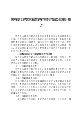 国有资本经营预算管理存在的问题及其审计重点国有资本经营预算是国家以所有者身份依法取得国有资本收益,并对所得收益进行分配而发生的各项收支,是政府预算的重要组成部分。2007年,国务院下发《国务院关于试行国有资本经营预算的意见》,决定国有资本经营预算正式实施。那么,从实际情况看国有资本经营预算执行得怎样?各级审计机关应予以重点关注。 一、国有资本经营预算管理存在的问题 国有资本经营预算与其他预算相比,起步晚、经验少,面临着更加困难和复杂的局面,既有预算管理共性问题,又有国有资本经营预算的个性问题。 (一)预算范围不完整 国有资本经营预算不断推进,预算编制范围逐步扩大,预算编制完整性不断提高,但仍有部分企业游离于国有资本经营预算以外。国有资本经营预算尚未实现全覆盖。 (二)预算编报不细化 细化预算是指在年初预算编制时即将资金落实到具体单位和项目,是提高政府预算管理水平的必然要求,也是实现科学预算、杜绝资金二次分配和权力寻租,保证预算执行刚性的前提。但国有资本经营预算由于起步时间晚,管理水平不高,预算编报较为粗放。 (三)预算执行不规范 一是预算执行不均衡。国有资本收益包括:应交利润,国有股股息、股利,国有产权转让收入,企业精算收入,其他国有资本经营收益。其中,应交利润是国有资本收益的主要组成部分,但由于目前企业集团化后,子公司及分支机构众多,公司编制合并财务会计报表、审计等事项需要较长时间,导致应交利润确定的时间较晚。而国有资本收益预缴和与各预算间的库款调剂制度又尚未建立,导致预算执行极不均衡。二是列支项目不准确。国有资本经营预算在按照预算科目列收支的基础上,还按照资金投向分设了不同的项目,如企业兼并重组、国有经济和产业结构调整、新兴产业发展等项目。项目管理符合国有资本经营预算特点,便于社会公众掌握国有资本经营预算的支出方向,增强了预算透明度。但由于项目之间界限不清晰等原因,导致预算实际支出情况与项目内容不符。 (四)预算定位不清晰 一是预算功能界定不明确,国有资本经营预算与公共财政预算、基金预算之间存在补助内容交叉、支出对象相同的问题。二是预算资金投向竞争领域,部分项目资金存在少、散的现象。 二、国有资本经营预算审计的重点 (一)预算功能定位情况的审计 国有资本经营预算设立的目的是巩固和发展国有经济,集中解决国有企业改革中存在的体制性和机制性问题,实现国有企业的转型和升级,使国有企业更好地为国民经济服务。审计应以此切入点,重点审查国有资本经营预算实施效果。一是审查国有资本经营预算功能是否清晰,是否与其他预算之间存在交叉。利用计算机技术,对国有资本经营预算、公共财政预算和基金预算投入企业和项目的情况进行比对,查找是否存在资金投向、支出企业和项目内容重复的问题,以揭示国有资本经营预算与其他预算之间若能交叉、定位不清的问题。二是审查资金投向是否属于关键领域及重点行业。对国有资本经营预算的支出投向进行审计审计,分析资金投向是否属于国有经济布文可居文库——海量学习资料,手机电脑均可下载www.wenkeju.com局和结构调整、国家战略和国家安全等关键领域及重点行业,有无投入房地产、旅游等完全竞争行业的问题,以揭示国有资本经营预算投向不符合预算设立目的,未能充分体现政策要求的问题。 (二)预算执行情况的审计 一是审查预算执行与编制的一致性。审查预算编制时已明确单位和项目的预算是否得到了严格执行,如存在项目调整情况,审查预算调整程序是否合规,是否经过原审批机关批准。对年初财政代编和编报时只明确支也方面的预算,应审查预算执行中企业和项目确定的程序,查阅财政部分提供的企业申报资金和项目审批文件,关注是否存在预算执行随意性大,预算缺乏刚性的问题。二是审查预算收入执行情况。国有资本经营预算资金采取当年收入、当年支出方式,预算资金入库进度与预算支出进度紧密相连。审计人员应查阅上交国有资本收益企业财务报表和财政部门相关收益上交比例政策文件,审查相关企业国有资本收益确定是否准确、上交是否及时、入库是否完整。三是审查实际投向与项目内容是否一致。以中央企业兼并重组、国有经济和产业结构调整、中央企业重大科技创新、中央企业重大节能减排等项目为抓手进行审计,核实相关项目实际支出内容,审查其实际投向与项目内容是否一致。对项目资金投入集中度进行分析,审查是否存在资金平均分配及少、散等影响资金使用效益的问题。 (三)预算分配情况的审计 预算分配是对纳入政府预算体系的财政资源进行配置的行为。预算分配审计的内容主要包括两个方面:一是审查预算单位完整性。国有资本经营预算要求所有国有企业都纳入预算实施范围,审计人员开展工作时应从财政部门调查国有资本经营预算的编报范围和编报单位,与国资部门掌握的金融企业名单和其他履行出资人职责的单位所属企业名单进行比较,审查是否存在国有