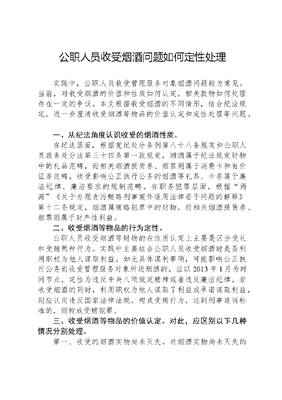 公职人员收受烟酒问题如何定性处理实践中,公职人员收受管理服务对象烟酒问题较为常见。当前,对收受烟酒的价值和性质如何认定,相关款物如何处理存在一定的争议。本文根据收受烟酒的不同情形,结合纪法规定,进一步厘清收受烟酒等物品的价值认定和定性处理等问题。 一、从纪法角度认识收受的烟酒性质。 在纪法层面,根据党纪处分条例第八十八条规定和公职人员政务处分法第三十四条第一款规定,烟酒属于纪法规定财物中的礼品范畴,而相关烟酒提货券、烟票则属于消费卡和有价证券范畴,收受影响公正执行公务的烟酒等礼品、卡券属于廉洁纪律、廉洁要求的规制范畴。在职务犯罪层面,根据两高《关于办理贪污贿赂刑事案件适用法律若干问题的解释》第十二条规定,烟酒属贿赂犯罪中的财物,而相关烟酒提货券、烟票则属于财产性利益。 二、收受烟酒等物品的行为定性。 公职人员收受烟酒等财物的在性质认定上主要是区分受礼和受贿两种行为。实践中主要结合公职人员收受烟酒时是否利用职权为他人谋取利益。如无具体谋利事项,可能影响公正执行公务而收受管理服务对象所送烟酒的,应以2013年1月为时间节点,定性为违反中央八项规定精神或者违反廉洁纪律。若收受烟酒的同时,利用职权为他人谋取了利益或承诺谋取利益,则应认定违反国家法律法规,构成受贿行为,达到刑事追诉标准的,则构成受贿犯罪。 三、收受烟酒等物品的价值认定。对此,应区别以下几种情况分别处理。 第一、收受的烟酒实物尚未灭失。对烟酒实物尚未灭失的需要对烟酒的真假和收受时的价值同时进行鉴定,在确定真假的情况下以价格认定中心出具的鉴定意见认定其价值。此时如保有相关烟酒的购买发票、支付凭证,在鉴定为非伪劣品的情况下,也可以实际购买发票和支付凭证显示的价格认定其价值。 第二、收受烟酒提货券、烟票。烟酒提货券、烟票本身不存在真假的问题,应以烟酒提货券、烟票相关面值作为认定价值的依据,同时要调取相关店家关于烟酒提货券、烟票面值与实际价值是否等值或存在一定差额的证据材料,如相关抵扣记录、结算凭证等,在实际购买价格低于面值载明价值时,则应以实际购买价格认定其价值。如查实某管理服务对象以8折优惠购买一张面值1000元的烟酒提货券,则应认定相关数额为800元。如果烟酒提货券、烟票注明的是一定数量的特定烟酒,未标明面值,又难以查明票券购买价格,也可考虑以同类烟酒实际鉴定的市场价格作为价值认定依据。 第三、公职人员知悉或参与烟酒购买过程的。实践中对于送礼方在商场购买烟酒,相关公职人员在场并知情,特别是根据公职人员要求或指定购买的,则应以对方实际支付价格作为认定相关烟酒价值的依据,烟酒本身的真伪不影响对其所收烟酒价值的认定。 第四、收受的烟酒实物已灭失。由于烟酒属于消耗品,实践中存在烟酒已被消费或转送他人,实物无法查证的情形。对此,有人认为应以被审查调查人供述的同类烟酒当时的市场价格作为认定依据,由价格认定机构出具相关价格鉴定意见书,以此为依据认定烟酒的价值。笔者认为此类做法不妥,在无法确定烟酒真假的情况下,鉴定其同类商品价值无实际意义。本着有利于被审查调查人的原则,笔者认为在烟酒实物已被消耗或灭失的情况下,则无法对所涉烟酒进行价格认定,不宜对相关烟酒价值作出评价。需要注意的是,在这种情况下,因相关烟酒已经灭失,无法确定相关烟酒的价值,因受贿罪对犯罪金文可居文库——海量学习资料,手机电脑均可下载www.wenkeju.com额有法定要求,即使收送双方供证一致,也不能认定受贿犯罪。而由于认定违纪违法对金额没有规定要求,故在相关证据到位且达到明确合理可信或清晰且令人信服证据标准的前提下,可以认定违纪违法。 四、收受烟酒等物品的款物处理。 对于收受烟酒等物品的款物处理,应区分不同情况,依纪依规处理,对其中涉嫌职务犯罪被认定为受贿赃款赃物的,应随案移送司法机关,此种情形不再赘述。笔者主要探讨一般违纪违法案件中烟酒款物的处理。党纪处分条例第四十条第一款规定,对于违纪行为所获得的经济利益,应当收缴或者责令退赔。公职人员政务处分法第二十五条第一款亦规定,公职人员违法取得的财物和用于违法行为的本人财物,除依法应当由其他机关没收、追缴或者责令退赔的,由监察机关没收、追缴或者责令退赔。依据上述规定,对于作为因受礼或受贿暂扣或扣押的烟酒实物,应予以收缴或罚没。对于收取的烟酒提货券、烟票,或具有其他可认定烟酒价值的情形,经组织认定相应价值后,应收缴或罚没其违纪违法所得。也可以根据烟酒或票券价值价格,追缴并处置等额钱款。对烟酒已经灭失,无论是否作为违纪违法事实认定,如果被审查调查人愿意主动上交相关钱款,则应依据监督执纪工作规则第五十八条第一款、《关于对党和国家机关工作人员在国内交往中收受的礼品实行登记制度的规定》第二条等规定,予以登记上交。文可居文库——海量学习资料,手机电脑均可下载www
