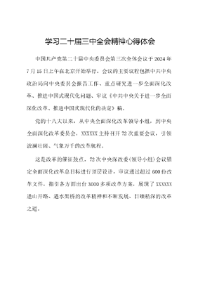 学习二十届三中全会精神心得体会中国共产党第二十届中央委员会第三次全体会议于2024年7月15日上午在北京开始举行。会议的主要议程包括中共中央政治局向中央委员会报告工作、重点研究进一步全面深化改革、推进中国式现代化问题、审议《中共中央关于进一步全面深化改革、推进中国式现代化的决定》稿。党的十八大以来,从中央全面深化改革领导小组,到中央全面深化改革委员会,XXXXXX主持召开72次重要会议,引领波澜壮阔、气象万千的改革航程。这是改革的催征鼓点。72次中央深改委(领导小组)会议锚定全面深化改革总目标进行顶层设计,审议通过超过600份改革文件,指引各方面出台3000多项改革方案,展现了XXXXXX逢山开路、遇水架桥的改革精神和不断发展、日臻精深的改革之道。72次会议的公开报道中,人民和群众分别出现了200多次和100多次。一件件关乎百姓的大小事,被列入会议议程,成为改革的关注点、发力点。多谋民生之利、多解民生之忧。正如XXXXXX所说,老百姓关心什么、期盼什么,改革就要抓住什么、推进什么。垃圾分类、环境保护、法律援助、养老托育、教育减负……一份份改革文件获得通过,一项项制度安排渐次落地,事关民生福祉的改革被放在更加突出位置,更好地回应了人民群众的急难愁盼。更好的教育、更稳定的工作、更满意的收入、更可靠的社会保障、更高水平的医疗卫生服务、更舒适的居住条件、更优美的环境,XXX