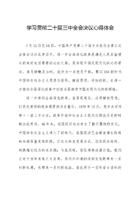 学习贯彻二十届三中全会决议心得体会7月15日至18日,中国共产党第二十届中央委员会第三次全体会议在北京召开。进一步全面深化改革是满足人民日益增长的美好生活需要的必由之路,是实现中国式现代化的必然要求。策马扬鞭正当时,我作为一名党员干部,要以XXX新时代中国特色社会主义思想为指导,解放思想,开拓创新,在进一步推动全面深化改革中创造全面推进中国式现代化的新辉煌。进一步推动全面深化改革,首要是观念,必须解放思想,以责无旁贷的使命感勇担历史重任。1978年12月,党中央召开第十一届三中全会,改革开放和社会主义现代化建设历史新时期由此开启。46年来,我国经济社会发生了翻天覆地的变化,中国特色社会主义进入了新时代,我国经济已由高速增长阶段转向高质量发展阶段,正处在转变发展方式、优化经济结构、转换增长动力的攻关期;与此同时,国际局势波谲云诡,我们正处于百年未有之大变局,国内外环境的深刻变化既带来一系列新机遇,也带来一系列新挑战。值此两个一百年奋斗目标的历史交汇期,广大党员干部必须深刻认识到自身的历史使命,摒弃粗放发展的思维,以党纪学习教育为契机,提高思想认识,树立以人民为中心的发展思想,敢于涉险滩、闯难关、啃硬骨头,打开中国特色社会主义事业新格局。要保持风雨不动安如山的定力,深刻领悟两个确立的决定性意义,增强四个意识、做到两个维护,以高度的历史自信迎接各式各样的挑战。进一步推动全面深