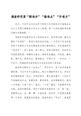 调查研究要踩准步踏准点开准方近日,习近平总书记在学习贯彻习近平新时代中国特色社会主义思想主题教育工作会议上强调,要以深化调查研究推动解决发展难题。调查研究是做好各项工作的基本功,是发现问题、解决问题的总钥匙,是我们党的优良传统。广大党员干部尤其是领导干部要树立民生问题就是发展问题的理念,用好调查研究传家宝,深入基层、深入群众,坚持问题导向、目标导向,收集民情民意、破解民生痛点,增进民生福祉,纾民困、解民忧、惠民生,踩准步点、踏准鼓点、开准方子,一步步来、一件件干,把调查研究成果转化为实实在在的工作成效。把发现问题作为出发点,迈开步子、俯下身子收集民情民意。习近平总书记曾指出,要大兴调查研究之风,多到分管领域的基层一线去,多到困难多、群众意见集中、工作打不开局面的地方去,体察实情、解剖麻雀,全面掌握情况,做到心中有数。只有身入基层,心到基层,才能精准发现问题,找到问题症结。领导干部要多到基层走一走、看一看,多跟群众坐一坐、聊一聊,在望民情、闻民声、问民需中收集第一手资料、掌握真实的情况。要善听群众异见、善看群众脸色、善读群众心思,从群众点头摇头、语气语调中知方向、找问题、寻答案。要提高调研对象的针对性、调研内容的丰富性、调研方式的多样性,精准选题、精细安排、精心开展,才能把问题摸准、实情摸透。把分析问题作为关键点,开动脑子、找准法子破解民生痛点。发现问题是解决问题的前提,而分析问题则是解决问题的关键。如果只调查,不研究,光打雷、不下雨,有面子、失里子,前期调查轰轰烈烈,后期研究偃旗息鼓,不仅失去了调查研究本身的意义,也有损党和政府在人民心中的形象。领导干部要对前期调查收集的问题进行系统整理、分类分析,使原因具体化、问题显现化,重点问题突出化、一般问题特殊化,建立问题台账,列出问题事项、整改时限、具体责任人、解决措施等。要广泛征求意见,用好网络媒介和线下征集,汇众力、集众智,立足实际情况,绘出明确的路线图,推出科学的锦囊计,为后期有效有力解决问题打下坚实的基础。把解决问题作为落脚点,甩开膀子、撸起袖子增进民生福祉。衡量调查研究工作开展得好不好,到位不到位,落实没落实,关键要看问题解决了没有,群众满意不满意。发现问题是前提,分析问题是关键,解决问题是根本。领导干部要把路线图变成施工图,把时间表变成计程表,把问题清单变成履职清单,明确解决什么问题,用什么方式解决,最后要达到什么样的效果,不盲干蛮干,要善干巧干,不拖拖沓沓、慢慢吞吞,要紧抓快办、立说立行,处理好短期目标和长期目标、速度和质量、难与易的关系,弄懂现象和本质的区别,确保干在实处、谋在关键。要有所思、有所悟、有所行,精心谋事、用心干事、专心成事,迎上去攻坚克难,沉下心抓好落实,切实解决好群众的难事急事困难事。