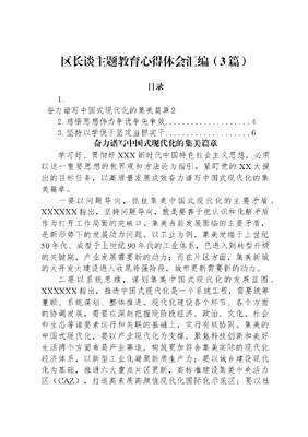 区长谈主题教育心得体会汇编(3篇)目录1.奋力谱写中国式现代化的集美篇章22.感悟思想伟力争优争先争效..43.坚持以学促干坚定当担实干..6奋力谱写中国式现代化的集美篇章学习好、贯彻好XXX新时代中国特色社会主义思想,必须以这一重要思想的世界观和方法论为指引,紧盯党的XX大提出的目标任务,以高质量发展成效奋力谱写中国式现代化的集美篇章。一要以问题导向,抓住集美中国式现代化的主要矛盾。XXXXXX指出,坚持问题导向,就是要善于把认识和化解矛盾作为打开工作局面的突破口。集美当前发展面临的主要矛盾,是新形势下的发展动力问题。以工业为例,集美发端于上世纪50年代、成型于上世纪90年代的工业体系,已进入到转型升级的关键期,产业发展需要新的动力;而在片区方面,集美新城的大开发大建设进入收尾补强阶段,城市更新需要新的动力。二要以系统思维,谋划集美中国式现代化的发展蓝图。XXXXXX指出,推进中国式现代化是一个系统工程,需要统筹兼顾、系统谋划、整体推进。现代化建设各个环节、各个方面的协调发展,需要在深刻把握现阶段经济、政治、文化、社会和生态等诸要素运行和关联的基础上,实行有机协同。集美的中国式现代化,要以产业现代化为支撑,聚焦科技创新和美好生活两个方面布局产业赛道,构筑更加符合集美实际的现代化经济体系,以新型工业化凝聚新质生产力;要以城乡建设现代化为基础,推进六大重点片区更新,高标准建设集美中央活力区(CAZ),打造高素质高颜值现代化国际化示范区;要以社会治理现代化为保障,推动多元主体参与基层治理,构建共建共治共享的社会治理格局;要以人的现代化为核心,让集美人民更加热爱知识、热爱体育、热爱艺术、热爱生活,促进人的全面发展和社会全面进步。三要以守正创新,突破集美中国式现代化的发展瓶颈。核心抓手是改革创新。我们正以主题教育为契机,全力推进三方面的改革创新:其一,成立一批服务于三新一高的产业发展机构,为经济做大做强组织要素、匹配资源。其二,战略性重组、专业化整合区属国有企业,增强核心竞争力,更加高效有力服务全区中心工作。其三,探索建立全新的产学研融合创新体系,不断提高创新引领高质量发展的水平。感悟思想伟力争优争先争效XX作为XX市辖区土地面积最大的行政区,既是深入实施跨岛发展战略的主阵地,又是推动经济社会高质量发展的主力军。站在新起点上,XX区坚持深入学习贯彻XXX新时代中国特色社会主义思想,牢牢把握主题教育总要求,奋力争优、争先、争效,努力为全市率先实现社会主义现代化作出XX贡献。坚持学深悟透、细照笃行,在优上下功夫。XXXXXX在福建、XX工作期间,曾两次赴XX军营村、白交祠村访贫问苦,因地制宜提出山上戴帽,山下开发等发展理念。我们更有责任发挥独特优势,用好理论富矿,扎实开展主题教育,在坚定拥护两个确立、坚决做到两个维护上走前列、作表率。要以学铸魂、以学增智、以学正风、以学促干,紧紧围绕《XX一二三战略规划》,进一步理清思路、定实措施、攻坚落实,争当理论武装的优等生。坚持创新驱动、深化改革,在先上显担当。XXXXXX的殷殷嘱托和为XX发展擘画的美好蓝图是XX砥砺奋进的行动指南。要牢记勇立潮头、勇毅前行重要要求,聚焦四个发展新课题,发挥XX大乡古工比较优势,激扬党员干部的锐气、朝气、志气,以新作为闯出新天地。坚持创新活区、工业强区、文化兴区、生态立区四大发展定位,加快构建4+4+1现代产业体系,全力打造两个新城双引擎,持续推动城乡统筹、改革开放、两岸融合等领域提质增效,奋力谱写富美新XX建设新篇章,争当敢拼会赢的先行者。坚持马上就办、真抓实干,在效上见行动。大道至简,实干为要。要坚持同党中央要求对标,与主题教育内容对表,查问题找差距、补短板锻长板。自觉拿党章党规扫描,知敬畏守底线,去灰尘正新风。积极回应人民群众期待,聚焦就业、教育、医疗、住房等民生领域,深化运用四下基层制度,做到用脚步丈量XX、用成绩回馈期盼,争当务求实效的实干家。坚持以学促干坚定当担实干XX区牢牢把握主题教育的总要求、目标任务和重点措施,坚持学思用贯通、知信行统一,教育引导广大党员干部学思想、见行动,坚持转作风、优服务、抓落实,奋力以实干实绩为全省、全市发展大局作出新的更大贡献。坚持真学真信,确保忠诚坚定坚决。坚持把学思想作为必修课首修课终身课,深入领会XXXXXX在福建、厦门工作期间创造的宝贵思想财富、精神财富和实践成果,满怀对人民领袖的感恩爱戴之情,更加深刻领悟两个确立的决定性意义,更好地以理论清醒保证政治坚定,坚定忠诚核心、拥戴核心、维护核心、捍卫核心,始终同以XXX同志为核心的党中央保持高度一致。坚