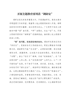 开展主题教育要用活调研室调研室是负责起草重要文件,开展调查研究,提供决策参考等重要工作的科室。随着第二批主题教育的深入开展,调研室的作用将更加重要、地位将更加突出。广大党员干部在主题教育中需调查问题、研读理论、走出室内,开展主题教育要用好调研室迎接新挑战,推动第二批主题教育的深入开展。调准问题,找准症结有的放矢。调查研究是我们党的传家宝,是做好各项工作的基本功,更是主题教育中的重要内容。调查研究不能走过场,必须弄清问题、透过现象看到本质、把握规律,在实践中总结新的理论。要把问题当专题,拿出钉钉子精神,回避经典路线,在真发现问题上用心思,在发现真问题上用气力,以一竿子插到底钻劲,扑下身子干实事、谋实招、求实效,才能更加有效寻得源头活水。调查研究中既要抓点、搞好典型调查,也要注重调查研究对象的广泛性,还要多用琢磨功夫,少看花瓶和盆景,多看看后院和角落,奔着问题去,全面、准确、深透地了解情况,方能达到拨开云雾见青天的效果。真正把情况搞清、把问题找准、把对策提实,以主调查研究的温度换人民群众的满意度。研读理论,学深悟透强化根基。开展理论学习是铸牢理想信念的基础,最忌三天打鱼,两天晒网。要以主题教育为契机,研读理论,沉下心来,贵在持之以恒,重在学懂弄通,把理论学习作为主题教育的重中之重,把深入学习贯彻XXX新时代中国特色社会主义思想作为首要政治任务,认真学习研读学习材料,读原著、学原文、悟原理、明原义,做到组织学习第一时间、谋划部署第一步骤、落实任务第一要求,全面领会XXX新时代中国特色社会主义思想的科学体系、精髓要义和实践要求,做到整体把握、融会贯通,知其言更知其义,知其然更知其所以然,在深学细悟笃行中提高理论素养、坚定理想信念、提升觉悟境界、增强能力本领。走出室内,认真倾听以民为师。主题教育不能满足于纸上谈兵,坐而论道,要摈弃光说不练的假把式,防止理论与实践让工作止于扬汤止沸。要深入基层和群众多聊家常,多听牢骚抱怨,必须走出机关大楼,走出办公室,将工位搬到大街小巷、田间地头、工厂车间和群众院落,当好倾听者摒弃架子、沉下身子、迈开步子,接地气、通下情。要甘愿拜人民为师,虚心向群众学习,做到眼睛向下观细微,脚步向下走深入,搬一条为什么人、靠什么人的凳子同人民群众同坐,把群众当亲人当朋友,与人民群众心贴心、面对面,零距离交流,多听群众的心里话。要在工作中树立同理心,始终把人民群众的急难愁盼作为工作的信号灯桅杆航向,时时围着群众转,把一切工作落实到群众认可、群众满意上来,善于观察群众的脸色,从中判断他们高兴不高兴、满意不满意,努力看到群众满意的笑脸。