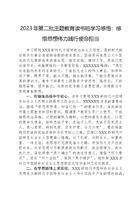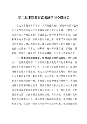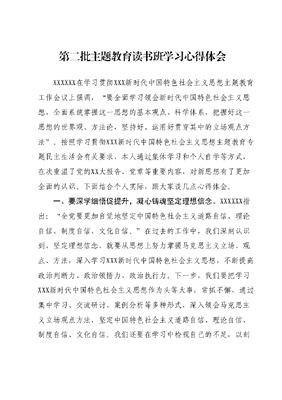 第二批主题教育读书班学习心得体会XXXXXX在学习贯彻XXX新时代中国特色社会主义思想主题教育工作会议上强调,要全面学习领会新时代中国特色社会主义思想,全面系统掌握这一思想的基本观点、科学体系,把握好这一思想的世界观、方法论,坚持好、运用好贯穿其中的立场观点方法。按照学习贯彻XXX新时代中国特色社会主义思想主题教育专题民主生活会有关要求,本人通过集体学习和个人自学等方式,在次重温了党的XX大报告、党章等重要内容,对新思想有了更加全面的认识。下面结合个人实际,跟大家谈几点心得体会。一、要深学细悟促提升,凝心铸魂坚定理想信念。XXXXXX指出:全党要更加自觉地坚定中国特色社会主义道路自信、理论自信、制度自信、文化自信。在过去的工作中,我们深刻认识到,坚定理想信念,就要从思想上努力掌握马克思主义立场、观点、方法,深入学习XXX新时代中国特色社会主义思想,不断提高政治判断力、政治领悟力、政治执行力。下一步,我们要把学习XXX新时代中国特色社会主义思想作为头等大事,常抓不懈,通过集中学习、交流研讨、案例分析等多种形式,深入领会马克思主义立场观点方法,坚定中国特色社会主义道路自信、理论自信、制度自信、文化自信。我们还要在学习中检视自己的不足,以刻苦钻研的精神,不断提高运用XXX新时代中国特色社会主义思想指导实践的能力。二、要知行合一促提升,担当履职站稳人民立场。XXXXXX指出:全面从严治党永远在路上,党的自我革命永远在路上。在过去的工作中,我们深刻认识到,要坚持以人民为中心的发展思想,必须做到知行合一,将所学知识转化为工作实效,用心用情为人民服务,始终站稳人民立场。下一步,我们要进一步提高政治站位,牢记为民初心,把群众需求作为根本出发点和落脚点坚持深入基层、深入群众,多调查研究、多倾听群众心声,把解决好人民最关心最直接最现实的利益问题作为工作着力点。我们还要加强作风建设,坚持民主办事,严格监督和约束,做到言行一致、公私一致,以实际行动践行为民情怀。三、要以学增智促提升,学用结合推动高质量发展。XXXXXX指出:要善于运用马克思主义立场、观点、方法分析和解决实际问题。在过去的工作中,我们深刻认识到,推动高质量发展必须学以致用,持之以恒地深化理论学习,运用科学理论指导实践,推动工作创新。下一步,我们要坚持学用结合,牢牢把握新发展理念要求,运用系统思维和辩证思维,分析本地区发展面临的形势和问题。我们还要主动适应经济发展新常态,立足xx特色产业,谋划产业结构优化升级。在推进各项事业中,我们要不断强化科技创新,推动创新驱动发展,以创新精神开拓奋斗新境界