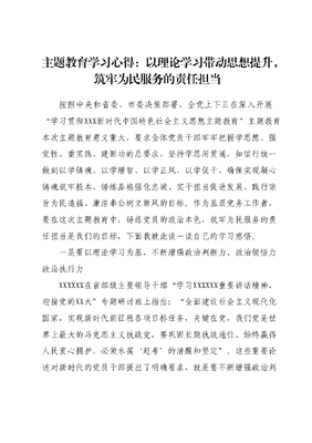 主题教育学习心得:以理论学习带动思想提升,筑牢为民服务的责任担当按照中央和省委、市委决策部署,全党上下正在深入开展学习贯彻XXX新时代中国特色社会主义思想主题教育主题教育本次主题教育意义重大,要求全体党员干部牢牢把握学思想、强党性、重实践、建新功的总要求,坚持学思用贯通,知信行统一做到以学铸魂、以学增智、以学正风、以学促干,确保实现凝心铸魂筑牢根本、锤炼品格强化忠诚、实干担当促进发展、践行宗旨为民造福、廉洁奉公树立新风的目标。作为基层党务工作者,要在这次主题教育中,锤炼党员的政治本色,筑牢为民服务的责任担当是我们的目标,下面我就此谈一谈自己的学习感悟。一是要以理论学习为基,不断增强政治判断力、政治领悟力政治执行力XXXXXX在省部级主要领导干部学习XXXXXX重要讲话精神,迎接党的XX大专题研讨班上指出:全面建设社会主义现代化国家,实现新时代新征程各项目标任务,关键在党,我们党是世界上最大的马克思主义执政党,要巩固长期执政地位、始终赢得人民衷心拥护,必须永葆赶考的清醒和坚定。这些重要论述对新时代的党员干部提出了明确要求,就是要不断增强政治判断力、政治领悟力、政治执行力,努力成为经得起各种风险考验和人民检验的合格党员干部。增强政治判断力,就是要求广大党员干部思想不迷航,行动不偏航,必须做到旗帜鲜明讲政治。XXXXXX指出:对党绝对忠诚要害在绝对两个字,就是唯一的、彻底的、无条件的、不掺任何杂质的、没有任何水分的忠诚,特别是党员干部要在党言党、在党忧党、在党为党,任何时候任何情况下都要与党同心同德、同向同行,把思想和行动统一到XXXXXX重要讲话精神上来,统一到党中央决策部署上来,始终保持坚定的政治立场和正确的政治方向,在重大问题和关键环节上始终做到眼睛明亮、头脑清醒、顺势而为,立足两个大局,不断增强科学把握形势变化、精准识别现象本质、清醒明辨行为是非、有效抵御风险挑战的能力。增强政治领悟力,首先要深入学习马克思主义经典著作,坚持用马克思主义中国化最新成果武装头脑,同时要深入学习贯彻XXX新时代中国特色社会主义思想,并用以指导实践、推动工作。其次要根据时代和形势变化提出的新要求,提高认知水平和层次注重从实践中获得新认识、把握新规律,进而提高政治领悟力。最后还要求党员干部时刻心怀国之大者,要有大局观念和全局视野,从全局高度思考、理解和贯彻党的路线方针政策,不断提高政治站位,要对关系国计民生的重大问题做到了然于胸。增强政治执行力,是确保党中央各项决策部署高效落实的决定性因素,是同党中央精神对表对标,把党的路线方针政策坚决执行到位、把党中央决策部署不折不扣落实到底的能力。作为基层党员干部,准确理解政治执行力,就是要切实践行两个维护,做到党中央提倡的坚决响应,党中央决定的坚决执行,党中央禁止的坚决不做,不掉队、不走偏,及时校准偏差;就是要力戒执行中的形式主义、官僚主义,树立正确的政绩观,坚决抓好党中央精神的贯彻落实;就是要坚持底线思维、问题导向,既做到防患于未然,又敢于直面问题,增强斗争精神,勇于担当作为,坚决把党中央精神和上级指示落实到位。二是以学铸魂,站稳人民立场,始终同人民站在一起、想在一起、干在一起XXXXXX强调:强化宗旨意识,坚守初心使命,践行党的群众路线,把人民群众满意不满意作为评判主题教育成效的根本标准,解决好人民群众最关心最直接最现实的利益问题,把惠民生的事办实、暖民心的事办细、顺民意的事办好,让现代化建设成果更多更公平惠及全体人民。党的根基在人民、血脉在人民、力量在人民。我们党之所以能从建党时的50多名党员发展成为一个拥有近9000万党员的政党,能从小到大、从弱到强,不断发展壮大,能够在全国执政70年、领导改革开放40多年,从根本上说就是因为我们党始终与人民同呼吸、共命运、心连心,始终与人民在一起。我们党从成立之日起就把为人民服务作为根本宗旨,把不断实现好、维护好、发展好最广大人民群众的利益作为全部工作的出发点和落脚点。XXXXXX指出:为人民谋幸福,是中国共产党人的初心。我们要时刻不忘这个初心,永远把人民对美好生活的向往作为奋斗目标。人民群众是我们党的力量源泉,人民群众的拥护和支持是党执政最根本的政治基础,新中国成立70余年来,特别是改革开放40多年来,我们党始终牢记为人民谋幸福的初心,紧紧抓住人民最关心最直接最现实的利益问题,从人民群众关心的事情做起,从让人民群众满意的事情做起,带领人民不断创造美好生活人民群众的获得感、幸福感、安全感不断增强,党执政的政治基础和群众基础不断厚植。此次主题教育的开展,就是要继续教育引导广大党员干部自觉践行党的根本宗旨,把群众观点、群众路线深深植根于思想中,具体落实到行动上,着力解决群众最关心最现实的利益问题,不断增强人民群众对党的信任和信心,筑