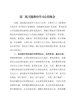 第二批主题教育学习心得体会近期,通过院内组织学习及本人自学,认真学习了《党的XX大报告》《中国共产党章程》《XXX著作选读》等内容,更加深刻认识到新思想的真理力量和实践伟力,理解了聚焦学习贯彻XXX新时代中国特色社会主义思想主题教育,应严格按照学思想、强党性、重实践、建新功的总要求读原著、悟原理,在以学铸魂、以学增智、以学正风、以学促干上下功夫,现结合本职工作及自身实际,谈谈如下感悟。确立坚定正确的理论导向,提升政治认识和决心。一、始终维护坚如磐石的思想决心,刻苦修身,廉洁从政。XXXXXX曾强调,必须加强党的政治文化建设,使党的理念、价值观念以及优秀传统深入党员干部的思想与灵魂。我们要倡导并践行社会主义核心价值观,体现在忠诚、正直、求是、廉洁等方面以健全的政治文化培育风清气正的政治生态。站在新时代的历史交汇点上,面对复杂多变的国内外环境,作为党员干部,我们必须强化四个意识,坚定四个自信,实现两个维护,保持冷静和坚定的理想信念,永记党的初衷和使命,不因任何利益诱惑动摇,始终维持廉洁的政治品格。永远怀有坚韧和执着,坚守理想信念,永记党的初衷,遵循正确的政治方向,保持清醒的思想。必须坚守原则,记取纪律面前无特权,依规治理,强化不可任意妄为的法治思维。坚守底线,铭记廉洁自律的红线不可逾越,持续以问题为导向,精准施策,标本兼治,形成强有力的协同效应。在风雨中磨砺前行,廉洁履行党赋予的神圣使命。二、必须始终保持敢于斗争的意志,坚韧不拔,锐意进取。党的XX大报告提出,改革发展稳定的深层次矛盾不可回避,党的建设尤其是党风廉政建设和反腐败斗争面对的难题频发,外部压力亦可能随时升级。在此情况下,我们国家的发展进入了机遇与挑战并存、不确定性增多的新阶段,黑天鹅、灰犀牛事件可能随时发生。新时代之下,面对反腐斗争的严峻复杂形势,我们必须坚韧不拔,打好反腐这场硬仗。下一步,我们要保持战略定力,不懈努力推进党风廉政建设和反腐败工作,继续保持反腐高压态势。坚持治本和治标相结合,加强制度性治理,确保法治的绝对权威。要坚持压制腐败现象,发挥强大的震慑力,确保覆盖全面、容错率为零,切实防止利益集团化,以此在反腐硬仗中砥砺前行,廉洁地执行党赋予的神圣职责。三、必须始终保持不懈的求知欲,以学增智、实干笃行。XXXXXX明确指出,全面贯彻新时代党的建设总要求,要把学习实践XXX新时代中国特色社会主义思想作为首要的政治任务。面对新的形势、任务和要求,我们应坚持不懈地追求知识,深入学习贯彻XXX新时代中国特色社会主义思想,不断提升工作能力,并以行动践行党的初心和使命。作为党员干部,我们要继续秉持谦虚谨慎的工作态度,聚焦问题导向,精准诊治,标本兼治。要深入基层,深入了解实际情况,认真听取群众的意见和建议。要针对新出现的情况和问题进行深入研究,提高应对挑战的能力。要加强理论与业务的学习,不断增强履职能力。要持实际行动,以钉钉子的精神办实事,办好事,在实践探索中不断增长智慧,以行动推进事业的高质量发展。