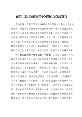 在第二批主题教育的心得体会交流发言在全党深入开展学习贯彻XXX新时代中国特色社会主义思想主题教育,是党中央为全面贯彻党的XX大精神、动员全党同志为完成党的中心任务而团结奋斗所作的重大部署,是深入推进新时代党的建设新的伟大工程的重大部署。当前,第二批主题教育正在深入开展,广大党员干部要在主题教育中自觉涵养内驱力,增强干事创业执行力,激活砥砺前行源动力,在新时代新征程中交出无愧于时代、无愧于历史、无愧于人民的精彩答卷一、在主题教育中增智提能不断电。在经济社会、文化信息飞速发展的今天,与时俱进及时跟进学习就尤为重要。党员干部要深刻认识学习的重要性、必要性和紧迫性,把学习当一种进步要求、一种发展需要、一种终身习惯,常补精神之钙,锻造忠贞不渝的政治忠魂,主动抓住热点学、紧跟形势学,结合工作实际学、联系群众实践学,让以学增智、以学提能的列车持续运行不断电。要不断增强对知识的渴望和持续学习的意愿,变要我学为我要学,自觉想方设法获取知识,主动在学习中思考、在思考中实践、在实践中成长,培养与新时代新要求相匹配的综合素质和适应人民群众新期盼新需求的服务能力,努力成为永不落伍的学习家和堪当民族复兴重任的实干家。二、在主题教育中永葆工作激情不衰退。工作内驱力是职场人在工作中持久保持高效和专注的能力,是发自内心想把事情做好的内部动力。党员干部要坚持把党和国家的伟大事业与实现个人理想紧紧联系在一起,把自己的工作岗位服务内容、人生价值看得重要而且伟大。要牢记全心全意为人民服务的宗旨,增强干事创业的责任感、使命感和幸福感,秉持有为才有位、有位更有为的理念,从内心深处认同工作、认同事业,做到干一行、爱一行、专一行,让内心热爱成为工作激情的不竭源动力。要用好蜜月期,走出平淡期,防止倦怠期,时刻保持赶考的姿态动起来、干起来、拼起来,坚决拒绝躺平、侧卧,在党和人民最需要的地方挥洒青春和汗水,以只争朝夕奋力推动经济社会高质量发展。三、在主题教育中守牢廉洁底线不破防。自律自省的内驱力是个人在行为和思想上的自我管理和自我反思能力,自律自省的人能够主动控制、约束、反思自己,不断总结经验汲取教训,切实改进自己提升自己。最好的监督是自律,党员干部要自觉培养自律自省的良好习惯,坚持做自己的管理者和监督者,时刻用纪法铁尺度量言行举止,让不能腐、不敢腐、不想腐成为行为自觉,在没有外部监督的情况下能自愿做到思想上干干净净,行为上坦坦荡荡,永葆为民初心、廉洁之心。要树立正确的权力观、地位观、利益观、政绩观,严守党纪国法,始终在法纪和政策范围内按规定办事,严格管理亲属和身边的工作人员,做到不搞特殊化、不以权谋私,不取不义之财、不沾不正之风、不干不法之事,真正成为洁身自好、克己奉公的干净人、廉洁人、清醒人。