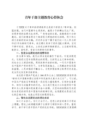 青年干部主题教育心得体会习XXX对于青年的谆谆教导总是被不断提及:青年强,则国家强。当代中国青年生逢其时,施展才干的舞台无比广阔,实现梦想的前景无比光明。每每读到这里,我都感到十分的激动,我们的青春同这个美好而又辉煌的时代相遇,同个伟大而又崇高的使命交融,历史终会留下属于我们这一代人努力的印记!作为新时代青年,我们要认真学习党的XX大精神,坚定不移听党话、跟党走,主动适应新形势新要求,立志做有理想、敢担当、能吃苦、肯奋斗的新时代好青年。一、坚定永远跟党走的理想信念作为青年XX,我们必须在党的指引下前进,听党话跟党走,这是经过百年实践得出的真理。从新民主主义革命时期,到社会主义建设时期,再到改革开放新时期,一代代中国青年在中国共产党的领导下,为争取民族独立、人民解放和实现国家富强、人民幸福而不懈奋斗,为党和国家事业取得历史成就、发生历史性变革贡献青春。在庆祝中国共产党成立100周年大会上XXXXXX深情寄语:新时代中国青年要以实现中华民族伟大复兴为己任,可以说,中国共产党的百年辉煌是一段发现与重视青年、引领和依靠青年、相信与成就青年的历史,自从我们党成立以来就领导中国青年为人民幸福和民族复兴奋斗拼搏,从百年的实践的历史经验来看党的领导是中国青年的精神引领,永远跟党走是我们成长的正确方向,也是必须坚定的理想信念。二、强化永远跟党走的理论武装知之才会信之,信之才会行之,思想上的坚定离不开理论上清醒,理论上的清醒则源于长期学习领悟和深入思考。重视学习、善于学习是中国共产党的优良传统。XXXXXX反复强调:中国共产党人依靠学习走到今天,也必然要依靠学习走向未来。作为一名新时代的青年人,如何在XX管理工作中为党和国家的建设作出自己的贡献,就需要我们通过学习来汲取知识,坚定理想信念,提升自身修养,打牢理论基础,让自己有充足的能力去做好自己的本职工作。我们要增强理论自觉,不断强化理论武装,学懂弄通做实XXX新时代中国特色社会主义思想,深刻领会两个确立的决定性意义,增强四个意识、坚定四个自信、做到两个维书,切实把理想信念建立在对科学理论的理性认同上、对历史规律的正确把握上、对基本国情的全面认识上,激发内生于心的自信心和自豪感,坚定我们的底气、骨气和志气。三、提升永远跟党走的行动自觉一代人有一代人的使命,一代人有一代人的担当,纵观人类文明发展史,时代虽各有不同,但青春一脉相承。作为新时代XXX,我们要牢记XXX对青年人的嘱托,心系赤子之情、肩负复兴之梦、胸怀弄潮之志,站在崭新的历史起点上,实干争先、奋勇当先,在历史长河中留下我们不懈奋斗的青春足迹。我们要立足岗位实际,在XX考试中学深学懂悟通,将所学知识灵活运用在XX管理工作中;在英语学习活动中能开口、会开口、敢开口,在XX做传播大国形象的先驱者;在XX行动中积极冲锋,深挖线索,切实维护口岸安全。把人生志向与国家发展结合,用甘于做一颗永不生锈的螺丝钉的奋斗品格展现自己的抱负和激情,依靠勤劳和汗水开辟人生和事业前程,用把不可能变成一定能的斗争精神战胜前进道路上的一切艰难险阻,将真理的力量运用到行动自觉中。党的XX大肇画的宏图盛景,是国家的、民族的、人民的,更是青年的,是青年成长进步、建功立业的大好际遇,更是青年传承历史、开拓未来的神圣责任。我们将牢记肩负的职责和使命,坚定不移听党话、跟党走,立志做有理想、敢担当、能吃苦、肯奋斗的新时代好青年,奋进新征程,创造新业绩,让青春在火热实践中绽放绚丽之花!