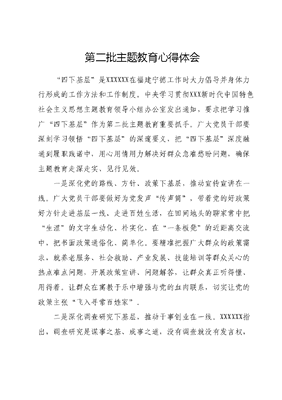 第二批主题教育心得体会四下基层是XXXXXX在福建宁德工作时大力倡导并身体力行形成的工作方法和工作制度。中央学习贯彻XXX新时代中国特色社会主义思想主题教育领导小组办公室发出通知,要求把学习推广四下基层作为第二批主题教育重要抓手。广大党员干部要深刻学习领悟四下基层的深邃要义,把四下基层深度融通到履职践诺中,用心用情用力解决好群众急难愁盼问题,确保主题教育走深走实、见行见效。一是深化党的路线、方针、政策下基层,推动宣传宣讲在一线。广大党员干部要做好为党发声传声筒,带着党的好政策好方针走进基层一线、走进百姓生活,在田间地头的聊家常中把生涩的文字生动化、朴实化,在一条板凳的近距离交流中,把书面政策通俗化、简单化。要精准把握广大群众的政策需求,就养老服务、社会救助、产业发展、技能培训等群众关心的热点难点问题,开展政策宣讲、问题解答,让群众真正听得懂、用得着。让群众在寓教于乐中增强与党的血肉联系,切实让党的政策主张飞入寻常百姓家。二是深化调查研究下基层,推动干事创业在一线。XXXXXX指出,调查研究是谋事之基、成事之道,没有调查就没有发言权,更没有决策权。广大党员干部要要坚持问题导向,结合自身岗位职责和日常所见所闻所感,聚焦群众关注的热点、难点、堵点,主动到问题复杂、反映强烈的地方去,带着问题下基层、俯下身来听民声,与群众面对面接触、心贴心交流,充分了解群众真实想法和切身需求。从一线金点子好办法里提取智慧,破解难点、疏通堵点。做好群众工作随堂笔记,收集好第一手资料,在此基础上学会透过现象看本质,提出解决问题科学方法切实把调查研究成果转化为促发展、惠民生的工作成效。三是深化信访接待下基层,推动矛盾化解在一线。XXXXXX指出:信访是送上门来的群众工作,要通过信访渠道摸清群众愿望和诉求,找到工作差距和不足,举一反三,加以改进,更好为群众服务。信访接待下基层作为四下基层的重要举措,是化解矛盾纠纷的最初一公里。广大党员干部要在一线倾听群众呼声,用心用情用力化解群众诉求,打开群众心头结,解决群众疙瘩事。以干部常下去换群众少上来,着力推动各类信访事项实现案结事了事心双解。坚持和发展新时代枫桥经验,常态化开展矛盾纠纷排查化解,做到预防在前、发现在早、化解在小,让群众问题化解在基层源头、解决在萌芽状态,努力把送上门来的群众工作做实做好。四是深化现场办公下基层,推动把脉问诊在一线。现场办公下基层和马上就办、真抓实干是XXX同志在福建工作期间亲自践行的。群众在哪,我们工作的现场就要在哪;问题在哪我们整改的现场就要在哪,广大党员干部要始终坚持一线工作法,把办公桌搬到群众需求最强烈、问题最紧迫、矛盾最突出的地方,将群众反映突出的问题在一线解决、服务在一线跟进、责任在一线落实。发扬实干担当精神,围绕乡村振兴、农村人居环境整治、基层社会治理等重点工作,一件接着一件干、一锤接着一锤敲,以实干求实效,在现场办公下基层中破解难题,让群众感受到主题教育的成效在身边,让推动发展的成果能够看得见、摸得着,在面对面现场办公中打通服务群众最后一米。