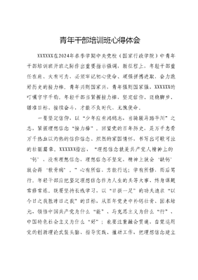 青年干部培训班心得体会XXXXXX在2024年春季学期中央党校(国家行政学院)中青年干部培训班开班之际作出重要指示强调,新征程上,年轻干部重任在肩、大有可为,必须牢记初心使命、顽强拼搏进取,奋力跑好历史的接力棒。青年兴则国家兴,青年强则国家强,XXXXXX的叮嘱字字千钧。年轻干部当紧握接力棒,坚定信仰、迈稳脚步、锚准目标、接续奋斗,才能不负时代、无愧使命。一要坚定信仰,以少年应有鸿鹄志,当骑骏马踏平川之志,紧握理想信念接力棒。回望党的百年历史,是万千忠骨万千热血以灼热的信仰信念、炽烈的家国情怀,书写出可歌可泣的壮丽篇章。XXXXXX指出,理想信念就是共产党人精神上的钙,没有理想信念,理想信念不坚定,精神上就会缺钙就会得软骨病。心有所信,方能行远;学有所悟,而后笃行。年轻干部应把坚定理想信念作为人生的头等大事、终身课题常修常炼。既要坚持长线学习,以日拱一足的功夫追求以今日之我胜昨日之我的目标,从百年党史中补钙壮骨、固本培元,领悟中国共产党为什么能、马克思主义为什么行、中国特色社会主义为什么好;也要注重融会贯通,自觉运用党的创新理论武装头脑、指导实践、推动工作,把理想信念建立在对科学理论的理性认同上,建立在对历史规律的正确认识上,建立在对基本国情的准确把握上,从而做到绝对忠诚、绝对纯洁绝对可靠。二要迈稳脚步,以海压竹枝低复举,风吹山角晦还明之势,紧握实干担当接力棒。XXXXXX指出:要坚持艰苦奋斗不贪图安逸,不惧怕困难,不怨天尤人,依靠勤劳和汗水开辟人生和事业前程。艰苦奋斗是我们党的传家宝,一部中国共产党党史就是一部艰苦奋斗史。长征路上红军啃树皮过草地克服了环境陌生、物资缺乏、不断减员的各种困难,最终不仅取得了战略转移的胜利还赢得了人民群众的信任;罗布泊上空升腾爆炸的蘑菇云和浩渺太空中卫星传回的《东方红》见证着科学家们扎根戈壁荒原、奋战深山峡谷隐姓埋名的20余载岁月。历览前贤国与家,成由勤俭败由奢。年轻干部要想克服依赖心理、洗掉书生气,就应当自找苦吃,担子要拣沉的挑、任务要冲难的选,勇于到条件艰苦的基层、国家建设的一线、项目攻关的前沿经受锻炼、增长才干,直面各种挑战和困难。通过实干苦干锤炼意志、积累经验,方能在心态和能力上做到把攀山越水当寻常事,将狂风暴雨作平常天。三要锚准目标,以月缺不改光,剑折不改刚之姿,紧握开拓创新接力棒。一切伟大成就都是接续奋斗的结果。2023年国产大飞机C919穿过象征民航最高礼仪的水门,标志着我国在民航领域的新突破。从运-10的遗憾夭折到C919成功交付商用,中国自主制造大飞机梦想期间历经50载终破茧成蝶一代又一代科研人员用十年磨一剑实现了163项关键技术、1935项专利、2.4万项标准规范,突破国际垄断壁垒。从理论创新到科学发现,创新改变着人类社会发展的轨迹,给各个领域带来巨大效益。XXXXXX指出惟创新者进,惟创新者强,惟创新者胜。安于现状,只会畏缩不前;创新迭代,才能勇往直前。面对前进道路上层出不穷的新情况新问题,年轻干部要以十年如一日默默奉献的科研人员为榜样,时刻保持清醒头脑和危机意识,敢于以民生需求为导向提出问题聚焦问题;勇于解放思想积极应变,找新出路、想新办法;善于以钉钉子精神把创新思维转化为创新能力逐个突破卡脖子问题。机遇总是留给有准备的人,咬定创新不放松,方能在危机中育先机、于变局中开新局。