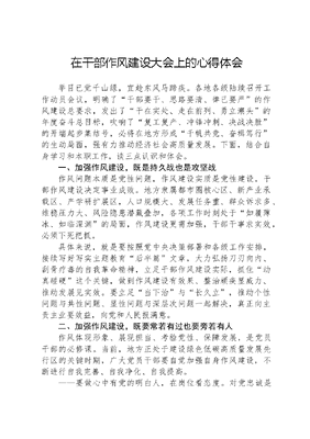 在干部作风建设大会上的心得体会举目已觉千山绿,宜趁东风马蹄疾。各地各级陆续召开工作动员会议,明确了干部要干、思路要清、律己要严的作风建设总要求,发出了干在实处、走在前列、勇立潮头的年度奋斗总目标,吹响了复工复产、冲锋冲刺、决战决胜的开端起步集结号,必将在地方形成千帆共竞、奋楫笃行的生动局面,强有力推动经济社会高质量发展。下面,结合自身学习和本职工作,谈三点认识和体会。一、加强作风建设,既是持久战也是攻坚战作风问题本质是党性问题,作风建设实质是党性建设,干部作风建设决定事业成败。地方隶属都市圈核心区、新产业承载区、产学研扩展区,人口规模大、发展任务重、群众诉求多、维稳压力大、风险隐患潜藏叠加,各项工作时刻处于如履薄冰、如临深渊的局面,作风建设更需加强,干部干事求实效,必须下死把抓。具体来说,就是要按照党中央决策部署和各级工作安排,接续写好写实主题教育后半篇文章,大力弘扬刀刃向内、刮骨疗毒的自我革命精神,立足干部作风建设实际,抓住动真碰硬这个关键,做到作风建设有效果、整治顽疾显威力、推动发展见实效。要立足当下治与长久立,推动个性问题与共性问题、显性问题与深层次问题一起解决,真正向主责主业要效益,向党和人民报满意。二、加强作风建设,既要常若有过也要旁若有人作风体现形象、展现担当、考验党性、保障发展,是党员干部的必修课。当前,地方正处于建设绿色低碳高质量发展先行区的关键时期,广大党员干部要自觉加强自身作风建设,不断进行自我完善、自我净化、自我提高。——要做心中有党的明白人,在岗位看态度。对党忠诚是党员干部履职尽责的基本标准,必须用行动筑牢四个意识、坚定四个自信、做到两个维护、捍卫两个确立。要深入学习贯彻党的XXX精神以及系列全会精神,在上级决策部署上扣扣子,在责任履行上担担子,在推动发展上钉钉子,以对党的绝对忠诚向党中央看齐,永远同组织保持高度一致。——要做心中有戒的带头人,在路上看作风。要筑牢拒腐防变防线,始终保持身在舞台中央、聚光灯下、放大镜下和旁若有人、常若有人的警醒,清清白白做人,干干净净做事,带出一支风清气正、有位有为的政法铁干部队伍。——要做心中有责的开路人,在状态看效果。干部就要有担当,有多大担当才能干多大事业,尽多大责任才会有多大成就。必须精准锚定国家战略布局,深度践行地方发展体系布局,高举事争一流、唯旗是夺攻坚大旗,始终坚持发展是第一要务,民生是第一目标,安全稳定是第一责任,勇于自我加压、敢于攀高比强,干就干大事、争就争一流,在对标找差中瞄准标杆,在追赶标杆中成为标杆,书写更多超越过去、超越对手的精彩篇章。要坚持有解思维,践行创新之举,深度聚焦群众急难愁盼,想路子、拿办法、抓落实,敢于打破思想上的误区、开拓观念上的盲区、探索稳定上的难区,努力争做高质量发展的先行者、绿色低碳发展的探索者、安全发展的带头者,以干在实处、走在前列,敢为人先、勇立潮头的工作状态,打造更多部门样板、地方风采。三、加强作风建设,既能高调做事也能低调做人加强作风建设,就是要在日常攻坚中去开展,在争先进位上去检验,在群众反馈上去衡量。大会表扬了一些正面典型,也通报了负面典型。耀眼的成绩是干出来的,是有目共睹的,是经得起党和人民检验的。如果落实差、标准低、纪律散、服务粗,那什么事也干不成、干不好、干不利索,最后只会留下一地鸡毛一串笑柄一生遗憾。要立足地方工作大局,多干实事,多办大事,多解难事,多抓要事,把自己看得低一些,把工作和人民看得高一些,坚持对上负责与对下负责相统一,切实用工作实效检验作风建设成果。——要在解决问题上走在前。坚持培树有解思维,不为既有经验所束缚,不为传统模式所制约,不为常规眼光所局限,敢于打破思想上的误区、开拓观念上的盲区、探索体制上的难区、突围机制上的禁区,努力争做改革开放的先行者、大胆创新的探索者、率先发展的带头者,以创新有为建设更高水平创新型城市,以机遇意识加快重大战略工程建设,以系统观念深化海陆联动、产业融合、乡村振兴,以历史耐心推进产业升级、万项技改、万企转型,纵深推进工业2.0,全面塑造高质量发展新优势。——要在深化改革上走在前。坚持推进试点探索与鼓励基层创造相结合,聚焦营商环境、生态保护、社会治理、民生保障等重点领域,努力创造更多地方特色、形成更多地方案例、打造更多地方样板。要加大开放融入力度,全新吸引、利用外资,大力推动产业链招商,吸引更多制造业外资项目落地。创新拓展利用外资方式,加快合格境外有限合伙人试点,办好经贸洽谈会,为外商来地投资提供最大程度的便利。——要在担当作为上走在前。各行各业、各条战线都要强化争先意识、激扬开拓精神,在地方充分展现干部敢为、地方敢闯、企业敢干、群众敢首创的生动局面。