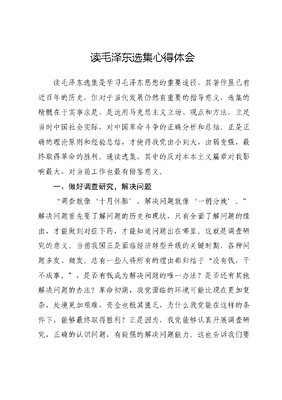 读毛泽东选集心得体会读毛泽东选集是学习毛泽东思想的重要途径,其著作虽已有近百年的历史,但对于当代发展仍然有重要的指导意义,选集的精髓在于实事求是,是运用马克思主义立场、观点和方法,立足当时中国社会实际,对中国革命斗争的正确分析和总结。正是正确的理论原则和经验总结,才使得我党由小到大,由弱变强,最终取得革命的胜利。通读选集,其中的反对本本主义篇章对我影响最大,对当前工作也最有借鉴意义。一、做好调查研究,解决问题调查就像十月怀胎,解决问题就像一朝分娩。解决问题首先要了解问题的历史和现状,只有全面了解问题的缘由,才能做到对症下药,才能知道问题出在哪里。这就是调查研究的意义。当前我国正是面临经济转型升级的关键时期,各种问题多发、频发。总有一些人将所有的理由都归结于没有钱,干不成事。,是否有钱成为解决问题的唯一办法?是否还有其他解决问题的办法?革命初期,我党面临的环境可能比现在更加复杂,处境更加艰难,资金也极其匮乏,为什么我党能在这样的条件下,能够最终取得胜利?正是因为,我党能够认真开展调查研究,正确的认识问题,有较强的解决问题能力。这也告诉我们要解决工作中的问题,首先要做好调查研究,认清问题来源,弄明白现状,立足实际,考虑有什么样的条件,解决目前的问题。二、反对本本主义,注重实际为什么反对本本主义?因为本本主义的危害极大,我党初期革命斗争的失利,在于盛行本本主义,照搬马克思主义思想、俄国十月革命的成功做法,这种脱离中国实际的做法,让我党付出惨重的代价。我们所反对的本本主义,实际上是反对脱离实际情况的本本主义。我们需要本本,本本为我们提供理论指导,但必须与实际情况相结合,在实践中证明对的才是我们需要的本本。毛泽东思想的成功就是最好的例子,为什么说它是中国化的第一次历史性飞跃?正因为其运用马克思主义思想,结合中国实际情况,正确的分析、解决当时中国革命的现实问题,是马克思主义中国化的第一次成功运用。因此,只有立足实际,才能避免本本主义,真正了解国情、评估各阶级相互关系制定正确的政策,才能深入群众,争取群众的支持。我们在工作中,特别是制定地方方案、政策时,要认真调研本地实际情况,结合实情制定政策,才能避免出现政策打架、落实困难、群众不服的情况。三、提高决策能力,与时俱进文可居文库——海量学习资料,手机电脑均可下载www.wenkeju.com在经济下行压力增大,矛盾日益走向尖锐的形势下,更考验着我们领导干部的决策能力。在《反对本本主义》一文中,毛泽东就指出:共产党的正确而不动摇的斗争策略,绝不是少数人坐在房子里能都产生的,他是要在群众的斗争过程中才能产生的这就是说要在实际经验中才能产生。因此,我们需要时时了解社会情况,时时进行实际调查。这告诉我们不能一成不变,要不断学习正确的理论知识,学习成功经验,更要有独立思考的能力经常进行调查研究,了解实际情况,做到与时俱进,作出正确的决策。四、总结调查方法,做好调研总结《反对本本主义》文中的调研方法,主要是开调查会作讨论式的调查、组织有经验的人参与调查会、开调研会的人员不少于三人、确定调查纲目、要亲自调查、要深入调查、要自己做好记录。同时,做调查研究时也要学习借鉴陈云提出的调查研究十五字决不唯上、不唯书、只唯实,交换、比较、反复。整体上来说,就是要做到了解实情,全面认识问题,认真比较利害关系,反复论证决策正确性。读了这本书后,使我对中国革命有了更加深刻的认识,更深深地体会到共产党建立新中国的伟大,那真是用千百万烈士的鲜文可居文库——海量学习资料,手机电脑均可下载www.wenkeju.com血换来的新中国,是那些革命的先驱用他们的智慧、他们的意志他们大无畏的勇气建立了一个新中国,从而也知道了他们为什么伟大。这本书表现的就是中国革命史最重要的一段。历史造就了英雄,英雄也创造了历史,艰难困苦玉汝于成。文可居文库——海量学习资料,手机电脑均可下载www.wenkeju.com