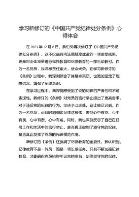 学习新修订的《中国共产党纪律处分条例》心得体会在2023年12月8日,我们党再次修订了《中国共产党纪律处分条例》,这不仅是党内法规制度建设的一项重要成果,更是对全体党员进行党性教育和纪律教育的一部生动教材。作为一名党员,我深感责任重大,使命光荣。在学习新修订的《条例》过程中,我深刻领会了其精神实质,也更加坚定了理想信念,增强了纪律意识。在学习过程中,我深刻感受到了党的纪律的严肃性和不可违逆性。新修订的《条例》对党员的言行举止提出了更高要求,对于违反党的纪律的行为,坚决予以惩处。这让我认识到,作为一名党员,必须时刻绷紧纪律这根弦,做到心中有党、心中有民、心中有责、心中有戒。同时,我也深刻反思了自己在日常工作和生活中的言行举止,是否真正做到了遵守党的纪律,是否真正发挥了党员的先锋模范作用。新修订的《条例》还强调了纪律教育的重要性。我认识到,纪律教育不是一阵风,而是一项长期任务。只有不断加强纪律教育,才能确保党员始终牢记党的宗旨,始终坚守党的纪律。因此,我将积极参与党组织的纪律教育活动,认真学习党的纪律知识,不断提高自己的党性修养和纪律意识。此外,新修订的《条例》还体现了与时俱进的精神。随着时代的发展和社会的进步,党的纪律也在不断完善和发展。新修订的《条例》根据新的形势和任务,对党的纪律进行了适时的调整和完善,使之更加符合实际、更加科学有效。这体现了我们党在纪律建设上的创新精神和实践智慧。通过这次学习,我更加明白了作为一名党员的责任和担当。我将以新修订的《条例》为镜子,时刻对照自己的行为,确保不越雷池一步。同时,我也将积极发挥党员的示范引领作用,带动身边的同事和朋友一起遵守党的纪律,共同营造风清气正的良好氛围。展望未来,我将继续深入学习党的纪律知识,不断提高自己的党性修养和纪律意识。我将以更加饱满的热情和更加坚定的信念,投身于党和人民的事业中,为实现中华民族伟大复兴的中国梦贡献自己的力量。在学习新修订的《中国共产党纪律处分条例》的过程中,我深刻体会到了党的纪律的严肃性和权威性,也更加坚定了自己的信仰和追求。我深知,作为一名党员,必须时刻保持清醒的头脑,坚守党的纪律和规矩,做到言行一致、表里如一。同文可居文库——海量学习资料,手机电脑均可下载www.wenkeju.com时,我也将积极发挥党员的先锋模范作用,以实际行动践行党的宗旨和理念,为党和人民的事业贡献自己的力量。我将从以下几个方面做起:一是加强学习,不断提高自己的政治素质和理论水平,确保在思想上与党中央保持高度一致;二是严格遵守党的纪律和规矩,做到心中有党、心中有民、心中有责、心中有戒;三是积极参与党组织的各项活动,发挥自己的特长和优势,为党组织的建设和发展贡献自己的力量;四是加强自我监督和自我管理,时刻保持清醒的头脑和坚定的信念,确保自己的言行符合党的纪律和规矩。总之,学习新修订的《中国共产党纪律处分条例》是一次深刻的思想洗礼和党性锻炼。我将以这次学习为契机,不断加强自己的党性修养和纪律意识,以更加饱满的热情和更加坚定的信念,投身于党和人民的事业中,为实现中华民族伟大复兴的中国梦贡献自己的力量。在具体实践中,我将注重将学习成果转化为工作动力和实际成效。我将以更加严谨的态度对待工作,以更加高效的方式完成任务,以更加优质的服务回报党和人民的信任。同时,我也将积极关注社会热点和难点问题,深入调研和思考,提出有针对性的建议和措施,为党和政府决策提供参考和依据。文可居文库——海量学习资料,手机电脑均可下载www.wenkeju.com此外,我还将注重加强与其他党员的交流和合作。我将积极参与党组织的讨论和交流活动,分享自己的学习心得和实践经验,听取他人的意见和建议,共同推动党组织的建设和发展。我相信,在全体党员的共同努力下,我们一定能够形成更加紧密团结、更加奋发有为的集体,为党和人民的事业作出更大的贡献。通过这次学习,我更加深刻地认识到了党的纪律的重要性,也更加坚定了自己的信仰和追求。我将以更加饱满的热情和更加坚定的信念,继续深入学习党的理论和路线方针政策,不断提高自己的政治素质和业务能力,为党和人民的事业贡献自己的力量。同时,我也将积极发挥党员的示范引领作用,带动身边的同事和朋友一起遵守党的纪律和规矩,共同营造风清气正的良好政治生态。文可居文库——海量学习资料,手机电脑均可下载www.wenkeju.com
