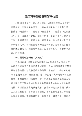 政工干部培训班交流心得5月30日至6月4日,总队联合xx师范大学举办了年轻干部培训班。为期五天的学习,让我在云师大的大熔炉里,接受了精神洗礼、饱尝了理论盛宴、感受了实践魅力,进一步锤炼了党性、拓展了思路、提高了能力、鼓足了干劲。深刻认识到:青年人兴,则国家兴。作为昭通支队三名参训学员之一,我深感沉甸甸的压力和责任。在云师大各位教授的悉心教导下,我们顺利完成了各项学习任务,回顾整个培训,收获良多。一、思想政治得到大洗礼开班仪式上,xxx主任从提升站位、转换态度、全身心投入培训三方面号召全体学员勇挑重担,为xx消防高质量发展贡献智慧和力量,让我备受鼓舞和鞭策。紧接着xxx教授对党的xx全会精神进行了详细解读,进一步坚定了我对党忠诚的政治自觉、思想自觉和行动自觉,进一步增强了在思想上政治上行动上同以XXX同志为核心的党中央保持高度一致的自觉性和坚定性。要巩固拓展主题教育成果,坚持用好民主集中制,做到人人肩上有担子、个个身上有指标、件件工作有着落。要持续加强能力建设,增强前瞻思维、系统思维、辩证思维、创新思维和底线思维。锚定基层基础,以队伍凝聚力催生新质战斗力。要坚持示范带头,加强思想引导,坚定指战员入消从消、干消爱消的理想信念和工作斗志。要统筹两项建设,出台更多符合队伍实际、激发队伍士气的工作举措。二、工作本领得到大武装此次学习不仅涵盖了经济、政治、文化、科技、党建以及新时代年轻干部应具备的相关业务能力,还有大量的前沿知识,很大程度上缓解了本领恐慌,填补了部分业务空白,对新形势下如何进一步做好各项工作,提升年轻干部政治素质和能力给予了全方位的辅导。通过现场教学,对如何实现个人发展有了更深的理解,进一步增强了自我提升的决心和信心。三、纪律作风得到大建设学习期间,我自觉强化学员意识,坚决服从云师大和总队管理人员的安排,严格遵守各项纪律规矩,抓实抓细每一件小事,并落实到每一次教学活动中。培训期间,我始终以党员的标准严格要求自己,严守各项纪律,不该做的事不做、不该去的地方不去。通过五天的严格自我约束,让我对在本职工作中按纪律来、按规矩办有了更深的体会,对守心者最自由、守纪者最快乐有了更加深刻的理解。文可居文库——海量学习资料,手机电脑均可下载www.wenkeju.com下一步,我将以本次培训为新的起点,将所思所悟转化为日常工作的点滴思路,内化于心、外化于行,以更强的定力、过硬的本领、严实的作风为昭通消防、xx消防贡献出自己的一份力量。一、要把勤学善思贯穿始终事有所成必是学有所成,学有所成必是读有所得。我将自觉把学习当作一种生活态度,一种工作责任,一种精神追求,常思能力不足、常怀本领恐慌、常找学习差距,自觉发扬入山问樵、入水问渔的求知精神,胸怀大局、勤学善思,把本职工作融入昭通消防、xx消防事业大棋局,更加深入、系统、全面、细致研究工作,不断提高自己发现问题、分析问题、解决问题的能力和水平。二、要把求真务实贯穿始终求真务实源自对党和人民群众的忠诚,是共产党人的立身之本和成事之要,更是新时代青年干部必须具备的政治品格。要把工作岗位作为舞台,把自己当作昭通消防、xx消防的主人,带着责任、感情和情怀,以高标准要求认真做好每一件事,把心思和精力全部放在脚踏实地工作上,用在老老实实为人民群众办实事上,不计较得失,甘当螺丝钉,甘做铺路石,甘为孺子牛。文可居文库——海量学习资料,手机电脑均可下载www.wenkeju.com三、要把廉洁自律贯穿始终心有所畏才能做到言有所戒、行有所止。我将自觉把党规党纪和法律法规当作戒尺置于心间,敬畏法律、敬畏纪律,敬畏组织、敬畏群众,坚守底线、不越红线、不触高压线。不断强化自律锻练,坚持学习与健身相结合,做到体育锻练生活化,生活方式健康化,进一步强健体魄、丰富生活、振奋精神,始终以身心愉悦的状态干好工作、幸福生活。文可居文库——海量学习资料,手机电脑均可下载www.wenkeju.com
