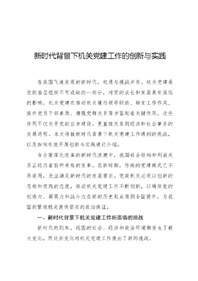 新时代背景下机关党建工作的创新与实践在我国飞速发展的新时代,机遇与挑战并存。机关党建是党的基层组织不可或缺的一部分,对党的成长和发展具有深远的影响。机关党建在推动机关履行领导职能、转变工作作风、提升党员干部素质、增强党群关系等方面起着关键作用,这些作用不仅关乎党的自身建设,更直接关系到经济和社会事务的发展进程。本文将就新时代背景下机关党建工作遇到的挑战,以及如何有效开展创新与实践进行介绍。在全面深化改革的新时代浪潮中,我国社会结构和利益关系正经历着前所未有的变革。在新时期,传统的党建模式已不再适用,无法满足新时代的发展需求。党政机关必须以创新的思维和实践的态度,推动机关党建工作不断创新,以确保党的创造力、凝聚力和战斗力在新的历史起点得到全面提升,为我国的繁荣稳定提供坚实的政治保证。一、新时代背景下机关党建工作所面临的挑战新时代的到来,我国的社会、经济和政治环境都发生了极大变化,而这些变化对机关党建工作提出了新的挑战。(一)社会结构和利益关系的复杂化在经济、政治、文化和社会结构等多个方面的改革中,不同的利益群体之间出现了越来越多的冲突和矛盾。这对党建工作是个大考验,不仅需要想方设法整合各种社会资源、协调多方的利益关系,还要努力维护社会稳定与安宁。(二)信息技术发展与舆论环境的挑战信息技术的快速发展和广泛应用,使网络信息的传播渠道增加,舆论环境变得复杂。网络舆论的匿名性、交互性和即时性等特点,使得一些错误思潮和负面信息在网络空间中迅速传播,对机关党建工作的舆论引导能力构成了极大挑战。(三)全面从严治党的新要求从严治党不仅要求机关党组织严明党的纪律,还要求机关党组织在推动党的建设中发挥示范带头作用,这对机关党建工作的组织能力、创新能力和实践能力都形成极大挑战。(四)群众期望与要求的提升我国人民对党的执政能力、领导能力和党风廉政建设等多个方面提出了更高的要求。机关党建工作需要密切联系群众,提高服务群众的能力和水平,以满足人民群众对党的期望和要求。二、新时代背景下机关党建工作创新与实践路径文可居文库——海量学习资料,手机电脑均可下载www.wenkeju.com(一)创新党建工作理念在新时代背景下,机关党建工作需要更新理念,强调服务意识和责任担当,注重创新性和实效性,强化全局意识和系统思维,坚持问题导向和改革精神。通过有效创新,可以更好地整合党建资源,加强党员队伍建设,推动机关党建工作与业务工作深度融合,为全面建设社会主义现代化国家提供坚强保证,同时还要注重实践探索,不断总结经验教训,不断完善和创新机关党建工作的方式和方法。(二)运行信息化技术在新时代,信息化技术已成为推动机关党建工作创新与实践的重要工具。机关党组织应积极探索和运用现代信息技术手段,运用大数据、云计算、人工智能等来提升党建工作的效率和影响力,也可以建立党建信息平台,实现党员信息的数字化管理;利用社交媒体和网络平台,加强党员之间的互动与交流,扩大党建工作的覆盖面和影响力;通过数据分析了解党员的需求和动态,为党建工作提供科学依据。通过信息化技术的运用,机关党建工作能够更加高效、精准地服务于党员和群众,可以有效推动党的建设。(三)深化党建实践探索目前,深化党建实践与探索是推动机关党建工作创新与实文可居文库——海量学习资料,手机电脑均可下载www.wenkeju.com践的关键环节。机关党组织应紧密联系实际,创设主题党日、志愿服务、学习研讨等多样化的党建活动,以增强党员的党性修养和组织观念;鼓励党员积极参与社会实践,将党的建设与事业发展紧密结合起来,以实际行动践行党的宗旨;注重实践经验的总结,便于及时推广好的做法和经验,用以不断提升机关党建工作的质量和水平。通过深化党建实践与探索,将更好地推动机关党建工作,为全面建设社会主义现代化国家提供有力支撑。(四)加强党建队伍建设加强党建队伍建设是推动机关党建工作创新与实践的重要保障。机关党组织应高度重视党建队伍的建设,选拔政治素质高、业务能力强、作风正派的党员干部充实到党建工作中来;加强对党建队伍的培训和教育,提高大家的政治理论水平、业务能力和综合素质,使其能够更好地履行职责,推动机关党建工作开展,并不断取得新成效;建立健全激励机制,激发党建队伍的工作热情和创造力,为机关党建工作的创新与发展提供强大的人才保障。结束语:总之,新时代背景下机关党建工作正面临着一系列挑战。为应对这些挑战,需要更新党建理念,确保党建工作与时代发展同步;运用信息化手段,提升党建工作的效率和影文可居文库——海量学习资料,手机电脑均可下载www.wenkeju.com响力;深化党建实践探索,确保党的建设与事业发展相互促进;加强党建队伍建设,为机关党建工作提供坚实的人才支撑。为实现中华民族伟大复兴的中国梦提供坚实的政治保障。文可居文