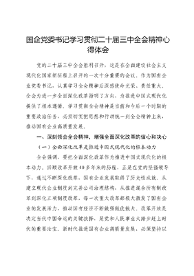国企党委书记学习贯彻二十届三中全会精神心得体会党的二十届三中全会胜利召开,这是在全面建设社会主义现代化国家新征程上召开的一次十分重要的会议。作为国有企业党委书记,认真学习全会精神后深感使命光荣、责任重大。全会为进一步全面深化改革指明了方向,为推进中国式现代化提供了根本遵循。学习贯彻全会精神是当前和今后一个时期的重要政治任务,必须切实把思想和行动统一到全会精神上来,推动国有企业高质量发展。一、深刻领会全会精神,增强全面深化改革的信心和决心(一)全面深化改革是推进中国式现代化的根本动力全会强调,要把全面深化改革作为推进中国式现代化的根本动力。回顾改革开放40多年来的历程,正是在党的坚强领导下,通过不断深化改革,国有企业发展取得了历史性成就。从建立现代企业制度到完善公司治理结构,从推进混合所有制改革到深化三项制度改革,每一次重大改革都极大激发了国有企业的发展活力,推动国有经济不断做强做优做大。改革开放是决定当代中国命运的关键抉择,是党和人民事业大踏步赶上时代的重要法宝。新时代推进国有企业高质量发展,必须坚持以改革创新精神全面深化改革,破除体制机制障碍,激发企业发展新动能。(二)坚持党的领导是改革取得成功的关键全会强调,要把党的领导贯穿改革各方面全过程。坚持和加强党的全面领导是国有企业改革发展的根本保证。在推进国企改革过程中,必须始终坚持党的领导,发挥党委把方向、管大局、促落实的领导作