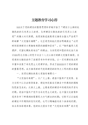 主题教育学习心得XXX关于党的建设的重要思想科学地回答了建设什么样的长期执政的马克思主义政党、怎样建设长期执政的马克思主义政党的重大时代课题,其现实路径就是通过推进全面从严治党不断破解大党独有难题。这正是党的XX大报告明确提出必须时刻保持解决大党独有难题的清醒和坚定,以始终赢得人民拥护、巩固长期执政地位的缘由。为实现党和国家的长治久安以XXX同志为核心的党中央自十八大以来对破解大党独有难题、实现党的长期执政作了深邃思考和科学回答,以一系列原创性成果丰富和发展了马克思主义党建学说,形成了XXXXXX关于党的建设的重要思想,成为推进新时代党的建设新的伟大工程的根本遵循一、实现长期执政是大党独有难题之一大党独有难题,从广义上看,是指中国共产党发展、壮大过程中以及在领导革命、建设和改革各项事业中所遇到的困难险阻甚至危机;从狭义上看,主要是党的建设中所遇到的矛盾与问题,是指中国共产党作为马克思主义政党,在中国文化背景和现实条件下所遇到的需要花大力气解决的问题;它既可以泛指党的建设中所遇到的任何问题,也可以明确指向某个具体的问题。结合具体语境来看,党的XX大报告中把大党独有难题放在党的建设部分来讲,将其与巩固长期执政地位联系在一起,显然是指党的建设方面所遇到的难题。在二十届中央纪委二次全会上,XXX明确列举出诸多难题:如何始终不忘初心、牢记使命,如何始终统一思想、统一意志、统一行动,如何始终具备强大的执政能力和领导水平,如何始终保持干事创业精神状态,如何始终能够及时发现和解决自身存在的问题,如何始终保持风清气正的政治生态,都是我们这个大党必须解决的独有难题。这些难题是对党的问题的高度概括与集中反映,是典型的大党独有难题,是需要通过加强党的建设来解决的,而破解这些难题的目的是实现党的长期执政。实现长期执政既是考验,也是使命,同时还是中国共产党所面临的独有难题之一。中国共产党对实现长期执政有着长久的思考。早在延安时期,以毛泽东为主要代表的共产党人就开始探索跳出历史周期率的答案,提出了民主新路的对策;在改革开放条件下,以邓小平同志为主要代表的中国共产党人将关乎执政党生死存亡问题聚焦到以反腐败为核心的党风问题上来;在市场经济环境下,以江泽民同志为主要代表的中国共产党人和以胡锦涛同志为主要代表的中国共产党人明确提出长期执政,并充分注意到党在长期执政条件下所面临的严峻挑战和考验。进入新时代,以XXX同志为主要代表的中国共产党人拓展了长期执政的内涵与意义,不仅指明了中国共产党已经是长期执政的马克思主义政党,也指明了长期执政对党的考验的实然状况,更指明了要实现党长期执政的应然状况。其一,长期执政是中国共产党的历史方位。中国共产党已经是一个长期执政的党,走过了百年光辉历程,拥有9800多万党员,在一个社会主义大国执政70多年,是世界上最大的执政党、最大的马克思主义执政党,得到了中国人民最广泛的支持和拥护。大国大党、长期执政、深得人民认同,这是党的政治定位,构成了中国国情的最大特点。因此,巩固党的长期执政地位,不仅关乎党的命运,而且关乎国家命运、人民命运、民族命运。其二,长期执政是党要经受住的一种考验。这种考验表现为两个方面:一是长期执政本身,考验着党会不会与能不能;二是社会变革及环境变迁,考验着党能否适应与如何应对。更要注意的是,承平日久怠惰乃生,党内不可避免地会出现损害纯洁性与弱化先进性、违背初心使命与动摇执政根基的各种问题。这些问题无时不有无处不在,长期而复杂、尖锐而严峻,考验着党的精神意志作风形象、执政能力和领导水平等,逐步积淀成大党独有难题中的各种具体问题,如最难是初心不改、最大风险是内部变色变质变味、最大危险是脱离群众、最大挑战是对权力的监督、最大威胁是腐败等,这些难题实质上就是长期执政条件下所面临的挑战和风险。其三,实现长期执政是新形势之下的新使命。历史和现实都已表明,一场伟大的社会革命是需要一个漫长的历史过程的。邓小平指出,社会主义制度的巩固和发展,是需要一个很长的历史阶段的,是需要几代人、十几代人,甚至几十代人坚持不懈地努力奋斗才能实现的。党和人民的事业是没有止境的。XXX指出,要把中国特色社会主义建设好、建设成,需要一个很长的历史时期,要按千年来计算。在这个漫长历史进程中,确保中国共产党不垮、中国社会主义制度不倒,是一个极难极大的风险挑战。〔10〕这就要求中国共产党必须回答好、解决好一个根本性问题,即如何永葆党的先进性和纯洁性、青春活力以永远得到人民拥护和支持,从而实现党长期执政?这对中国共产党来说是一个严峻的挑战,也是实现党的长期执政必须解决的难题。二、构建全面从严治党体系,破解建设长期执政的马克思主义政党难题党的十八大以来所推进的全面从严治党战略,是新时代条件下党的建